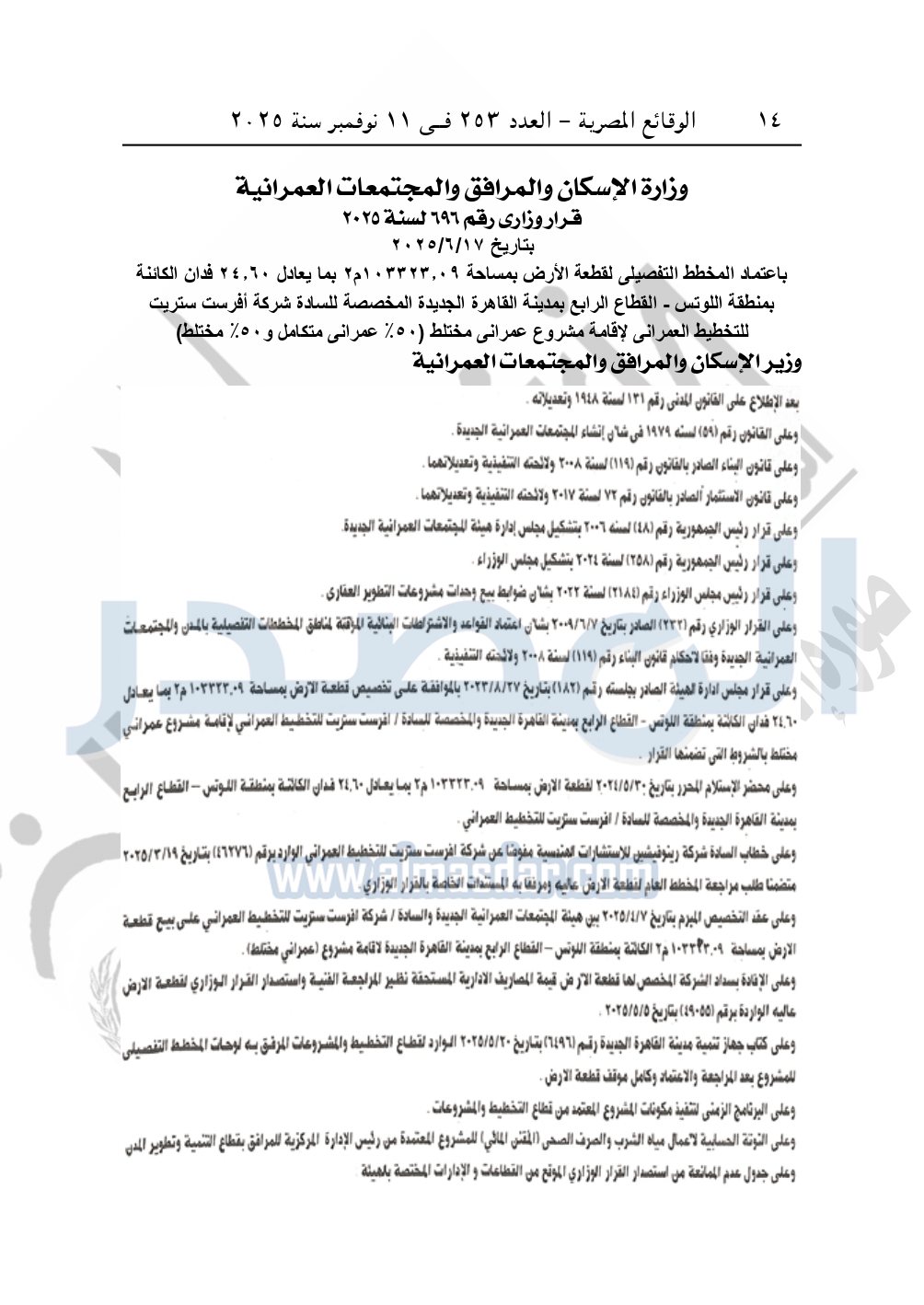 نشرت الوقائع المصرية، في العدد 253، الصادر في 11 نوفمبر سنة 2025، قرار وزارة الإسكان والمرافق والمجتمعات العمرانية، قرار وزاري رقم 696 لسنة 2025 بتاريخ 17-6-2025، بشأن اعتماد المخطط التفصيلى لقطعة الأرض بمساحة 103323.09م2 بما يعادل 24.60 فدان الكائنة بمنطقة اللوتس - القطاع الرابع بمدينة القاهرة الجديدة المخصصة لـ شركة أفرست ستريت للتخطيط العمراني لإقامة مشروع عمرانی مختلط "50% عمراني متكامل و50% مختلط".