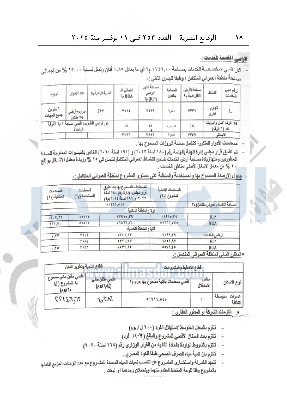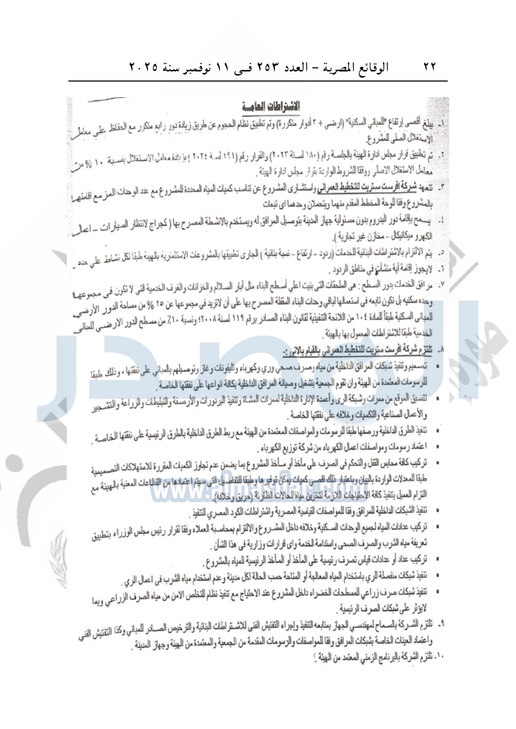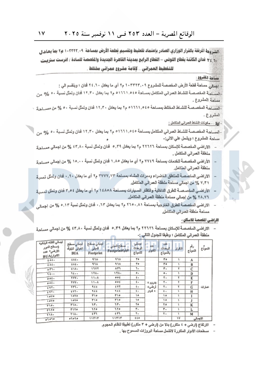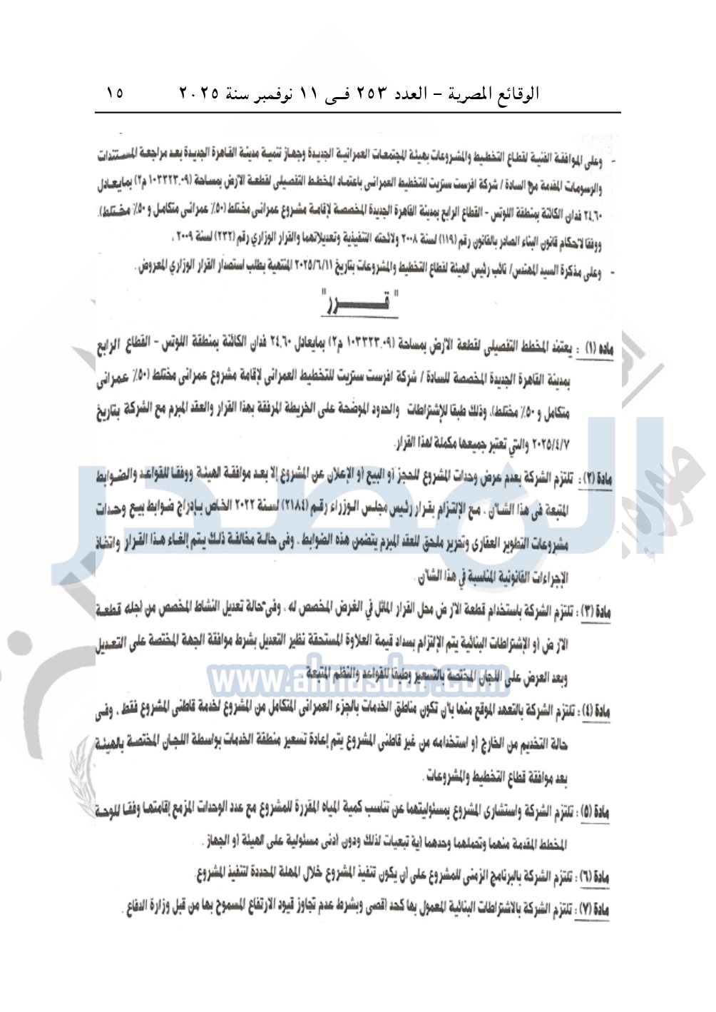 يعتمد المخطط التفصيلى لقطعة الأرض بمساحة 103323.09م2 بما يعادل 24.60 فدان الكائنة بمنطقة اللوتس - القطاع الرابع بمدينة القاهرة الجديدة المخصصة لـ شركة أفرست ستريت للتخطيط العمراني لإقامة مشروع عمرانی مختلط "50% عمراني متكامل و50% مختلط"، وذلك طبقا للإشتراطات والحدود الموضحة على الخريطة المرفقة بهذا القرار والعقد المبرم مع الشركة بتاريخ 7-4-2025 والتي تعتبر جميعها مكملة لهذا القرار.