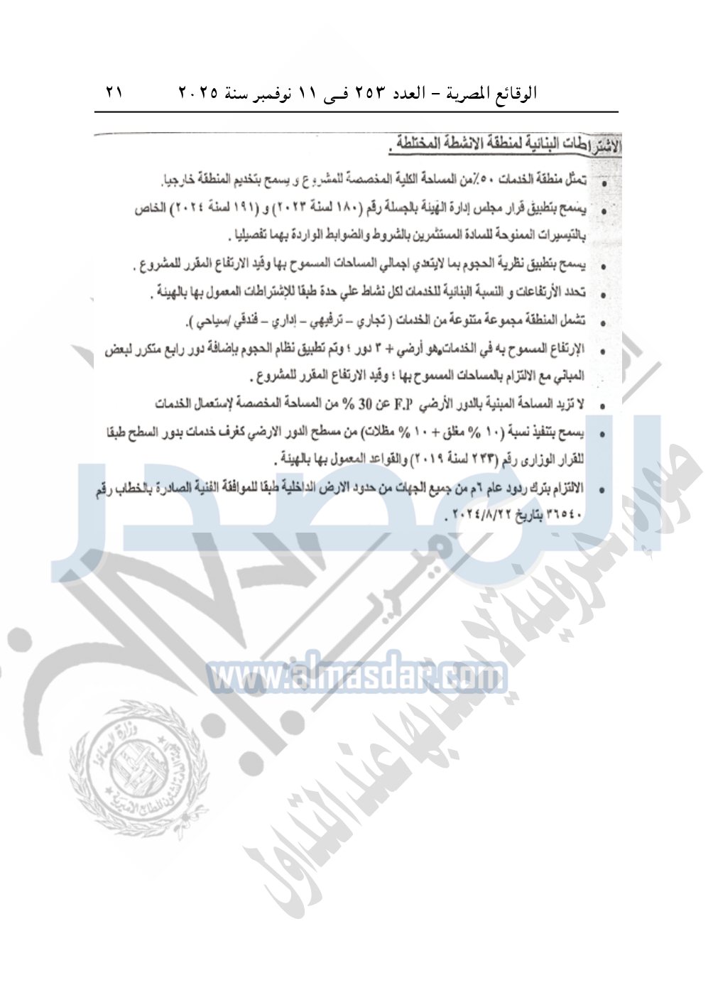 تلتزم الشركة بالتعهد الموقع منها بأن تكون مناطق الخدمات بالجزء العمراني المتكامل من المشروع لخدمة قاطني المشروع فقط ، وفي حالة التخديم من الخارج أو استخدامه من غير قاطنى المشروع يتم إعادة تسعير منطقة الخدمات بواسطة اللجان المختصة بالهيئة بعد موافقة قطاع التخطيط والمشروعات.