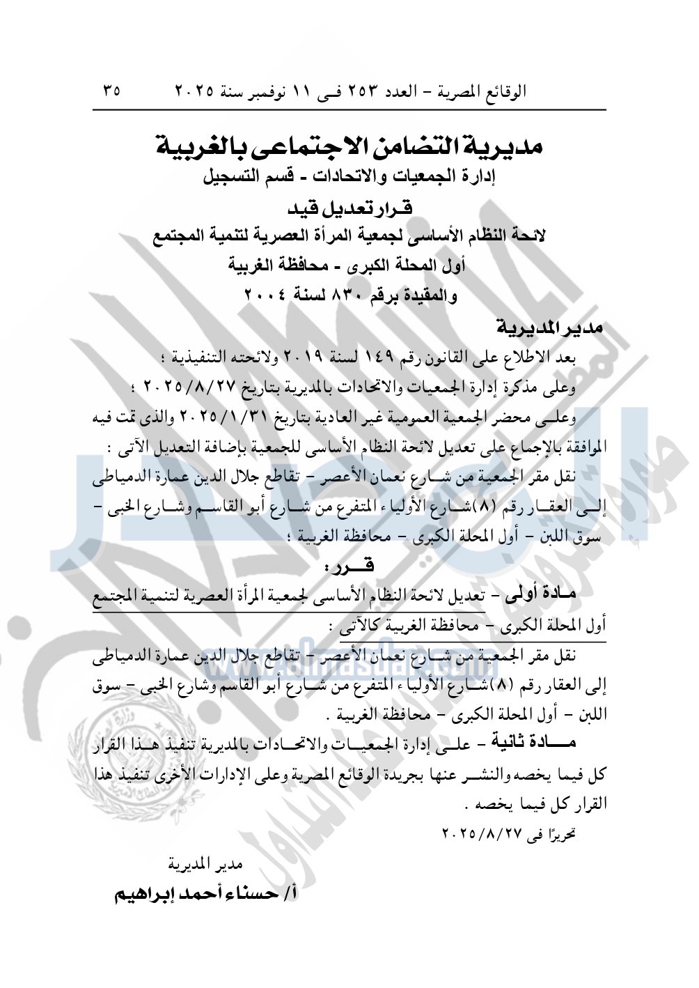 نشرت الوقائع المصرية في العدد 253، بتاريخ 11 نوفمبر 2025، قرار مديرية التضامن الاجتماعي بالغربية، قرار تعديل رقم 830 لسنة 2004، بشأن تعديل قيد جمعية المرأة العصرية لتنمية المجتمع – أول المحلة الكبرى - محافظة الغربية.