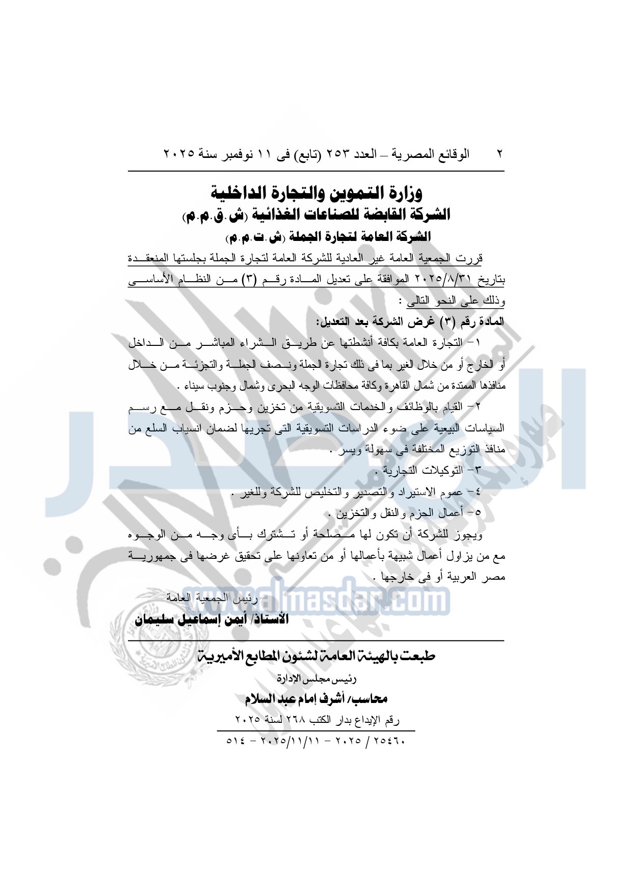 نشرت الوقائع المصرية في العدد 253 "تابع"، بتاريخ 11 نوفمبر 2025، قرار وزارة التموين والتجارة الداخلية، الشركة القابضة للصناعات الغذائية "ش. ق.م.م"، الشركة العامة لتجارة الجملة "ش.ت.م.م"، بشأن تعديل المادة الثالثة من النظام الأساسي للشركة العامة لتجارة الجملة.