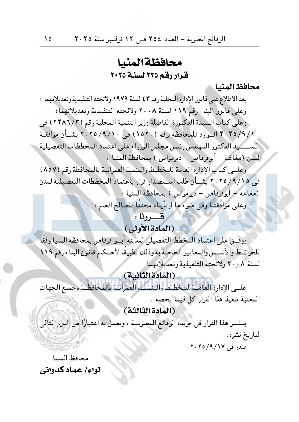 نشرت الوقائع المصرية في العدد 254 الصادر في 12 نوفمبر سنة 2025، محافظة المنيا، قرار رقم 235 لسنة 2025، بشأن الموافقة على اعتماد المخطط التفصيلى لمدينة أبو قرقاص بمحافظة المنيا.