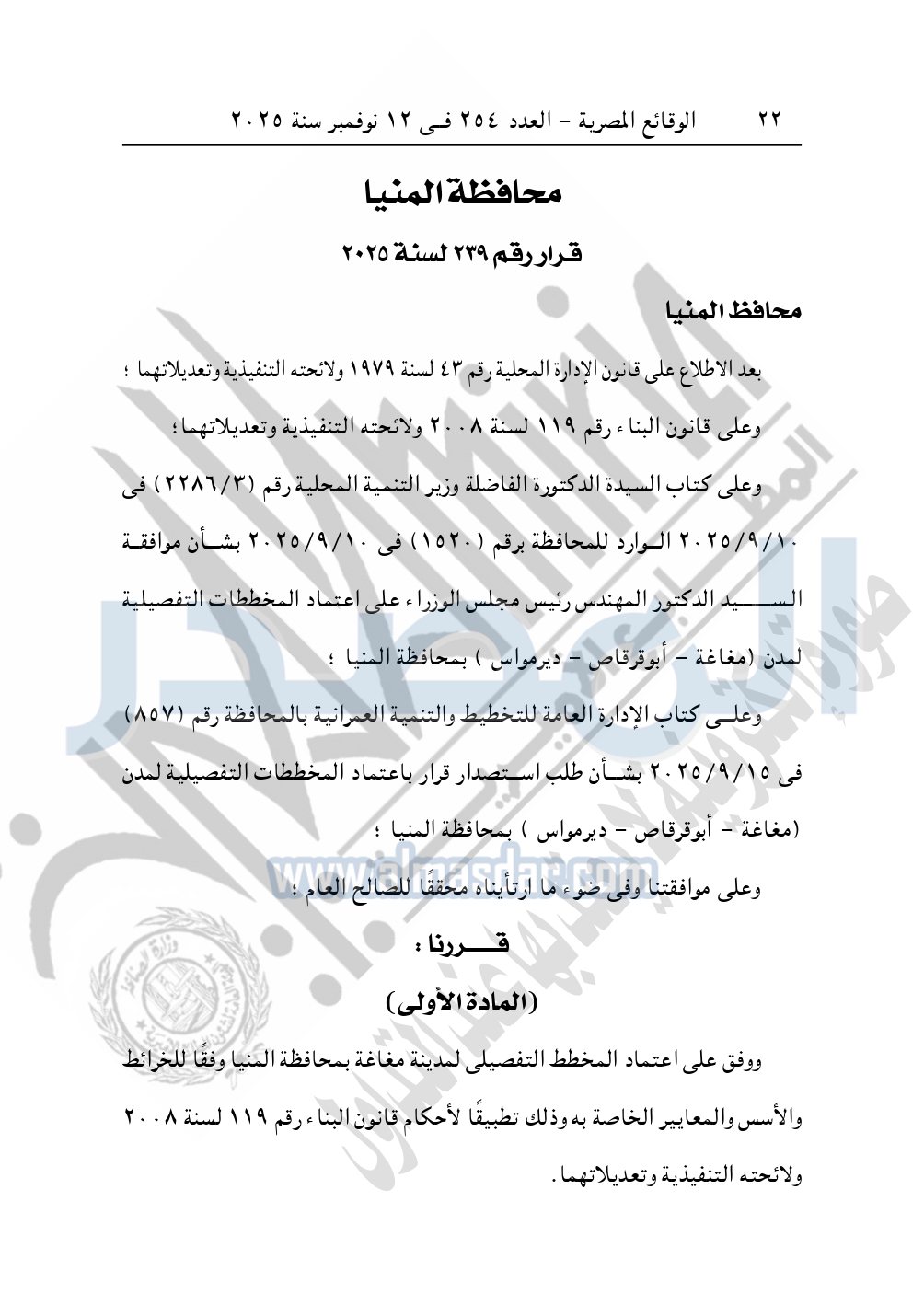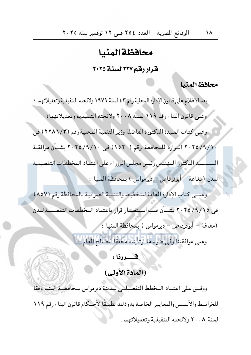 كما نشرت الوقائع المصرية في العدد 254 الصادر في 12 نوفمبر سنة 2025، محافظة المنيا، قرار رقم 237 لسنة 2025، بشأن الموافقة على اعتماد المخطط التفصيلى لمدينة ديرمواس بمحافظة المنيا