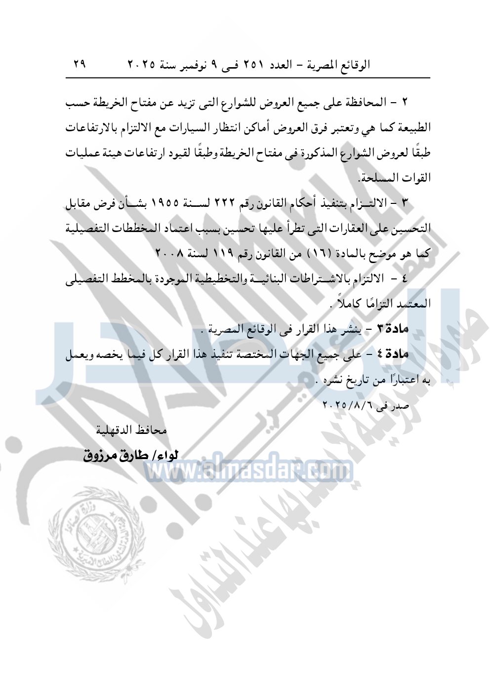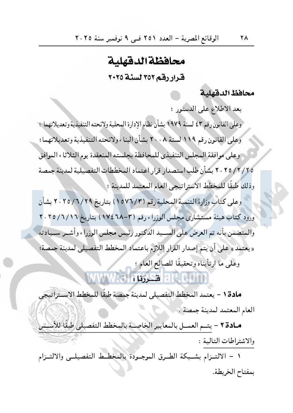 ونشرت الوقائع المصرية في العدد 251 الصادر في 9 نوفمبر سنة 2025، محافظة الدقهلية، قرار رقم 352 لسنة 2025، بشأن اعتماد المخطط التفصيلى لمدينة جمصة بمحافظة الدقهلية.