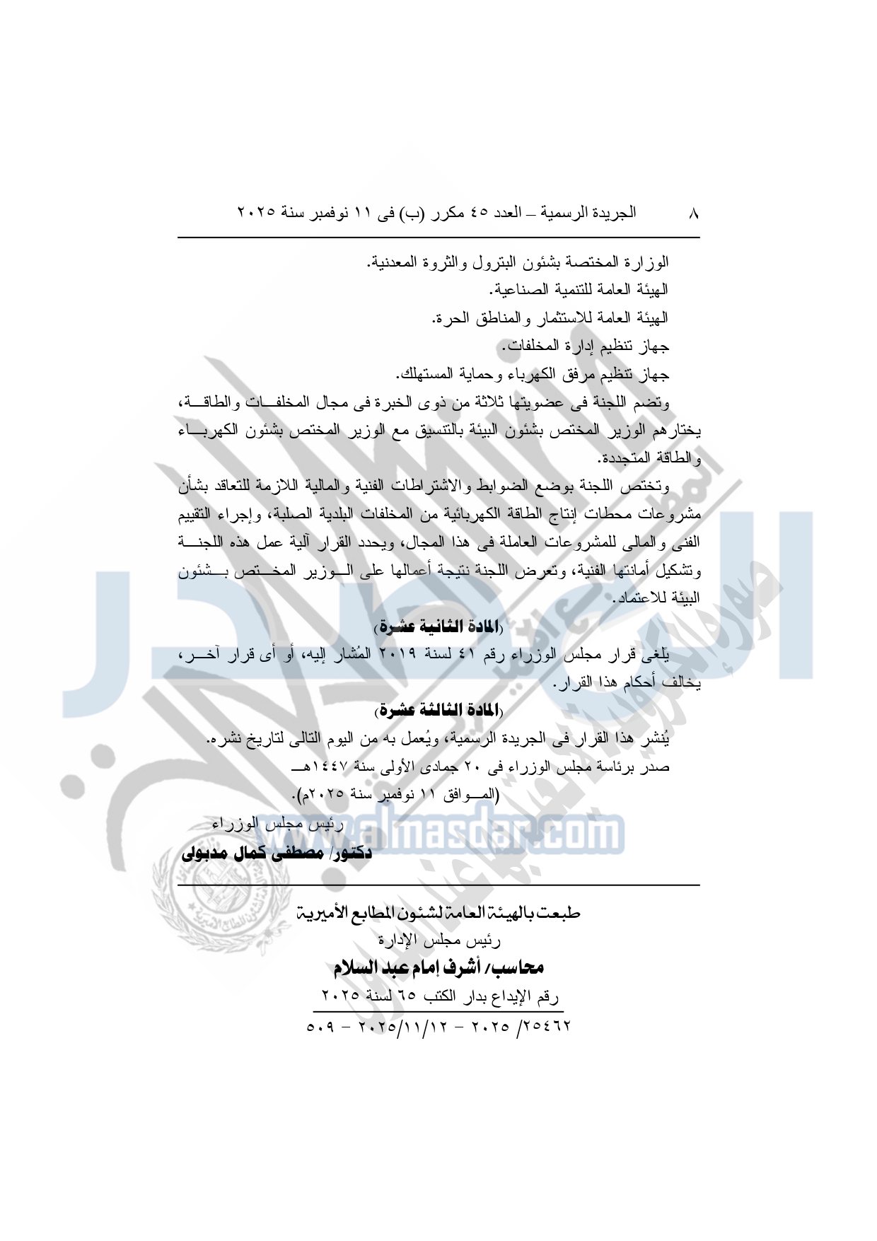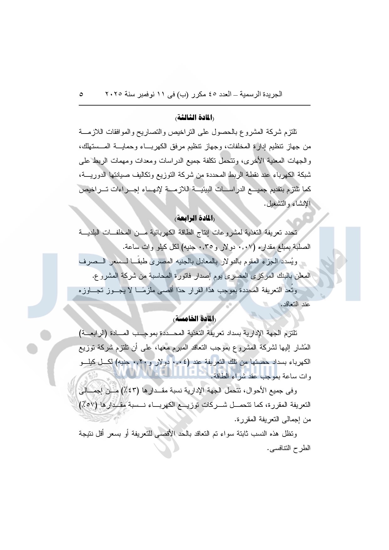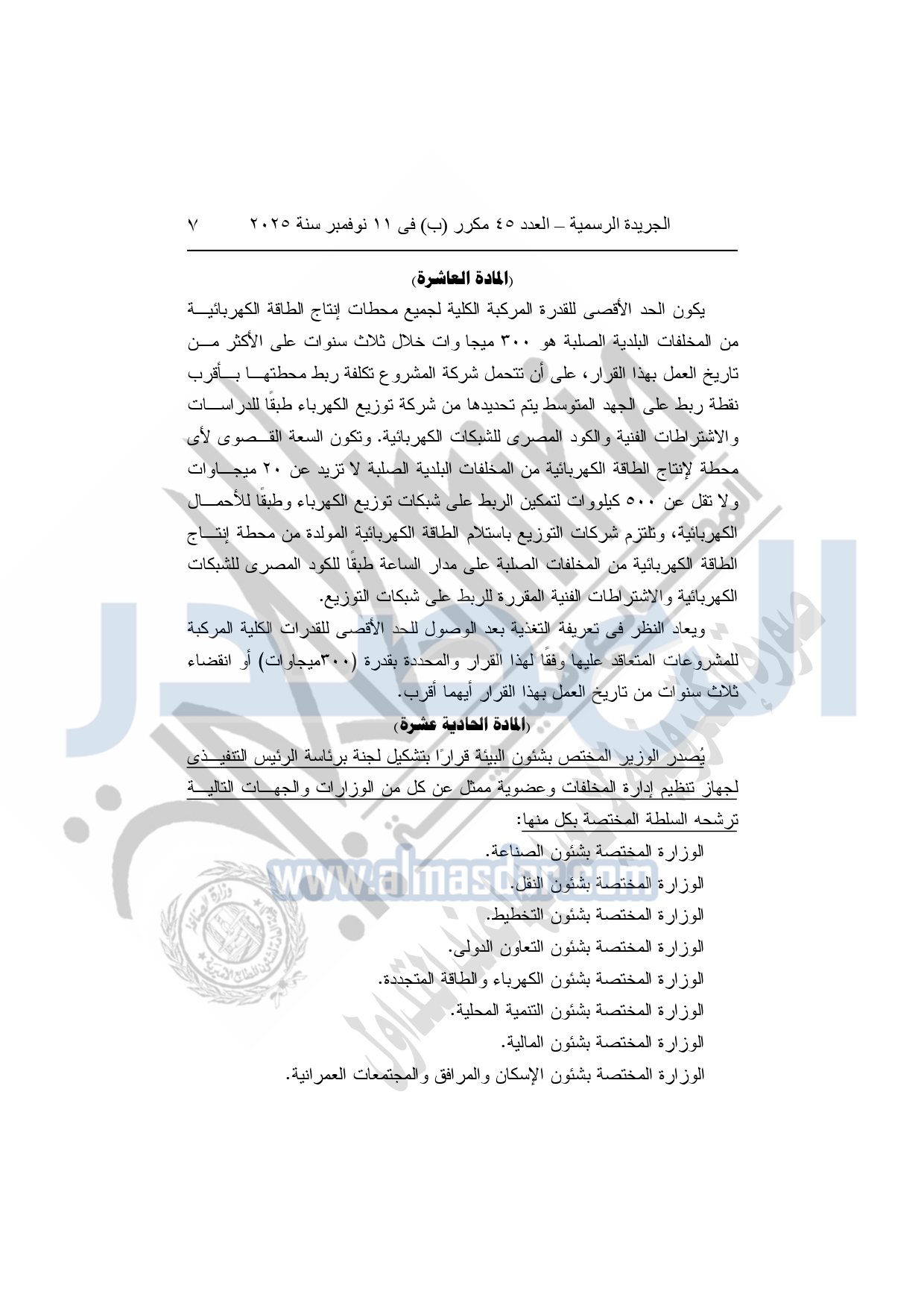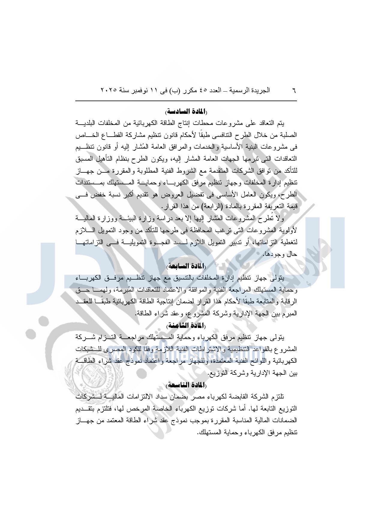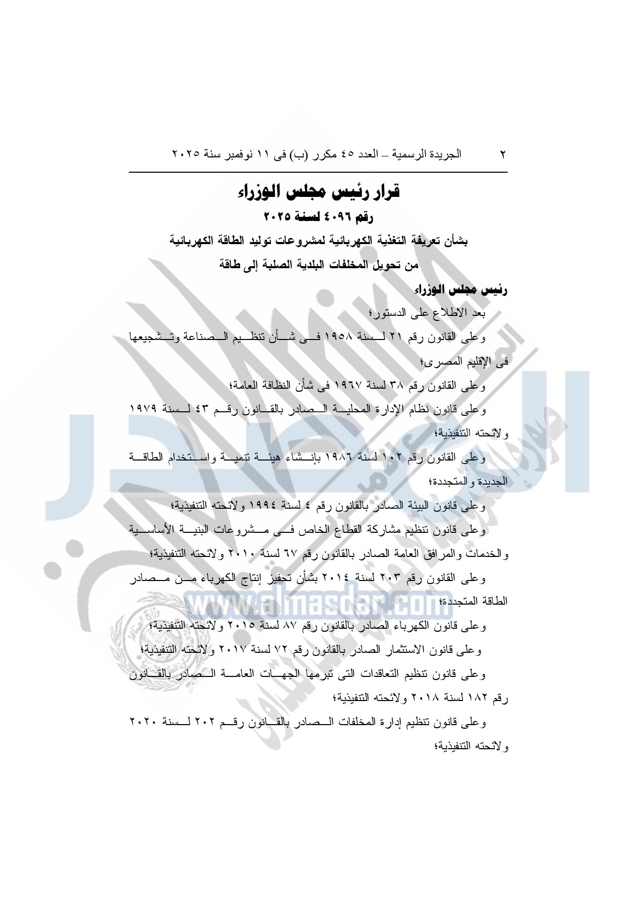 نشرت الجريدة الرسمية في العدد 45 مكرر "ب"، بتاريخ 11 نوفمبر 2025، قرار رئيس مجلس الوزراء، بشأن تعريفة التغذية الكهربائية لمشروعات توليد الطاقة الكهربائية من تحويل المخلفات البلدية الصلبة إلى طاقة.