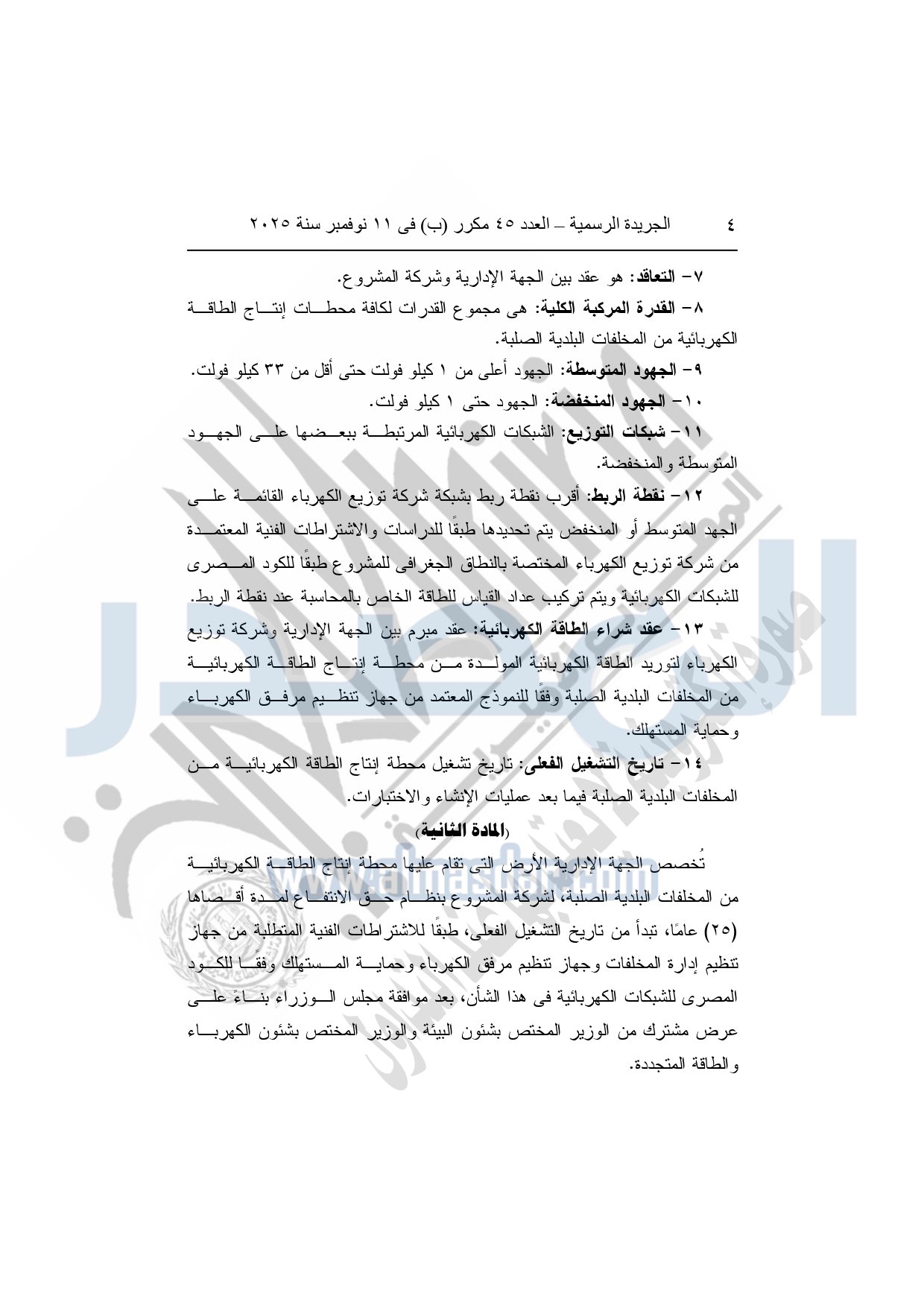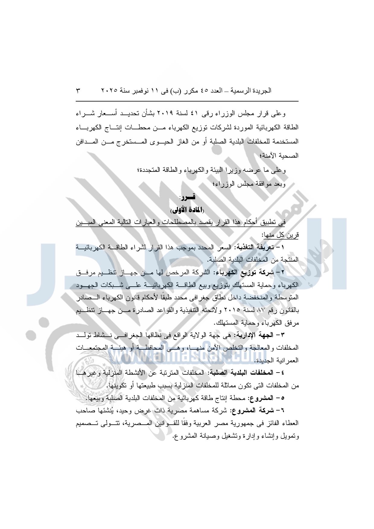 1- تعريفة التغذية: السعر المحدد بموجب هذا القرار لشراء الطاقة الكهربائية المنتجة من المخلفات البلدية الصلبة.