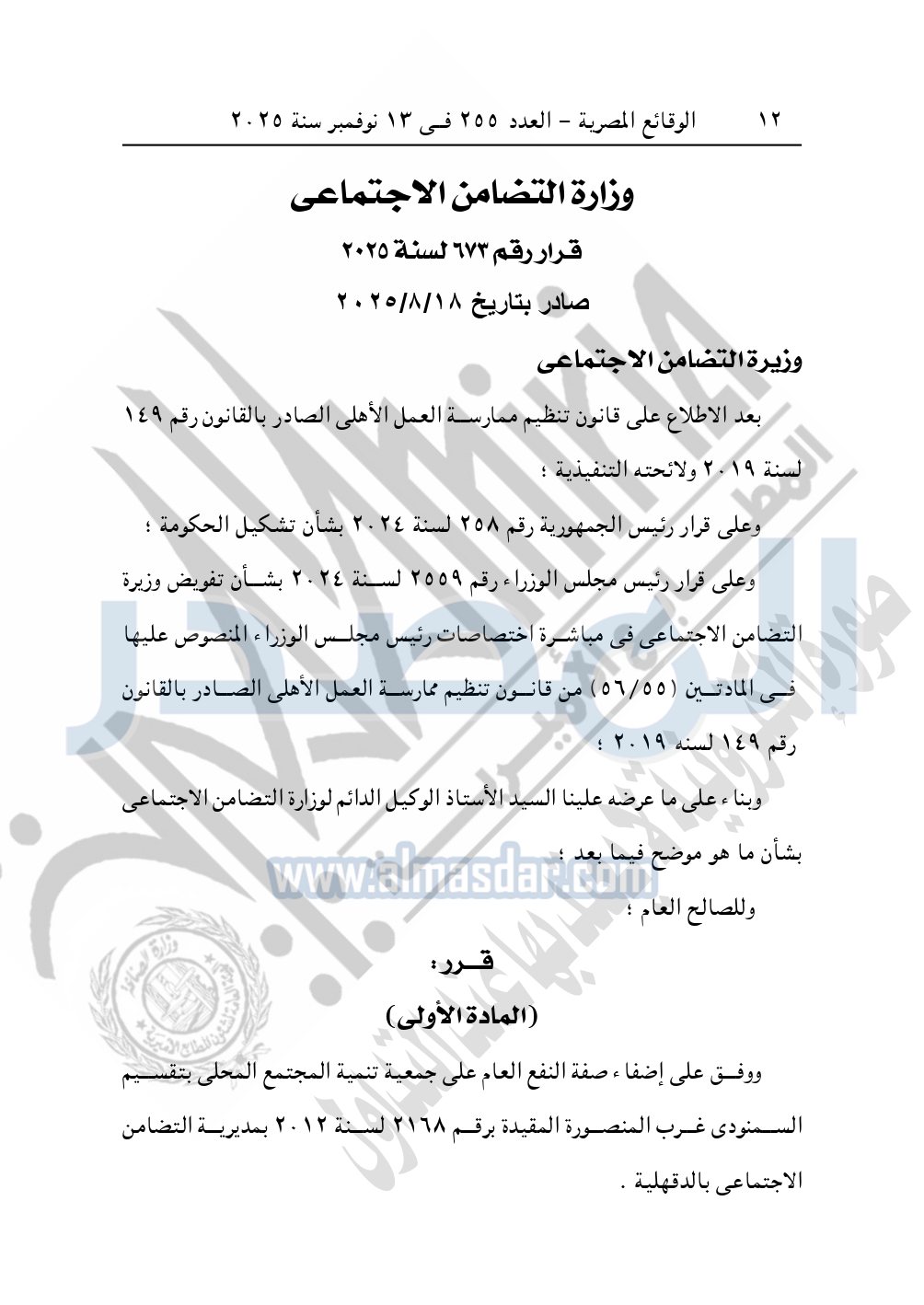 نشرت الوقائع المصرية في العدد 255، الصادر في 13 نوفمبر سنة 2025، وزارة التضامن الاجتماعي، رقم 673 لسنة 2025، بتاريخ 18-8-2025، بشأن الموافقة على إضفاء صفة النفع العام على جمعية تنمية المجتمع المحلي.