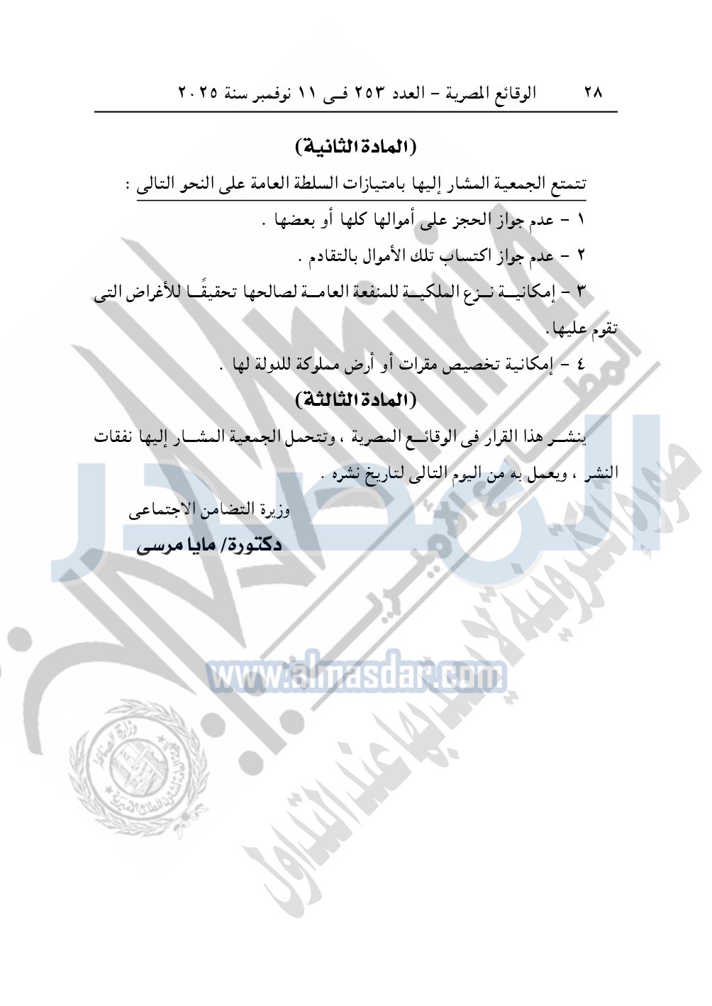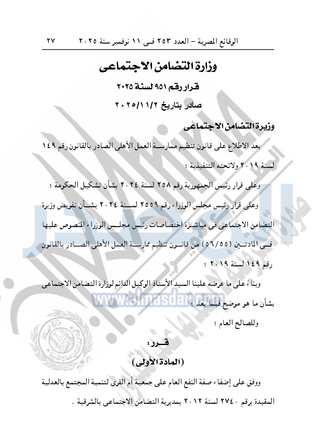 كما نشرت الوقائع المصرية في العدد 253، الصادر في 11 نوفمبر سنة 2025، وزارة التضامن الاجتماعي، رقم 951 لسنة 2025، بتاريخ 2-11-2025، بشأن الموافقة على إضفاء صفة النفع العام على جمعية أم القرى لتنمية المجتمع بالعدلية بالشرقية.