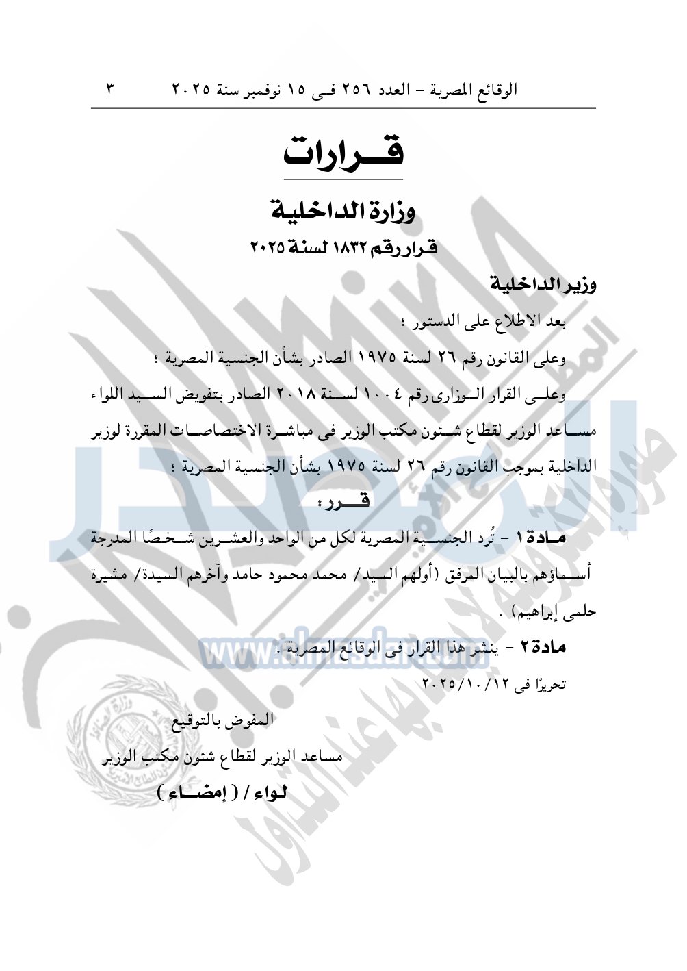 نشرت الوقائع المصرية في العدد 256 الصادر في 15 نوفمبر سنة 2025، قرار وزارة الداخلية قرار رقم 1832 لسنة 2024، بشأن رد الجنسية لـ 21 شخصا.