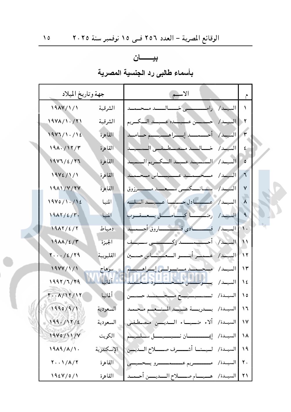 كما نشرت الوقائع المصرية في العدد 256 الصادر في 15 نوفمبر سنة 2025، قرار وزارة الداخلية قرار رقم 1856 لسنة 2024، بشأن رد الجنسية لـ 21 شخصا.