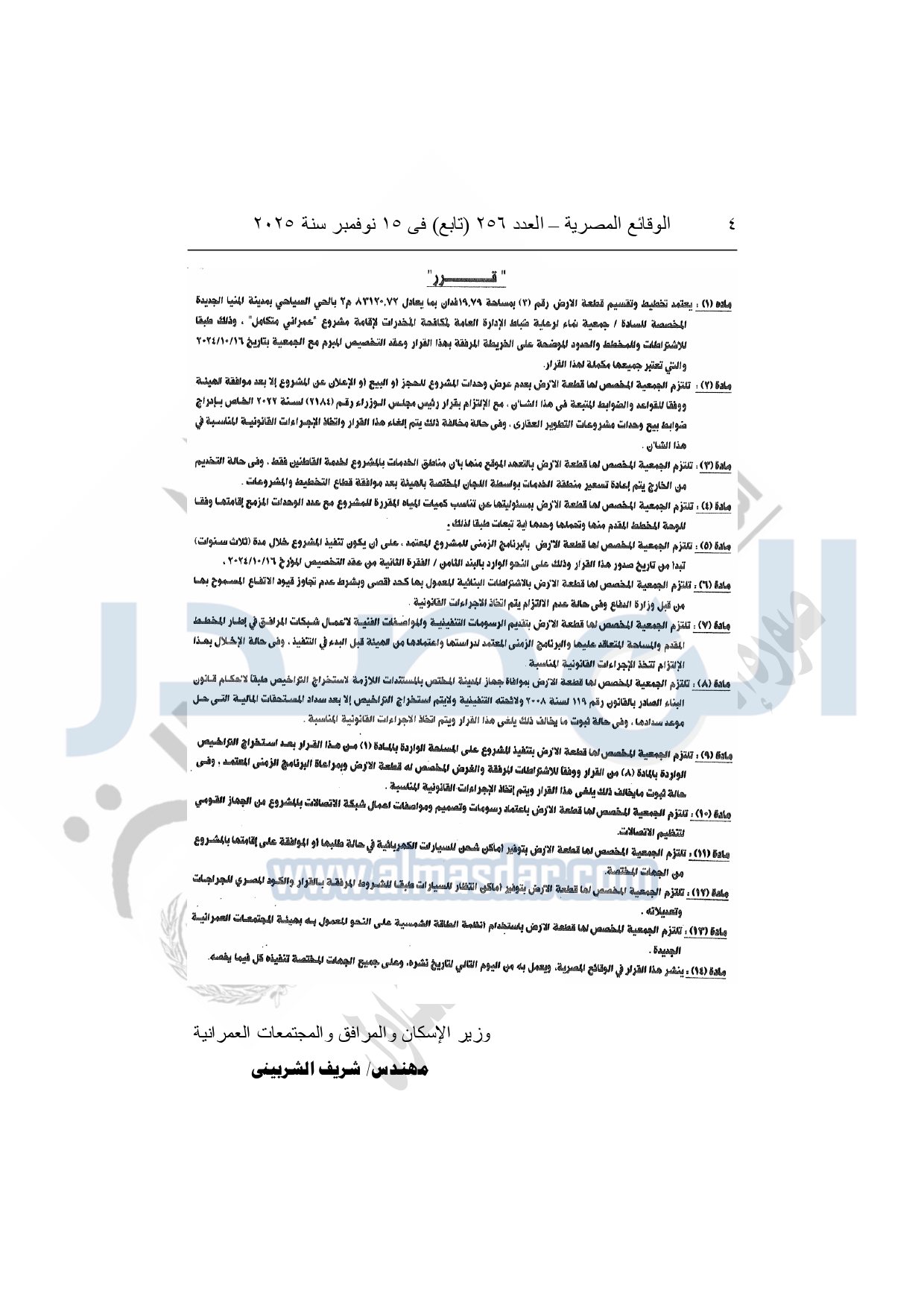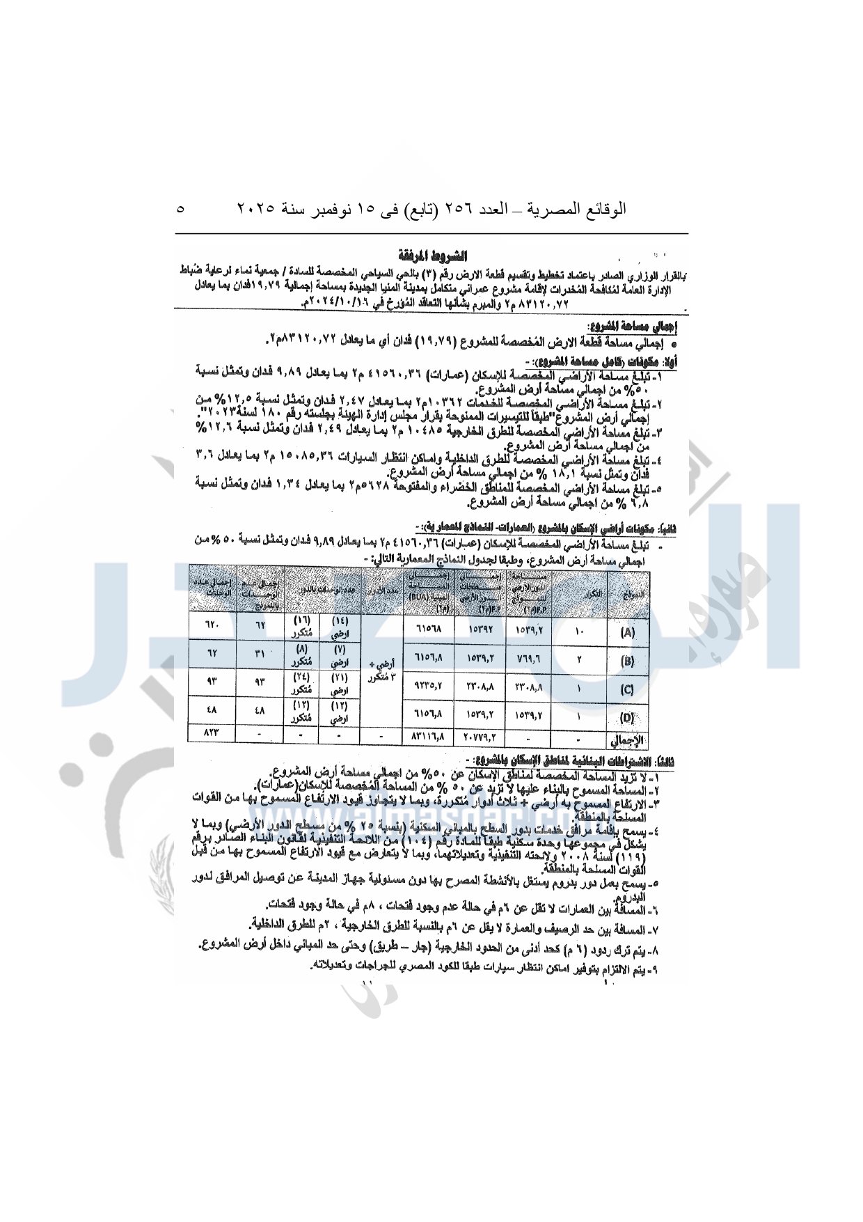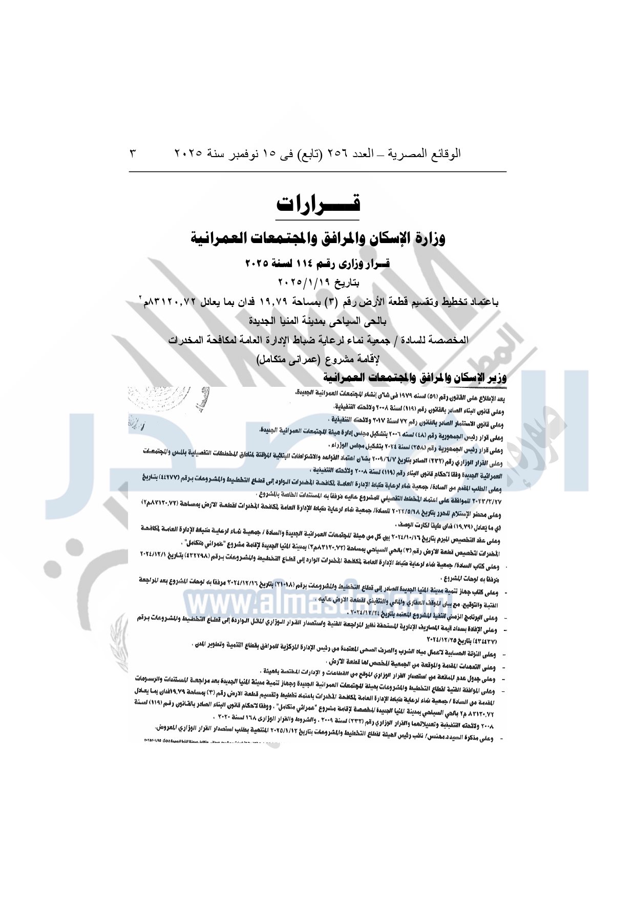نشرت الوقائع المصرية في العدد 256 "تابع"، الصادر في 15 نوفمبر سنة 2025، قرار وزارة الإسكان والمرافق والمجتمعات العمرانية، رقم 114 لسنة 2025، بتاريخ 19-1-2025، بشأن اعتماد تخطيط وتقسيم قطعة الأرض رقم "3" بمساحة 19.79 فدان بما يعادل 83120.72م2 بالحي السياحي بمدينة المنيا الجديدة المخصصة لـ جمعية نماء لرعاية ضباط الإدارة العامة لمكافحة المخدرات لإقامة مشروع "عمرانی متكامل".