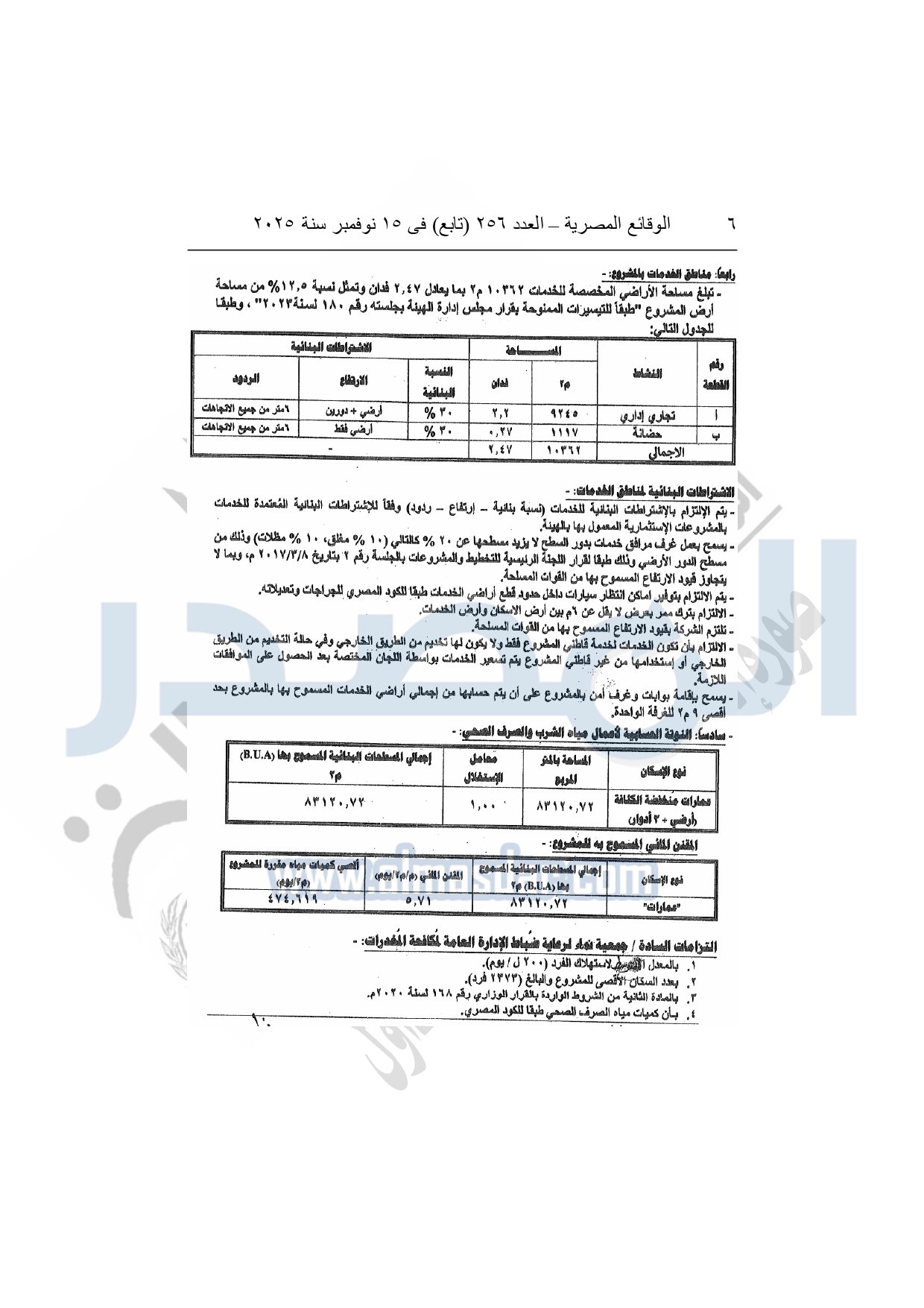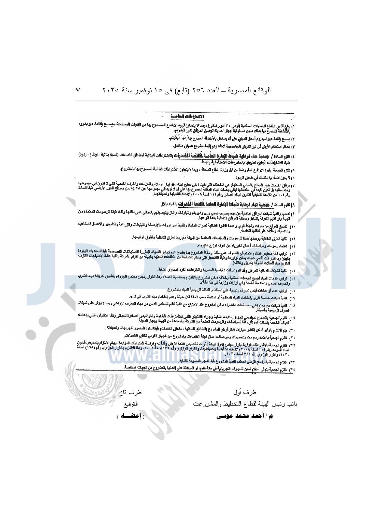تلتزم الجمعية المخصص لها قطعة الأرض بمسئوليتها عن تناسب كميات المياه المقررة للمشروع مع عدد الوحدات المزمع إقامتها وفقا للوحة المخطط المقدم منها وتحملها وحدها اية تبعات طبقا لذلك.