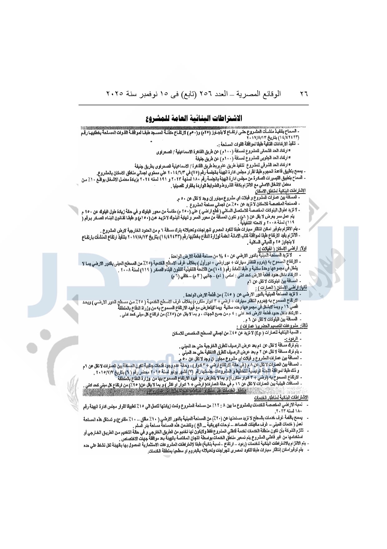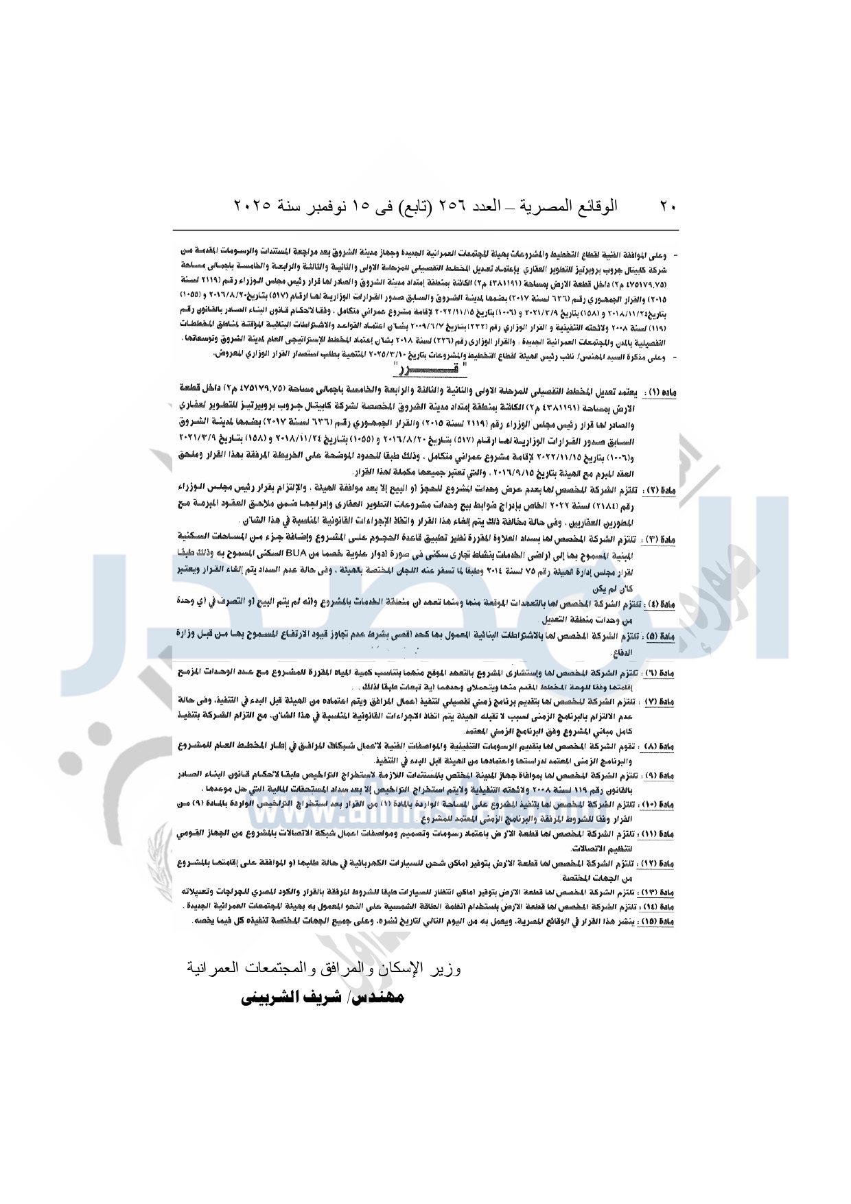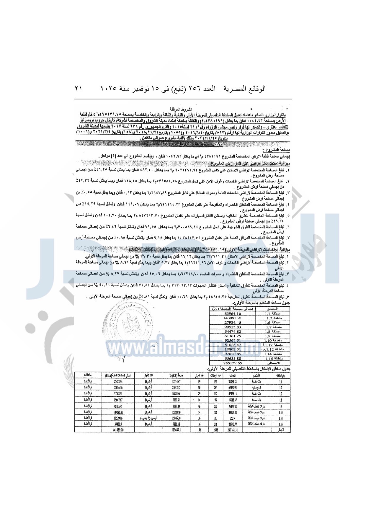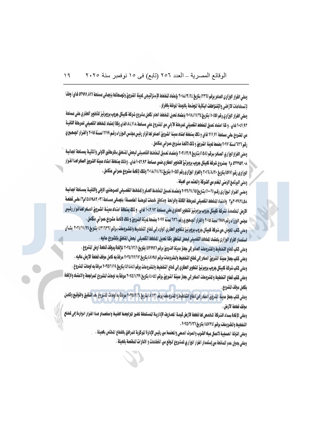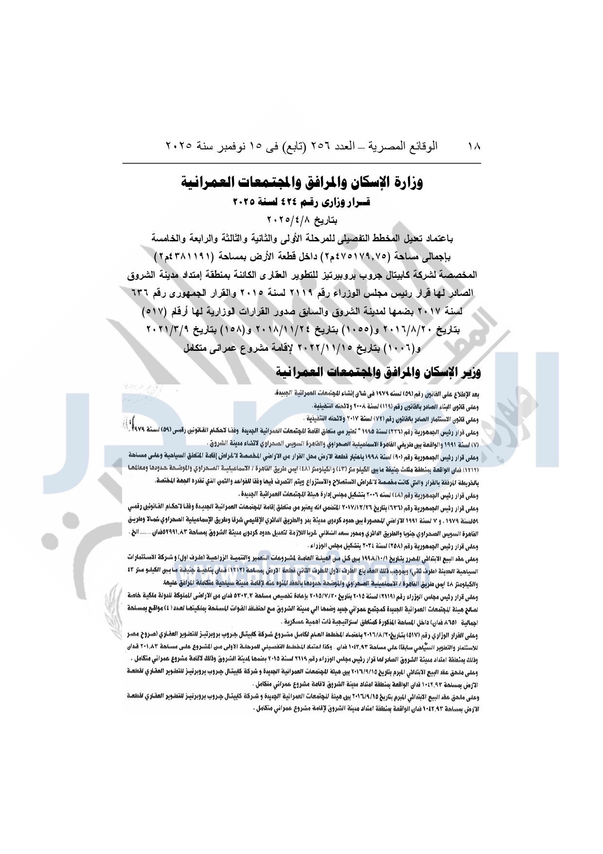 نشرت الوقائع المصرية في العدد 256 "تابع"، الصادر في 15 نوفمبر سنة 2025، قرار وزارة الإسكان والمرافق والمجتمعات العمرانية، رقم 424 لسنة 2025، بتاريخ 8-4-2025، بشأن اعتماد تعديل المخطط التفصيلى للمرحلة الأولى والثانية والثالثة والرابعة والخامسة بإجمالي مساحة "475179.75م2" داخل قطعة الأرض بمساحة "4381191م2" المخصصة لشركة كابيتال جروب بروبيرتيز للتطوير العقارى الكائنة بمنطقة إمتداد مدينة الشروق الصادر لها قرار رئيس مجلس الوزراء رقم 2119 لسنة 2015 و القرار الجمهورى رقم 636 لسنة 2017 بضمها لمدينة الشروق والسابق صدور القرارات الوزارية لها أرقام "517" بتاريخ 20-8-2016 و"1055" بتاريخ 24-11-2018 و"158" بتاريخ 9-3-2021 و"1006" بتاريخ 15-11-2022 لإقامة مشروع عمراني متكامل.