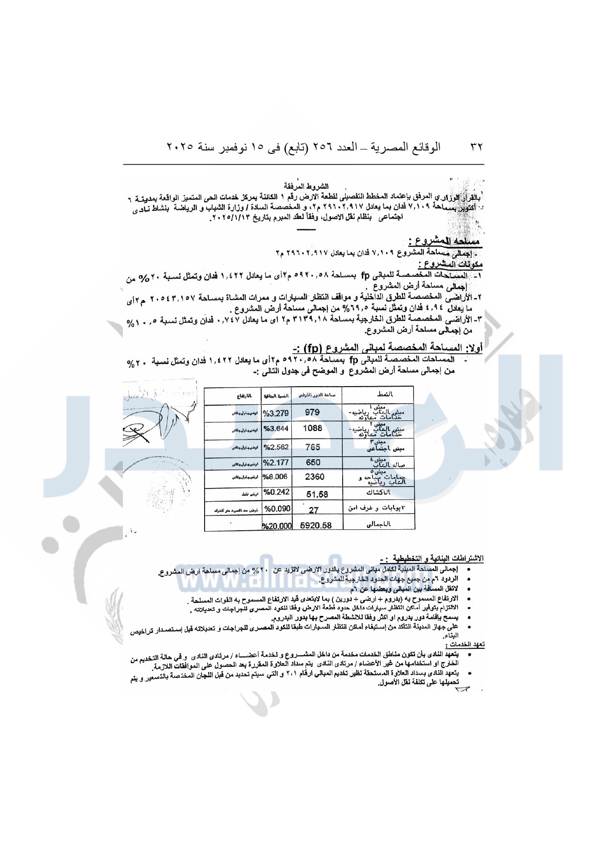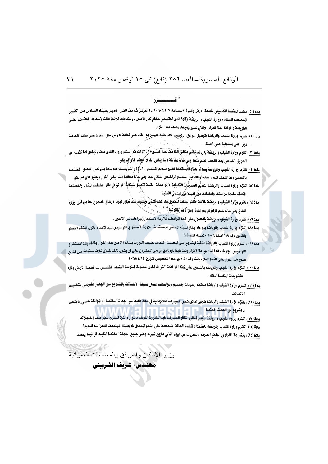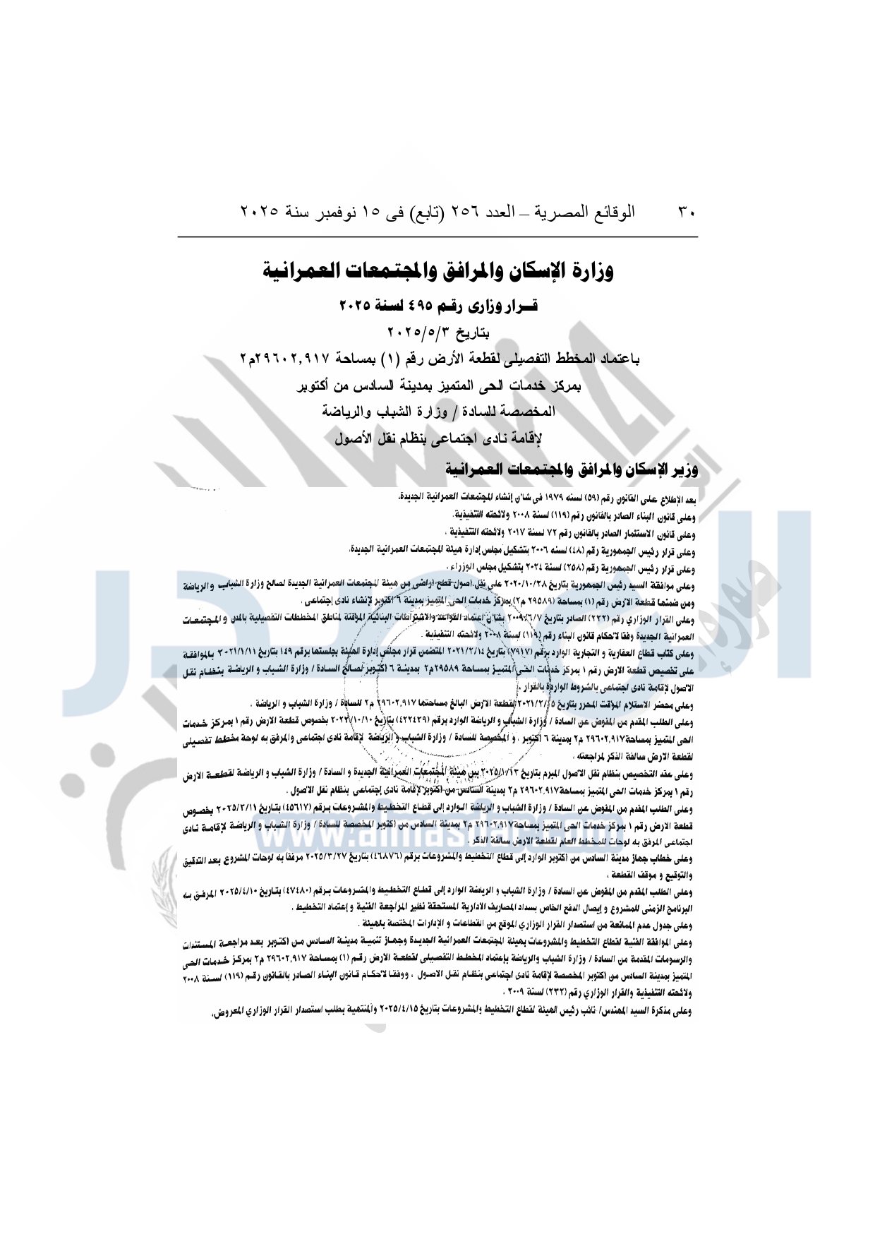 نشرت الوقائع المصرية في العدد 256 "تابع"، الصادر في 15 نوفمبر سنة 2025، قرار وزارة الإسكان والمرافق والمجتمعات العمرانية، رقم 495 لسنة 2025، بتاريخ 3-5-2025، بشأن إعتماد المخطط التفصيلى لقطعة الأرض رقم "1" بمساحة 29602.917م2 بمركز خدمات الحى المتميز بمدينة السادس من اكتوبر المخصصة لـ وزارة الشباب والرياضة لإقامة نادى اجتماعى بنظام نقل الاصول.