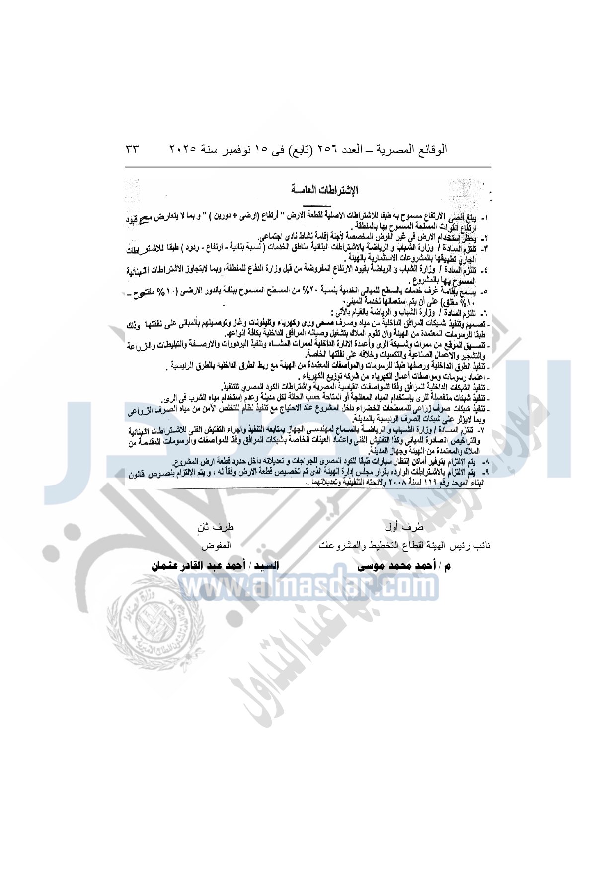 تلتزم وزارة الشباب والرياضة بتوصيل المرافق الرئيسية والداخلية للمشروع المقام على قطعة الأرض محل التعاقد على نفقته الخاصة دون ادنى مسئولية على الهيئة.