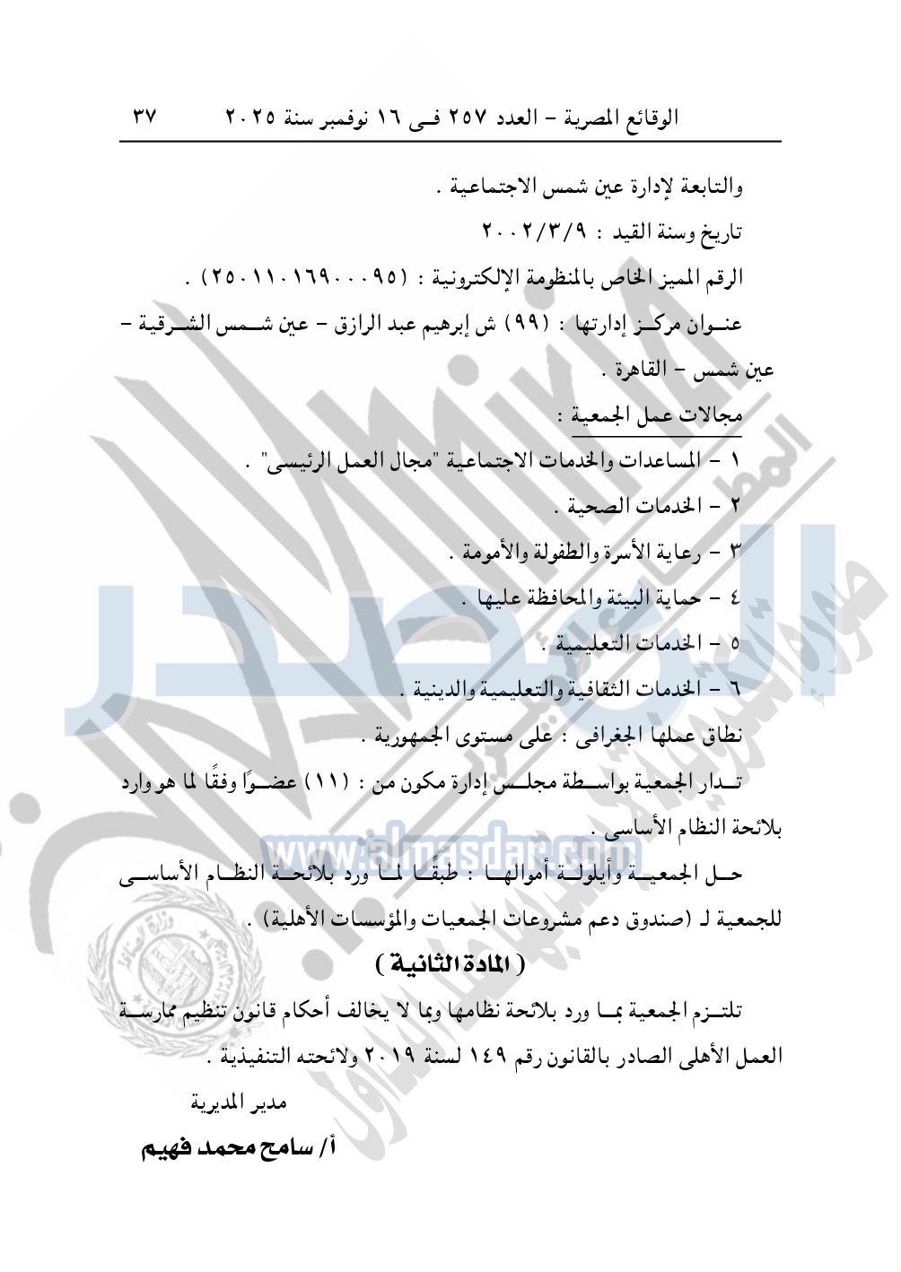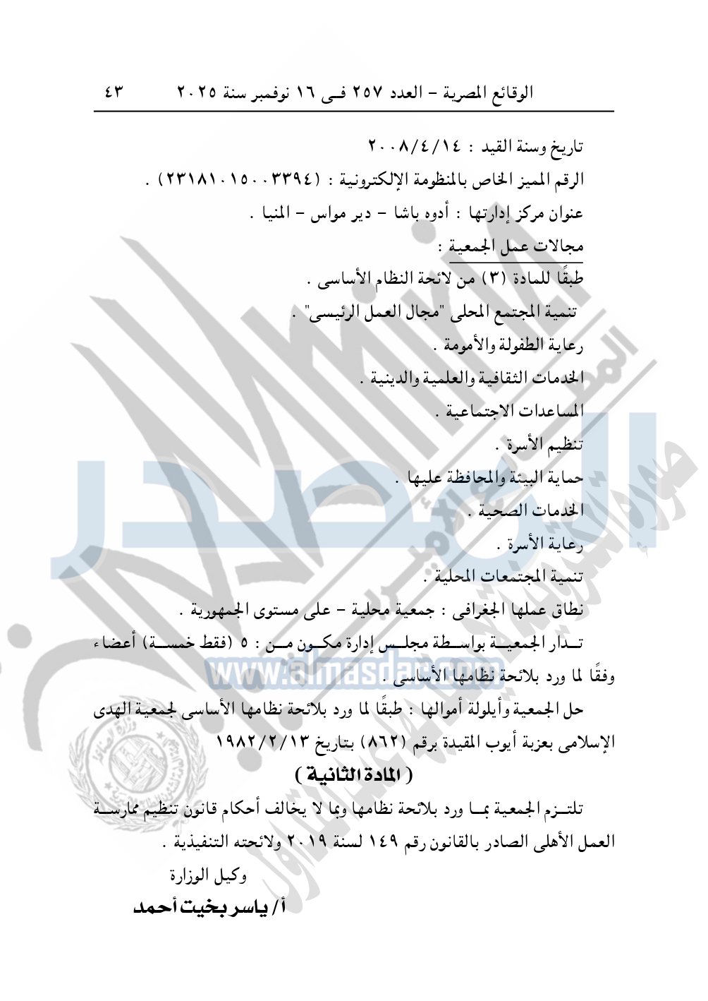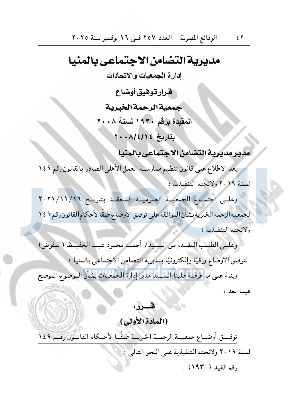 وأيضا نشرت الوقائع المصرية في العدد 257، بتاريخ 16 نوفمبر 2025، قرار مديرية التضامن الاجتماعي بالمنيا، بشأن توفيق أوضاع جمعية الرحمة الخيرية، المقيدة برقم "1930" لسنة 2008، بتاريخ 14-4-2008.