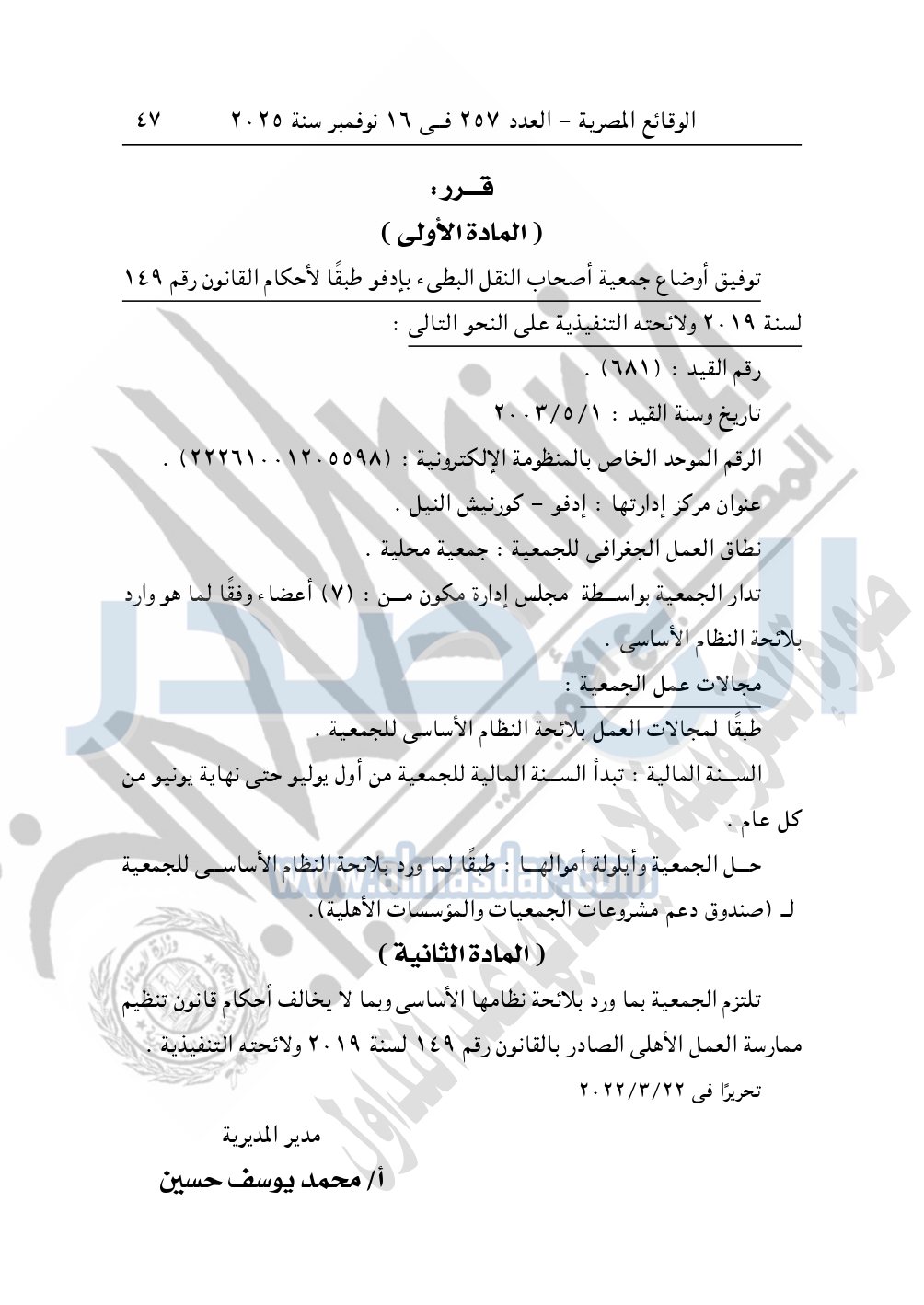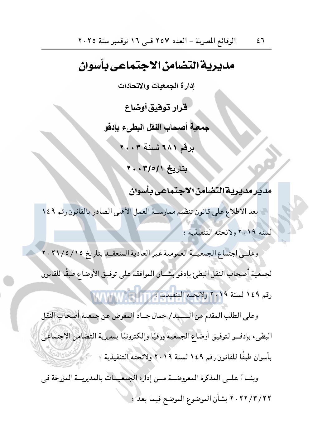 ونشرت الوقائع المصرية في العدد 257، بتاريخ 16 نوفمبر 2025، قرار مديرية التضامن الاجتماعي بأسوان، بشأن توفيق أوضاع جمعية أصحاب النقل البطئ بإدفو، المقيدة برقم "681" لسنة 2003، بتاريخ 1-5-2003.