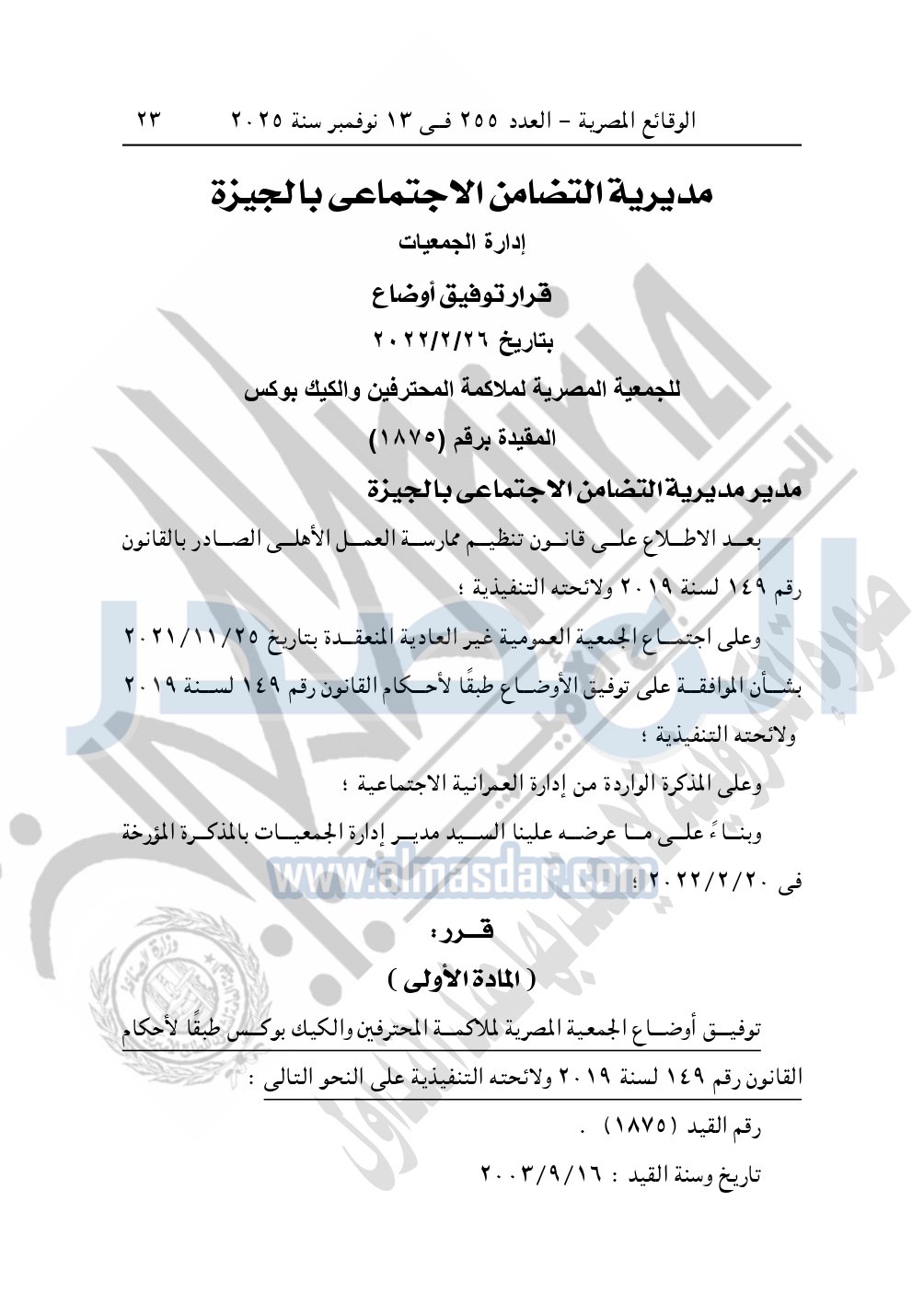 كما نشرت الوقائع المصرية في العدد 255، بتاريخ 13 نوفمبر 2025، قرار مديرية التضامن الاجتماعي بالجيزة، بشأن توفيق أوضاع الجمعية المصرية لملاكمة المحترفين والكيك بوكس، المقيدة برقم "1875".
