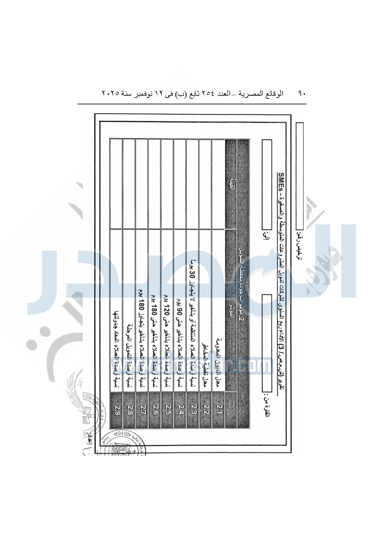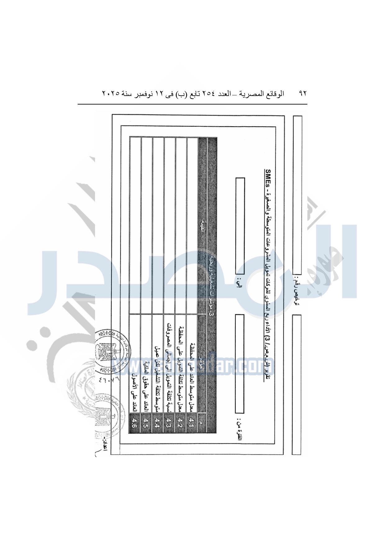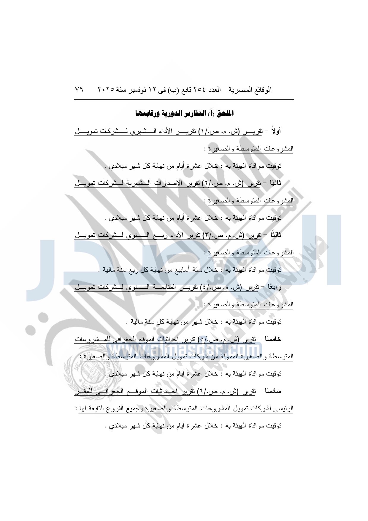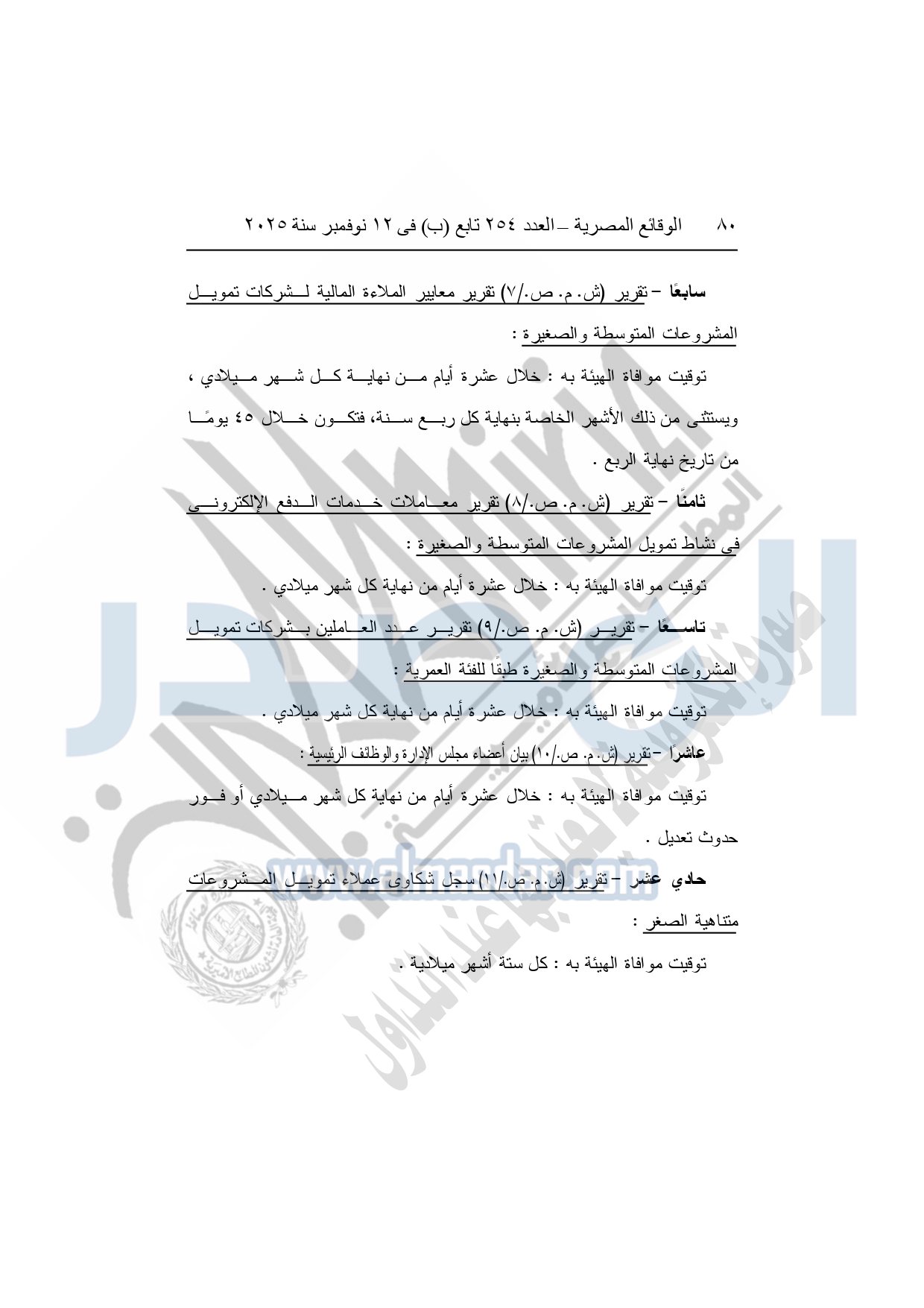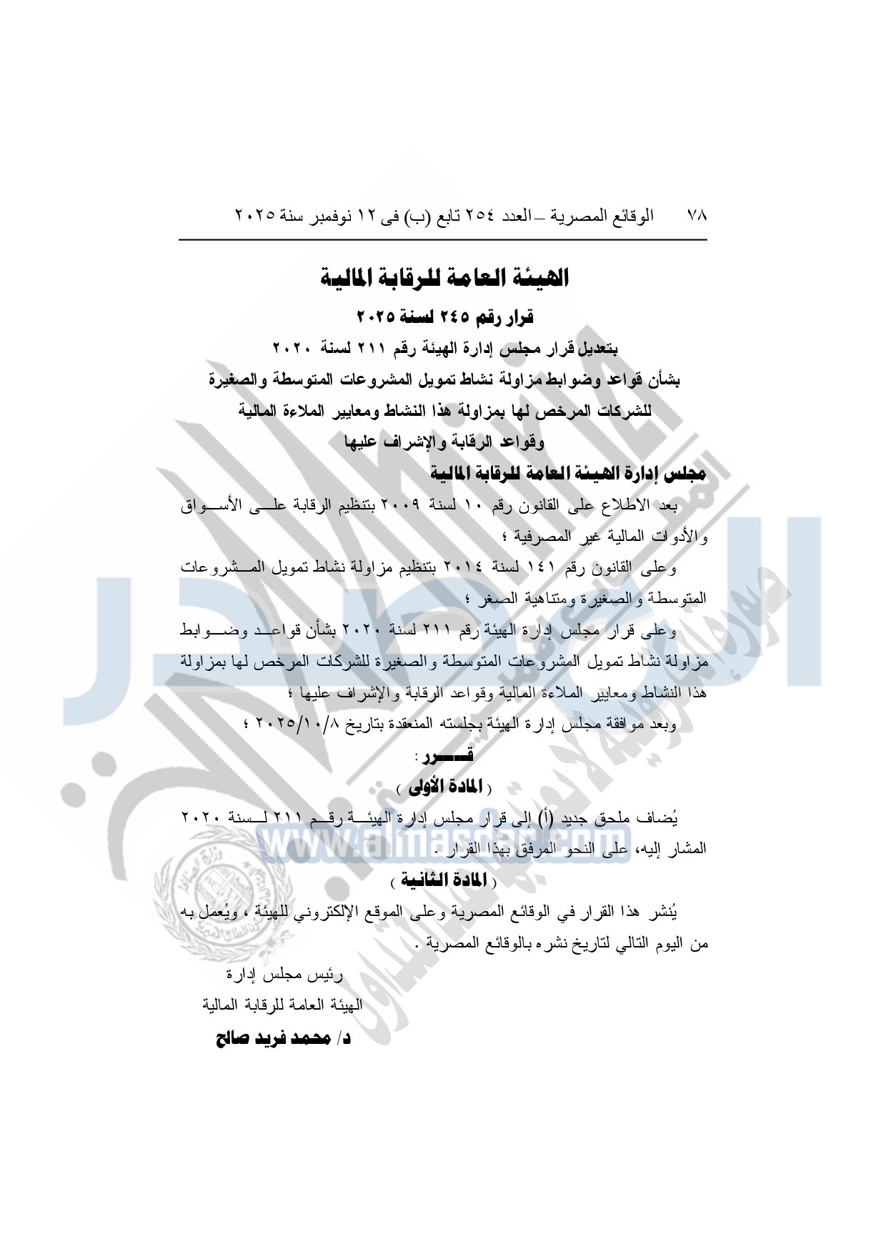نشرت الوقائع المصرية في العدد 254 "تابع"، الصادر في 12 نوفمبر 2025، قرار الهيئة العامة للرقابة المالية، رقم 245 لسنة 2025، بتعديل قرار مجلس إدارة الهيئة رقم 211 لسنة 2020، بشأن قواعد وضوابط مزاولة نشاط تمويل المشروعات المتوسطة والصغيرة للشركات المرخص لها بمزاولة هذا النشاط ومعايير الملاءة المالية وقواعد الرقابة والإشراف عليها.