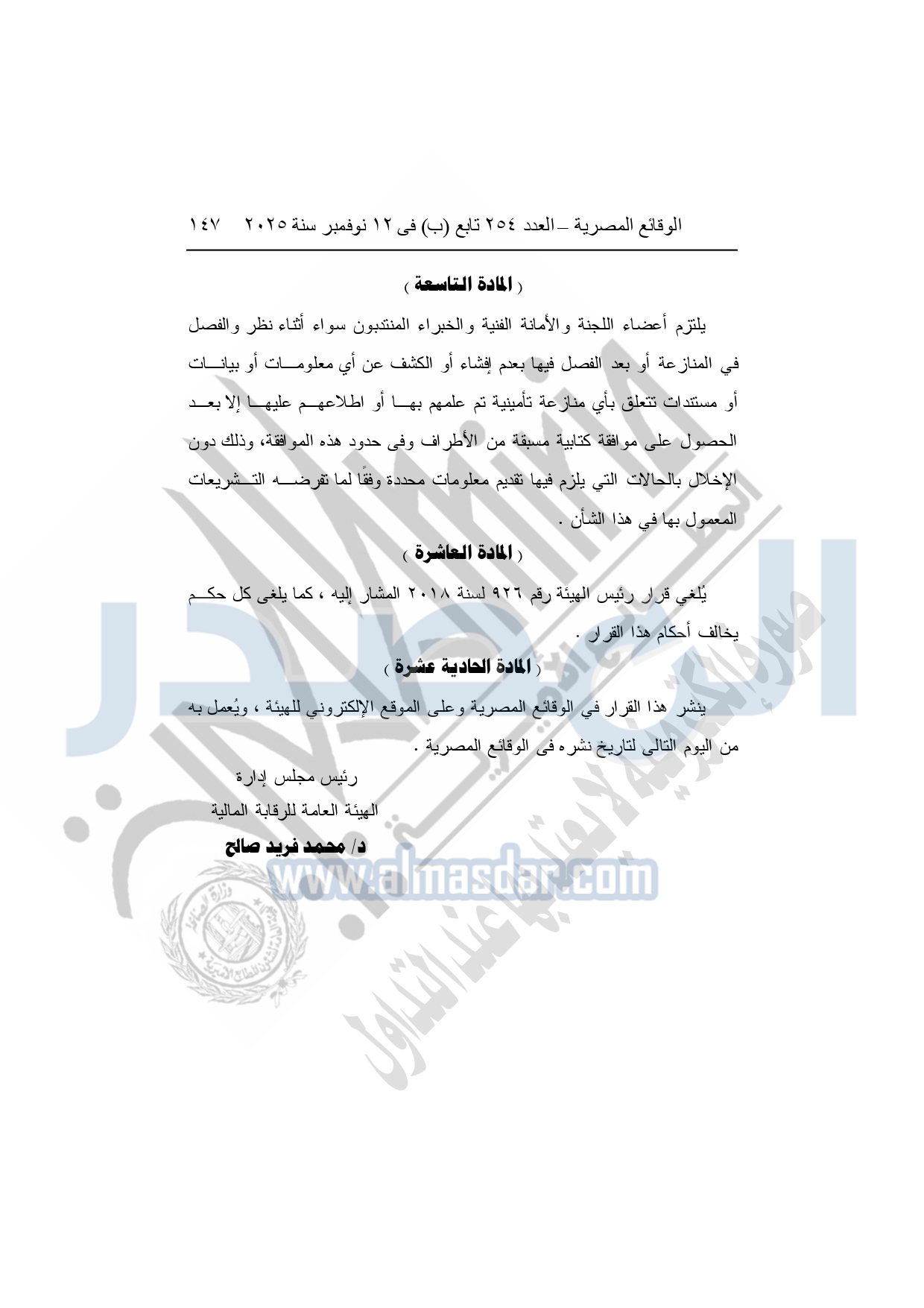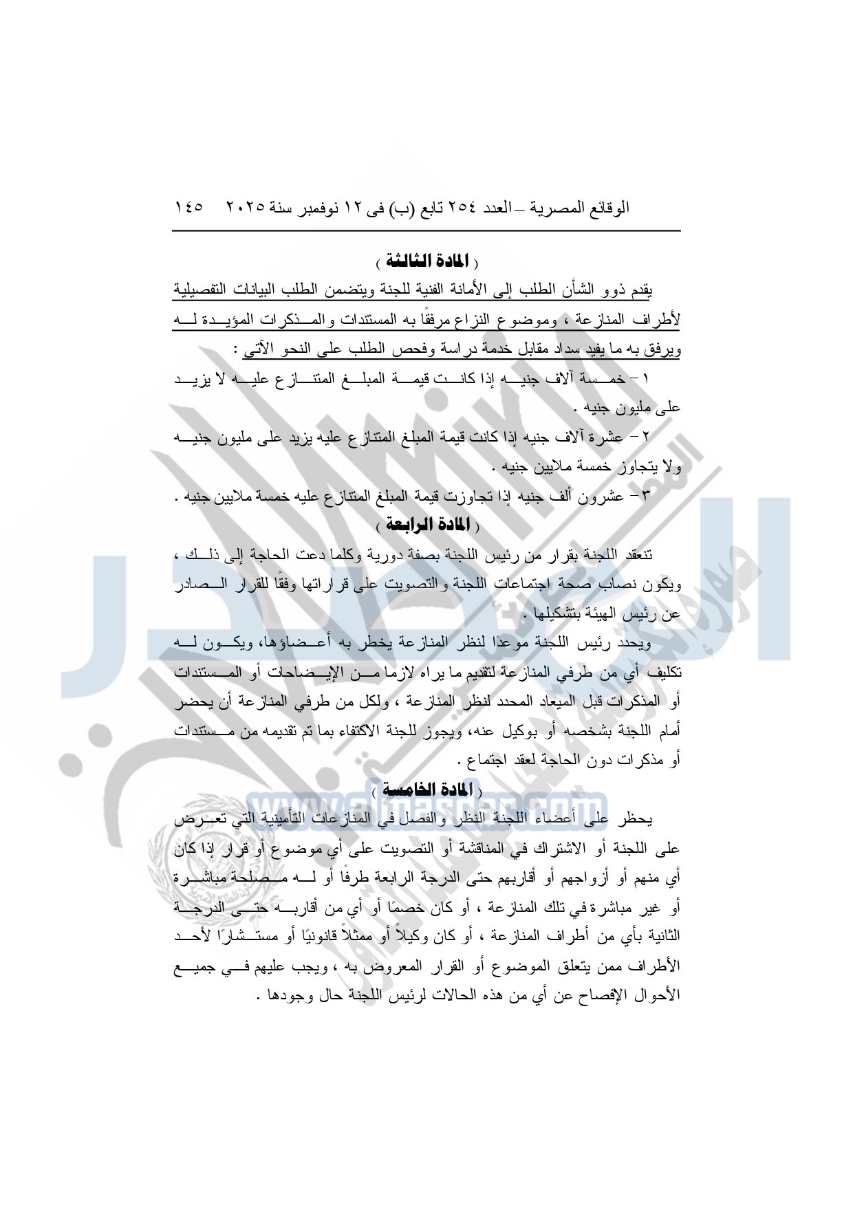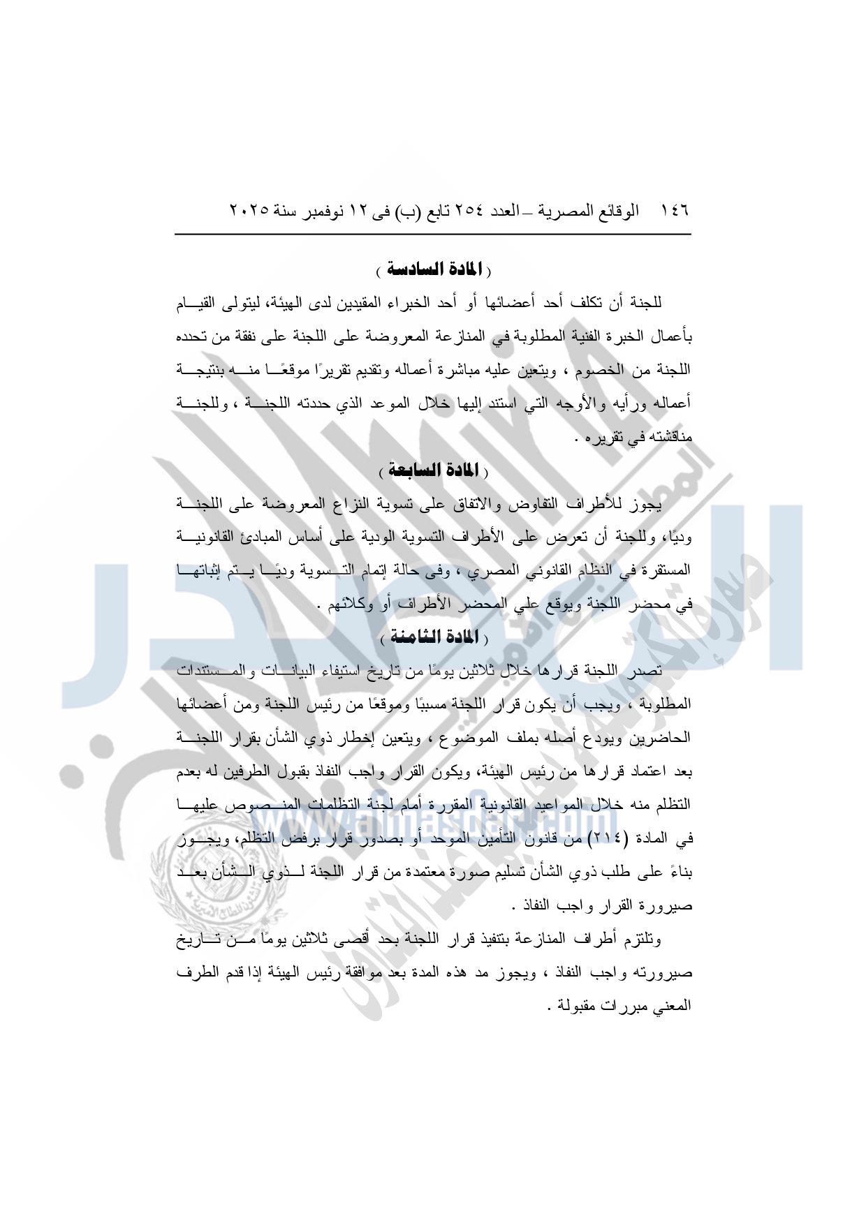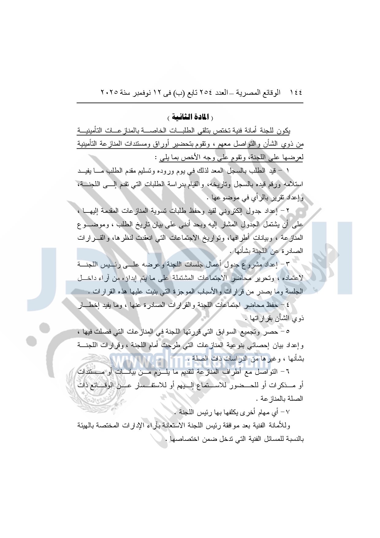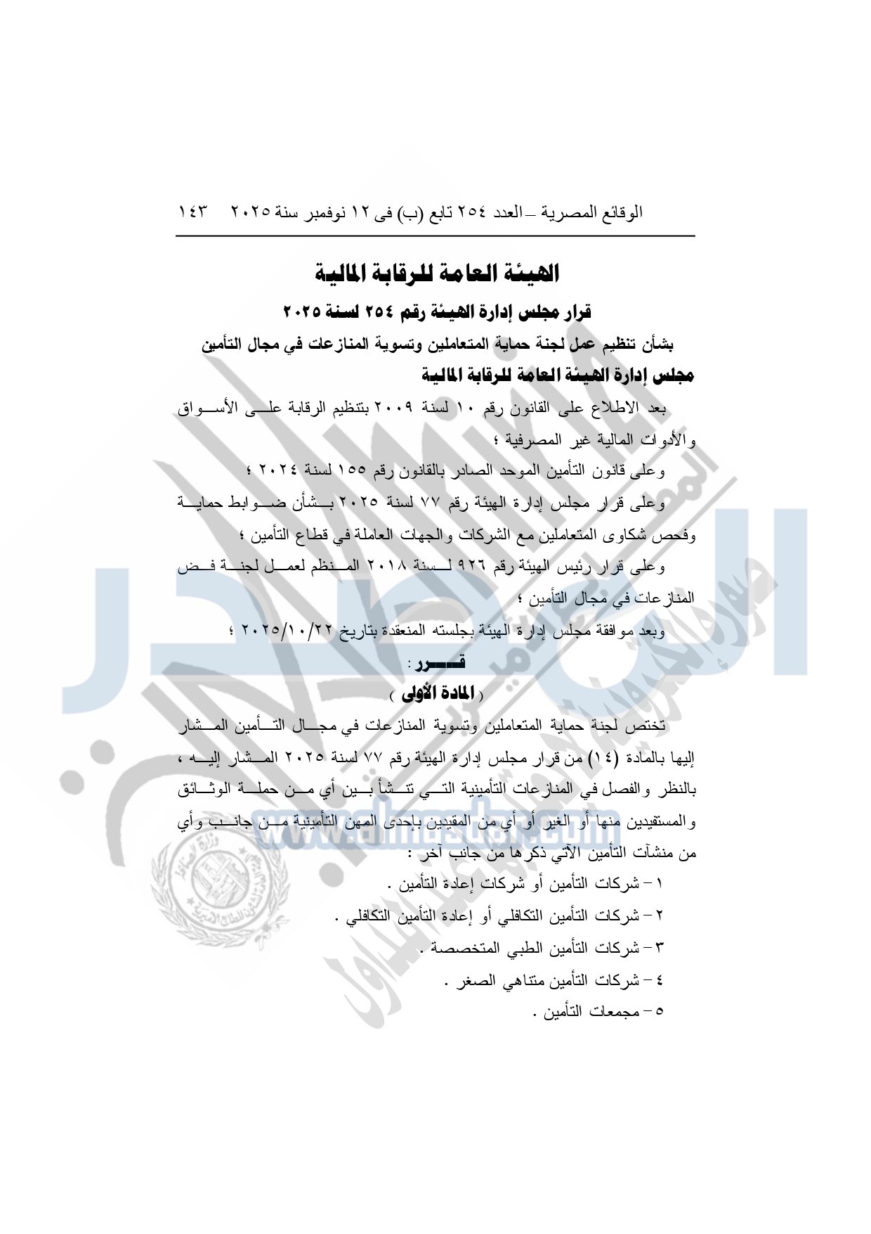 نشرت الوقائع المصرية في العدد 254 "تابع"، الصادر في 12 نوفمبر 2025، قرار الهيئة العامة للرقابة المالية، رقم 254 لسنة 2025، بشأن تنظيم عمل لجنة حماية المتعاملين وتسوية المنازعات في مجال التأمين.