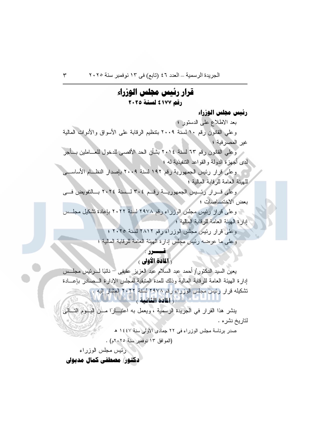 أصدر الدكتور مصطفى مدبولي، رئيس مجلس الوزراء، القرار رقم 4177 لسنة 2025، بتعيين الدكتور أحمد عبد العزيز نائبًا لرئيس مجلس إدارة الهيئة العامة للرقابة المالية.