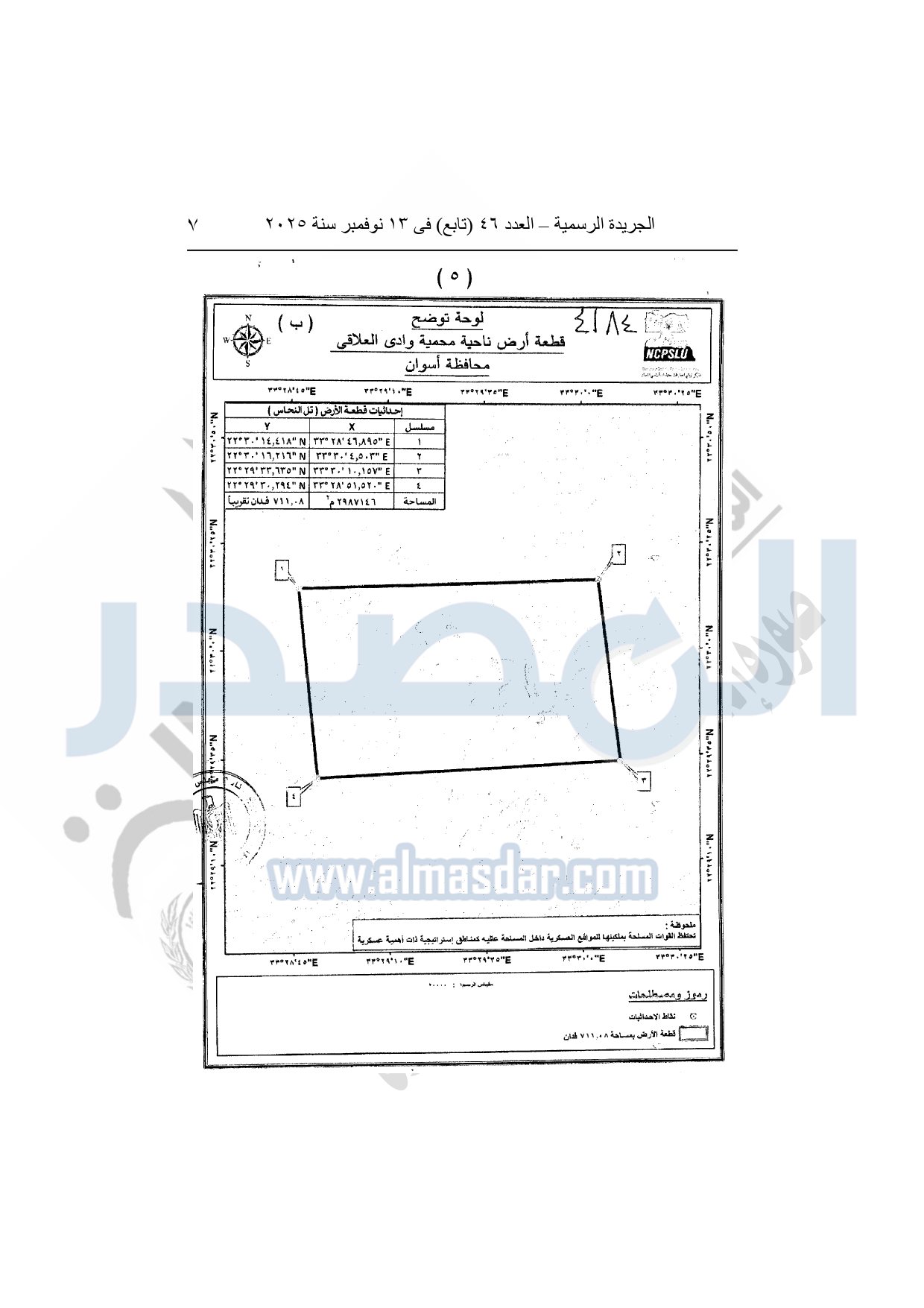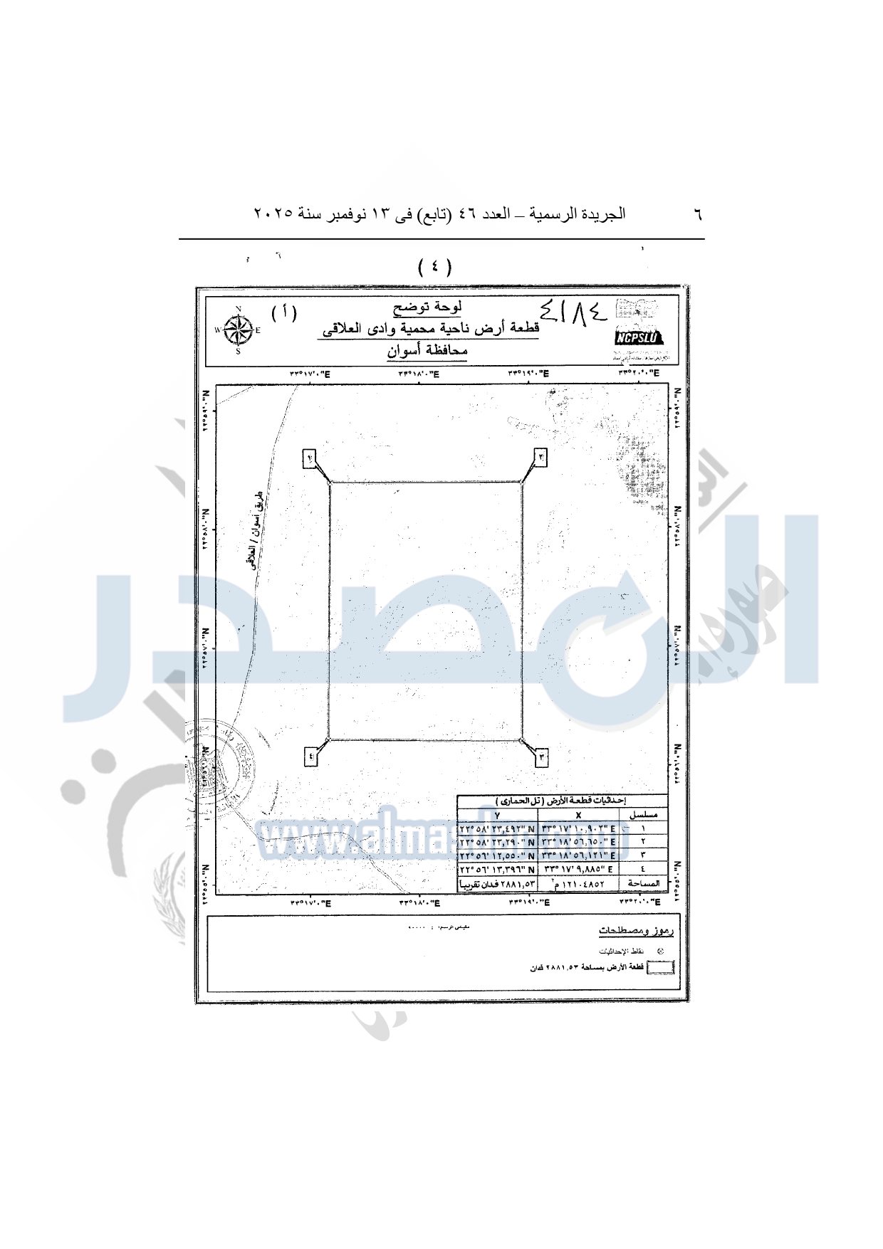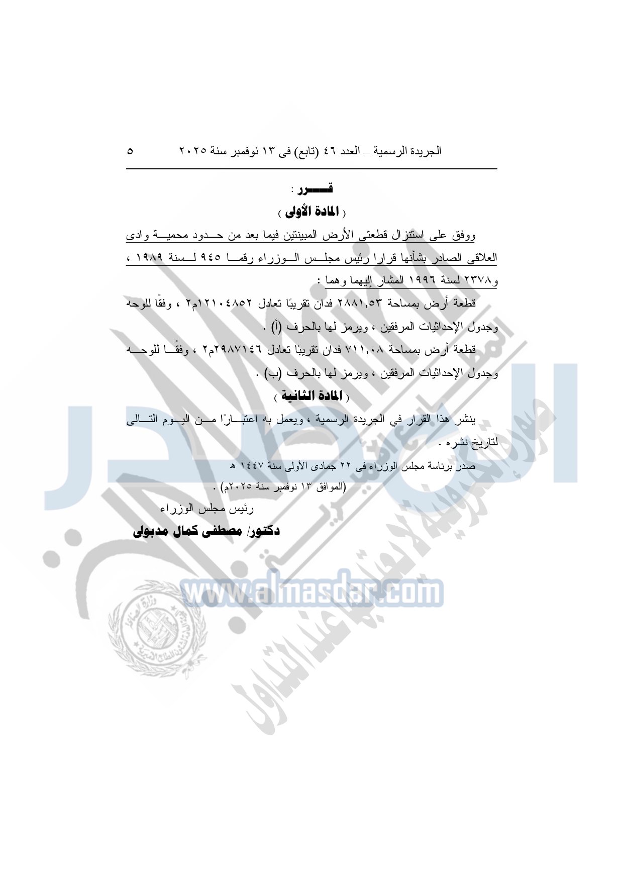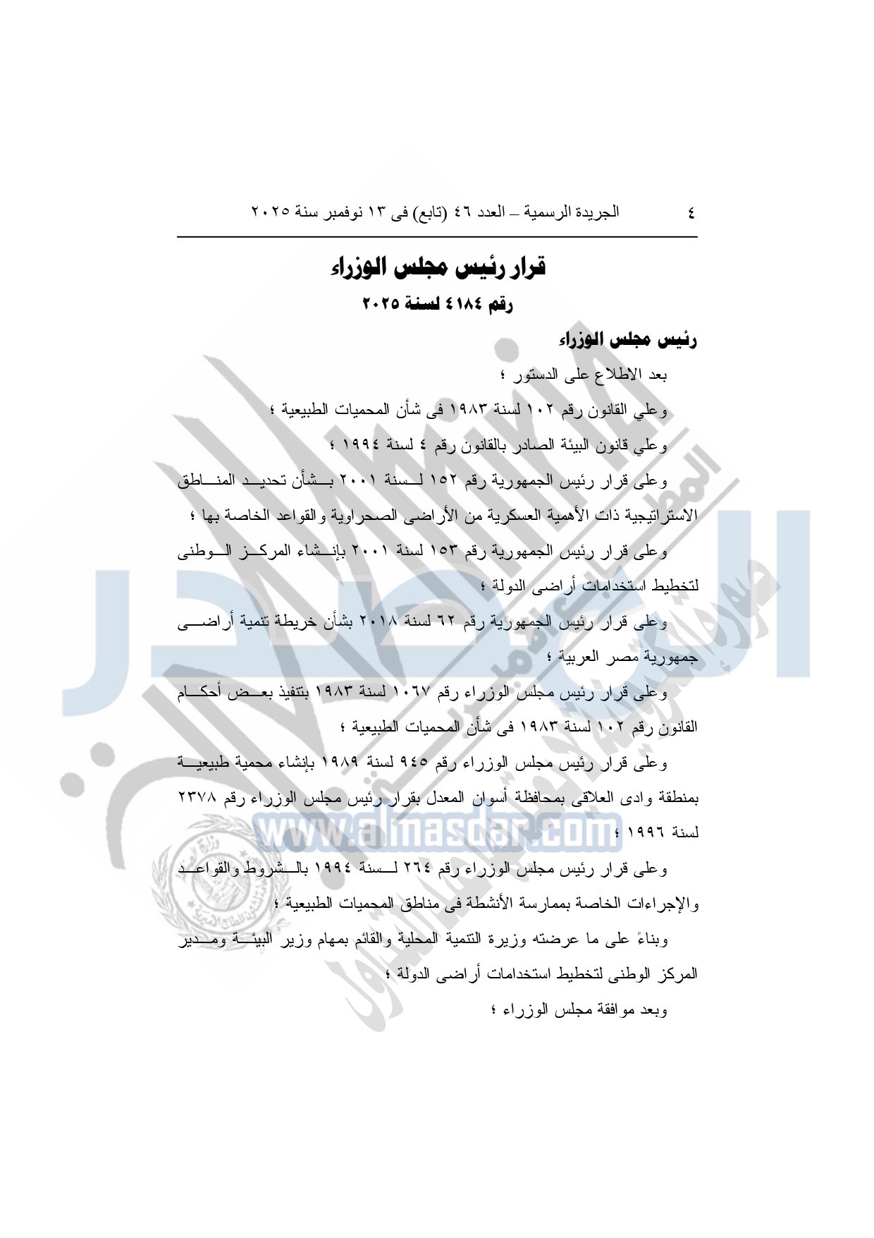نشرت الجريدة الرسمية في العدد 46 "تابع"، الصادر في 13 نوفمبر 2025، قرار رئيس مجلس الوزراء، رقم 4184 لسنة 2025، بشأن الموافقة على استنزال قطعتي أرض من حدود محمية وادي العلاقي في أسوان.