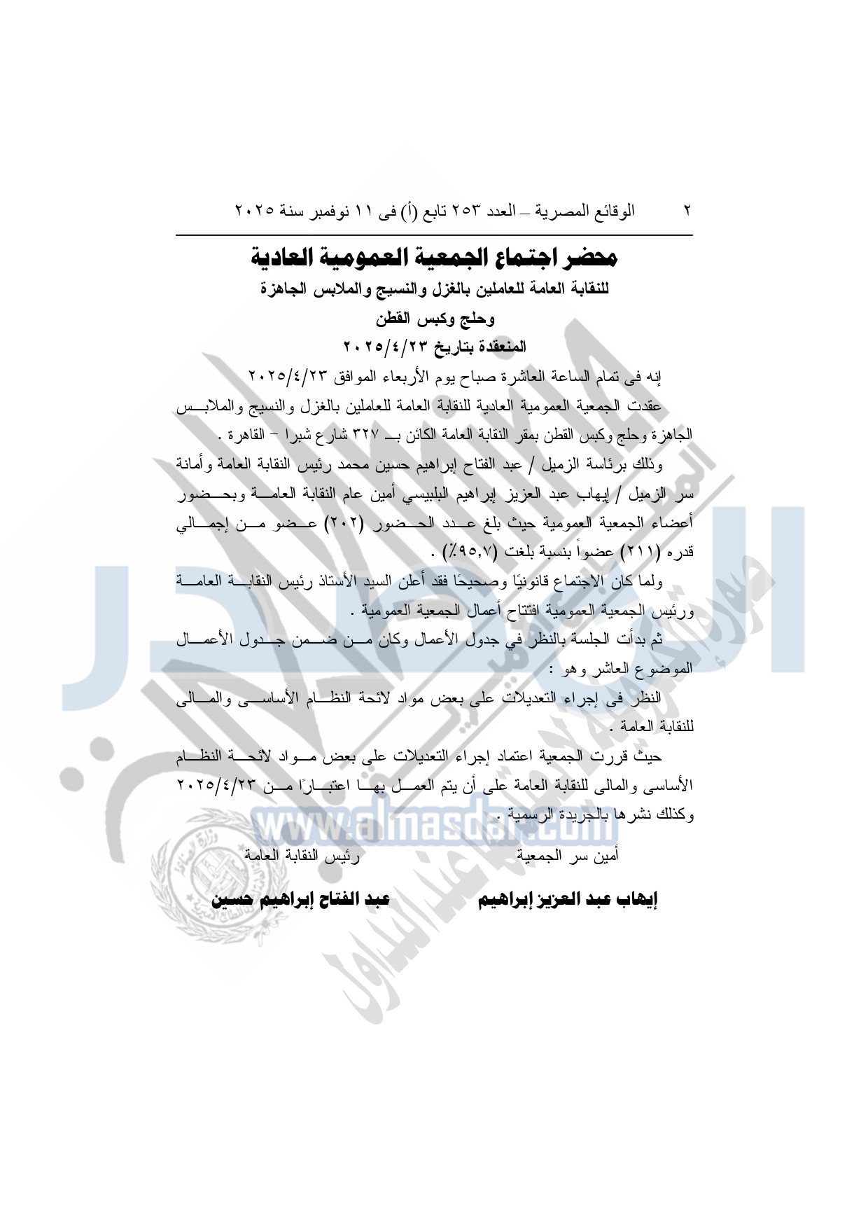 وأوضحت الوقائع المصرية، أنه في تمام الساعة العاشرة صباح يوم الأربعاء الموافق 23-4-2025 عقدت الجمعية العمومية العادية للنقابة العامة للعاملين بالغزل والنسيج والملابس الجاهزة وحلج وكبس القطن بمقر النقابة العامة الكائن بـ 327 شارع شبرا - القاهرة.