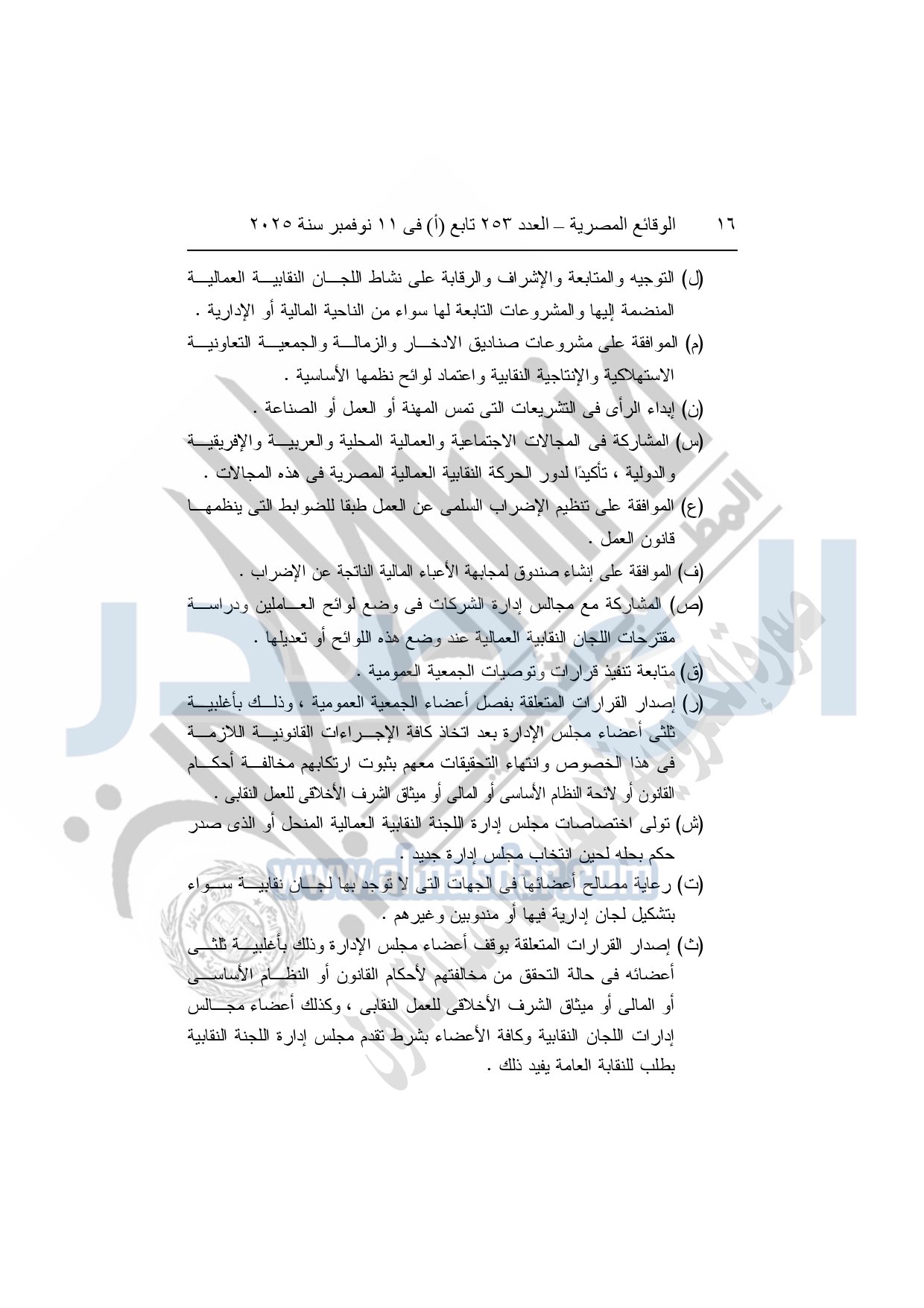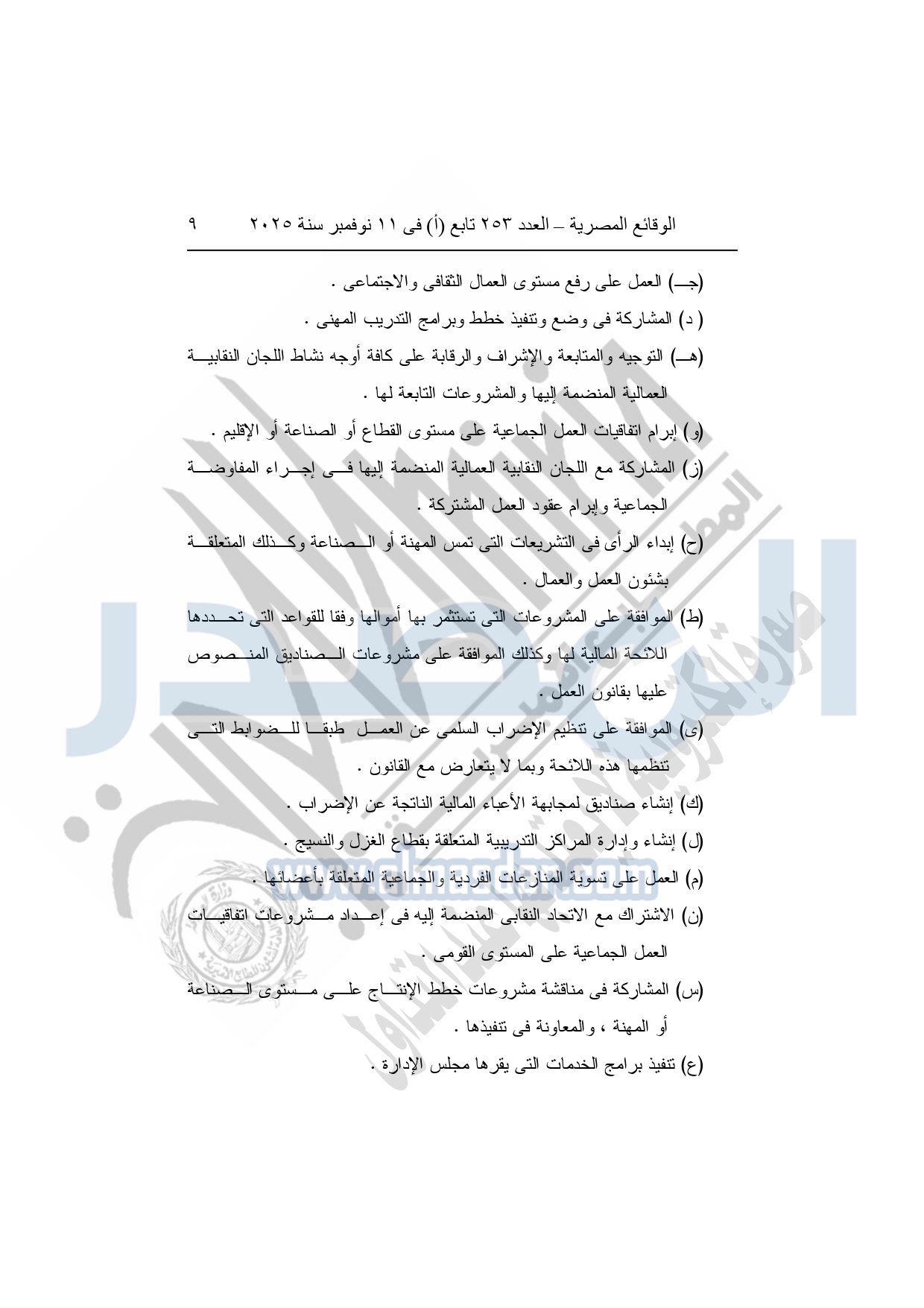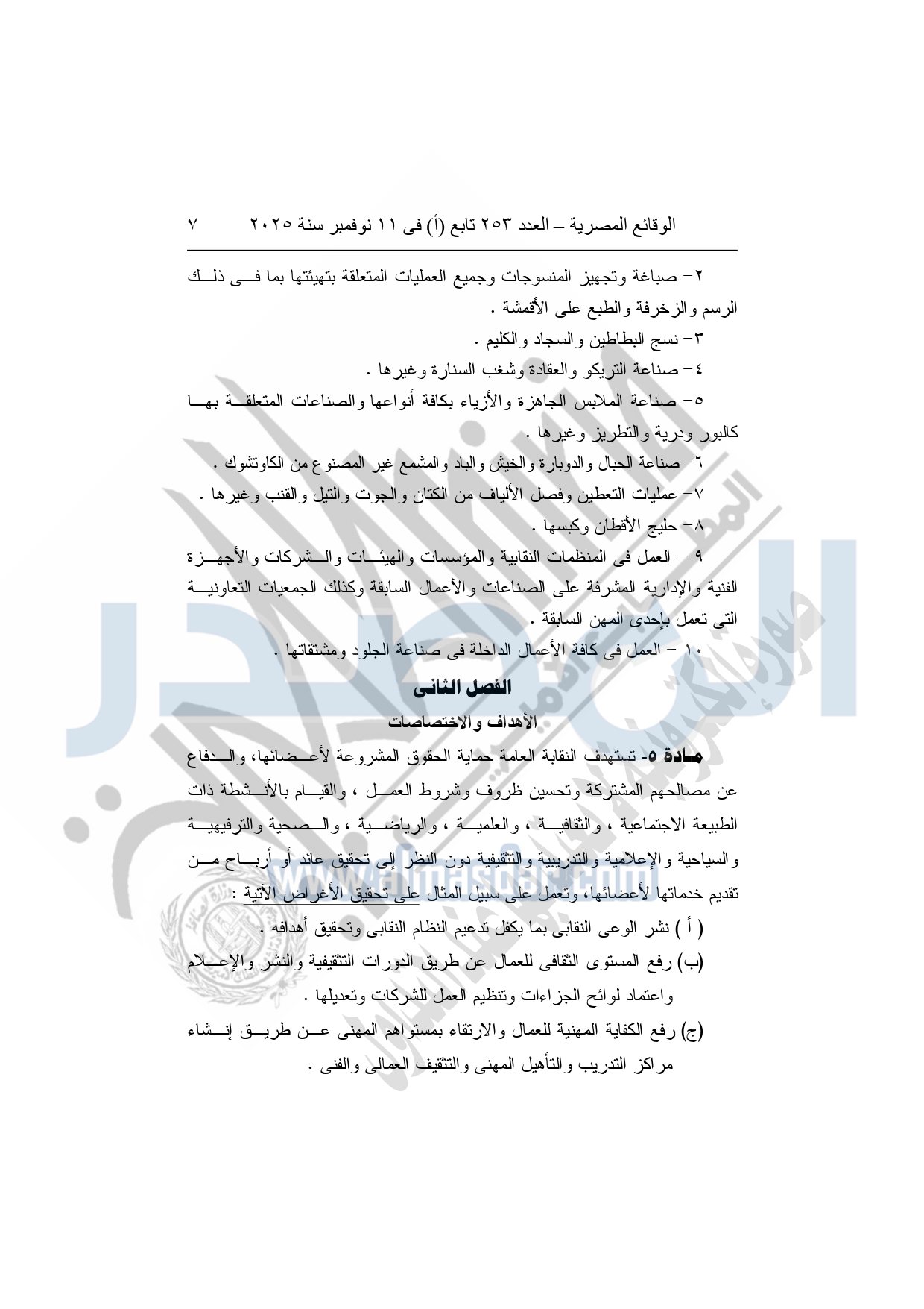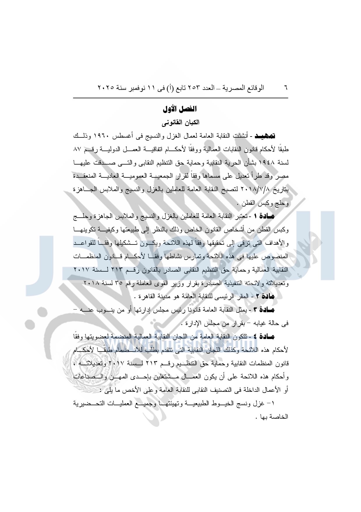 نشرت الوقائع المصرية في العدد 253 تابع "أ"، الصادر في 11 نوفمبر 2025، قرارات الجمعية العمومية العادية للنقابة العامة للعاملين بالغزل والنسيج والملابس الجاهزة وحلج وكبس القطن، المنعقدة بتاريخ 23-4-2025، بشأن تعديل لائحة النقابة العامة للعاملين بالغزل والنسيج والملابس الجاهزة.