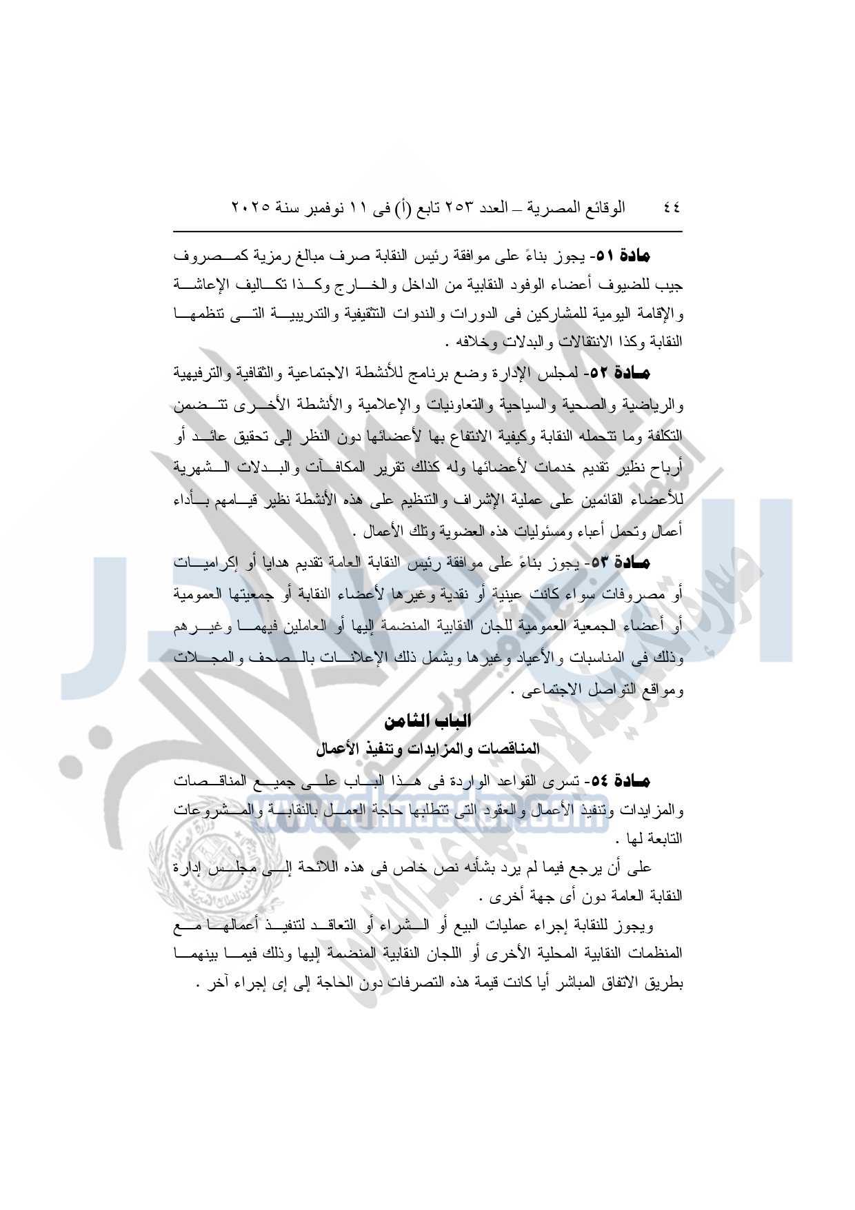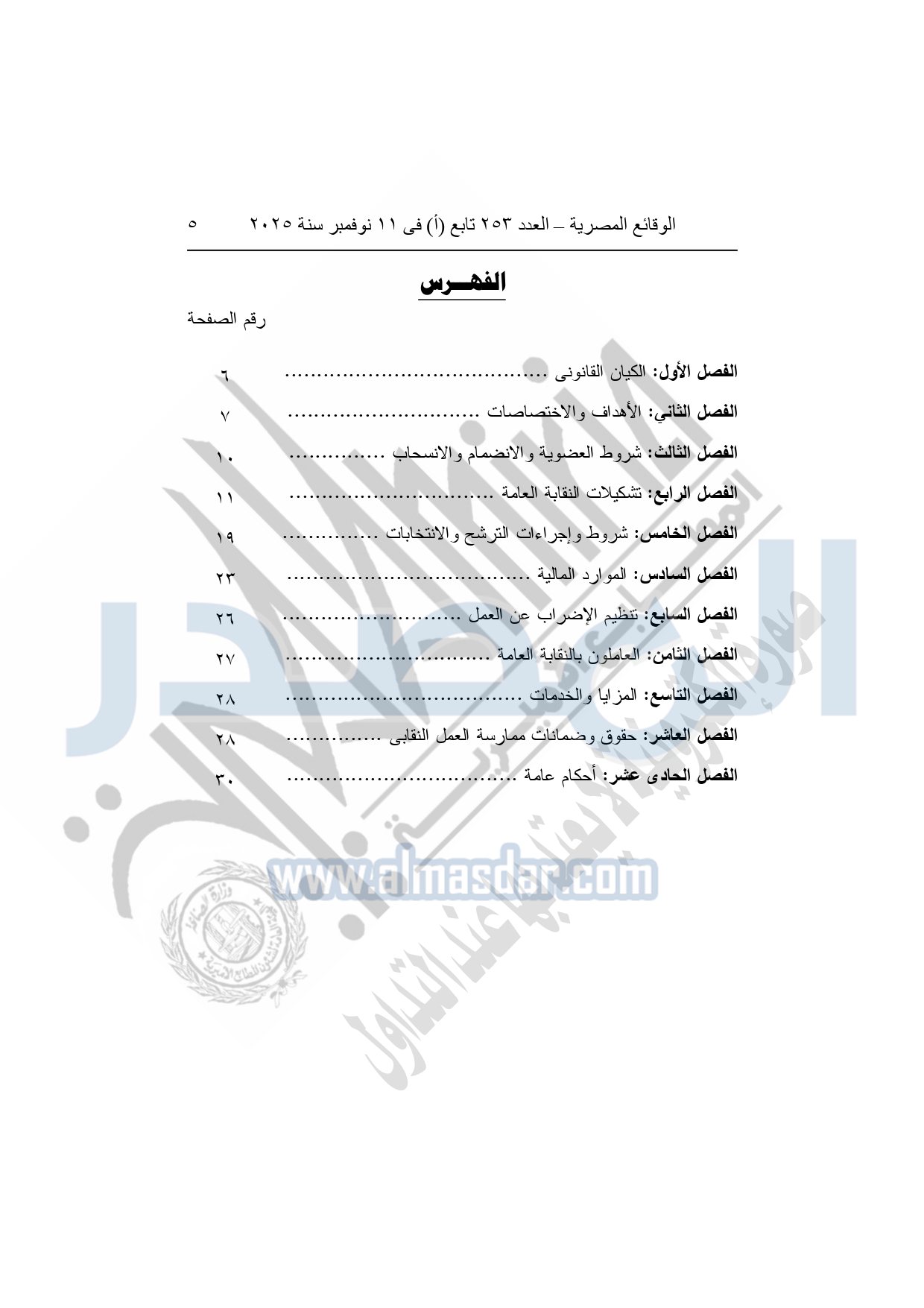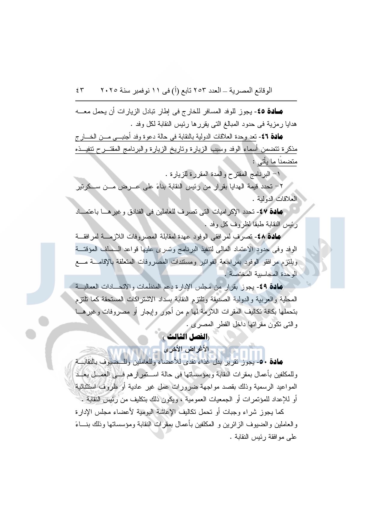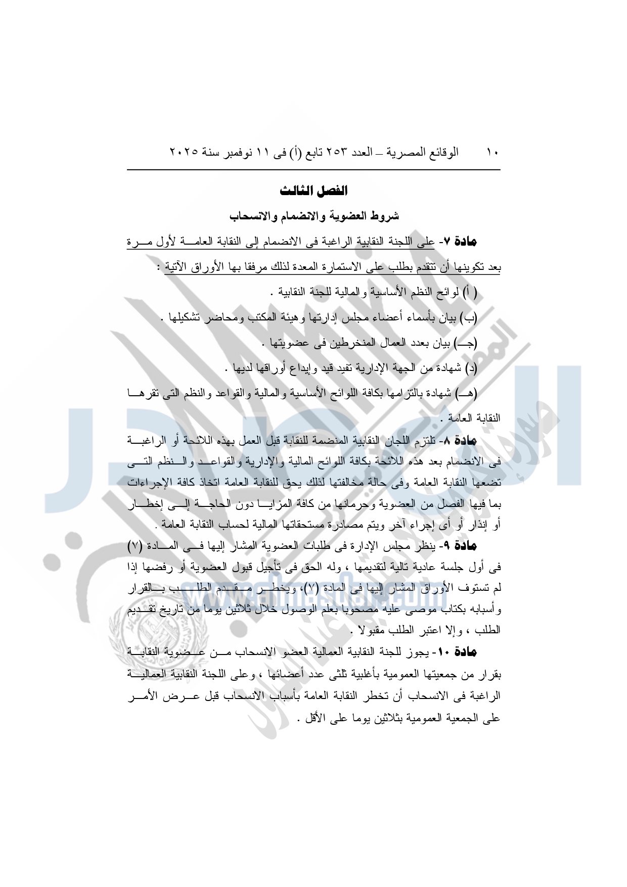 نشرت الوقائع المصرية في العدد 253 تابع "أ"، الصادر في 11 نوفمبر 2025، قرارات الجمعية العمومية العادية للنقابة العامة للعاملين بالغزل والنسيج والملابس الجاهزة وحلج وكبس القطن، المنعقدة بتاريخ 23-4-2025، بشأن تعديل لائحة النقابة العامة للعاملين بالغزل والنسيج والملابس الجاهزة.