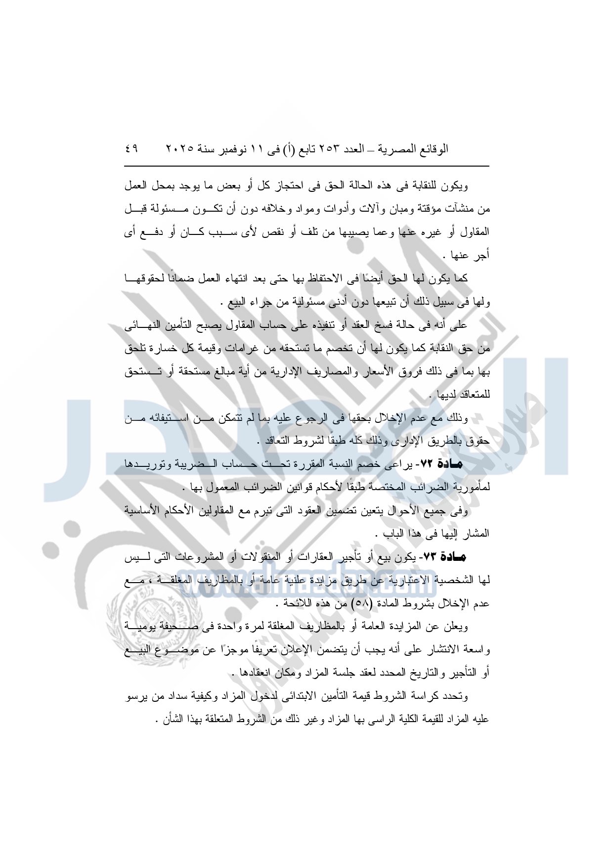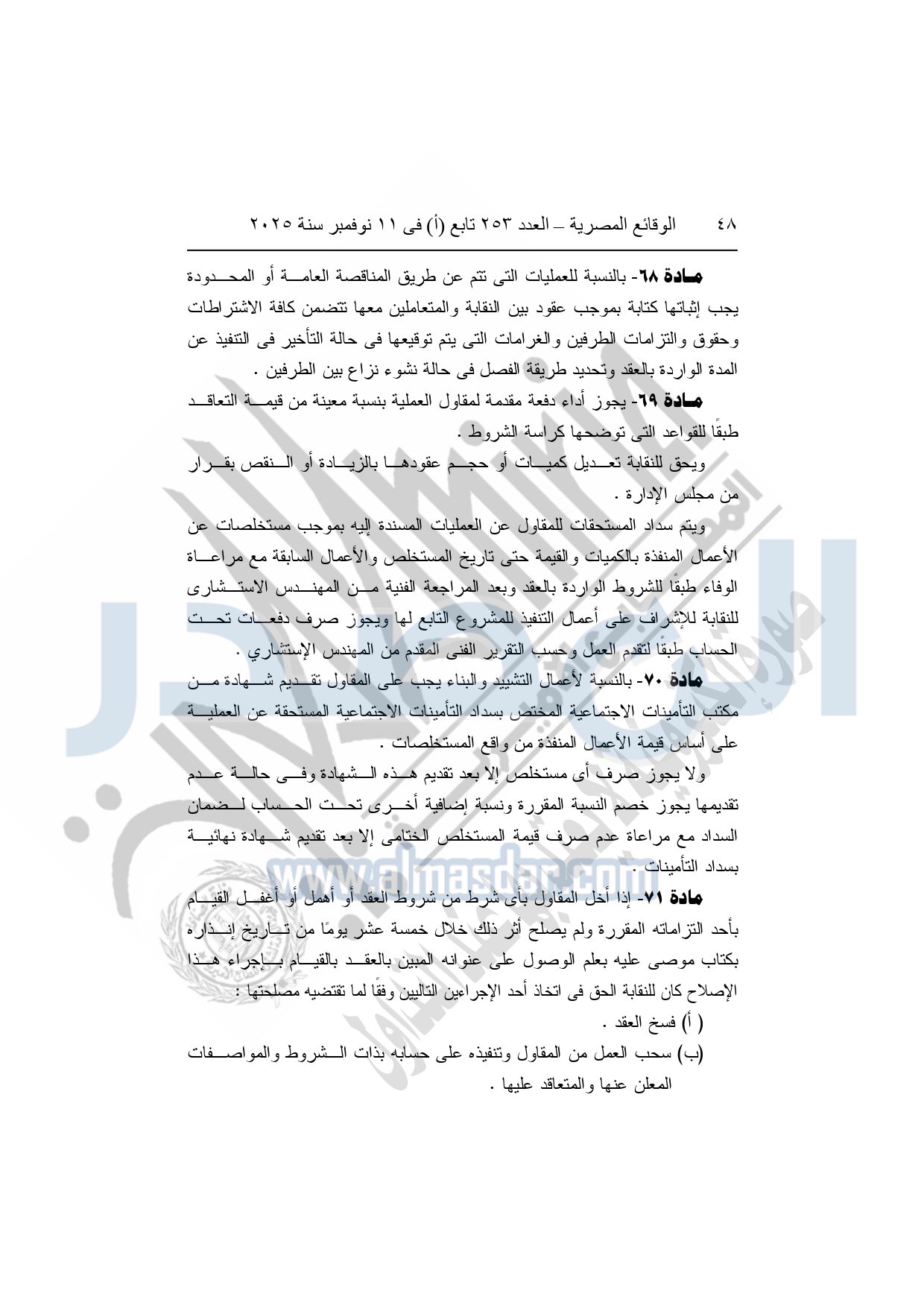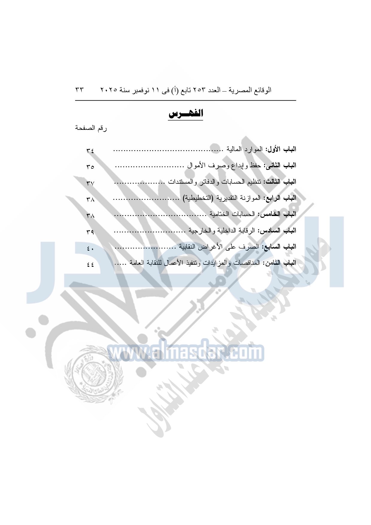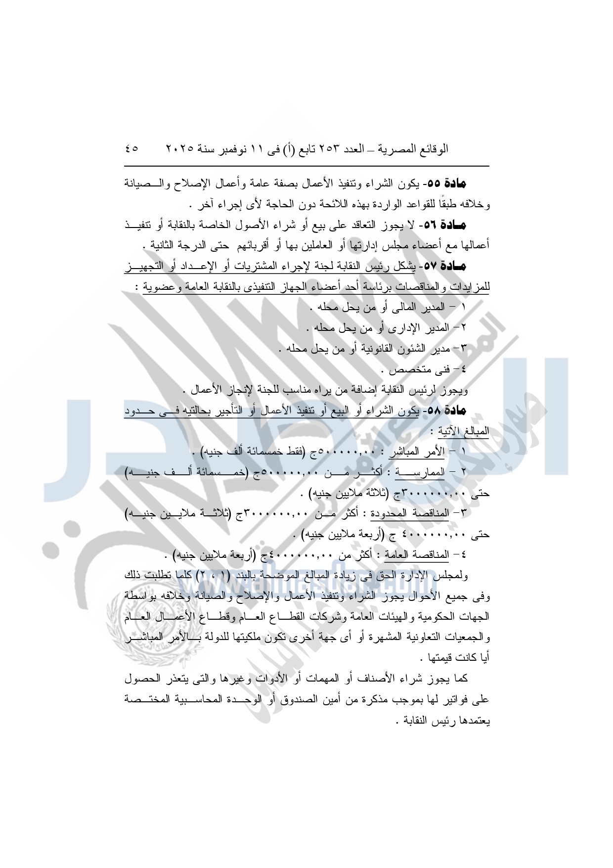 نشرت الوقائع المصرية في العدد 253 تابع "أ"، الصادر في 11 نوفمبر 2025، قرارات الجمعية العمومية العادية للنقابة العامة للعاملين بالغزل والنسيج والملابس الجاهزة وحلج وكبس القطن، المنعقدة بتاريخ 23-4-2025، بشأن تعديل لائحة النقابة العامة للعاملين بالغزل والنسيج والملابس الجاهزة.