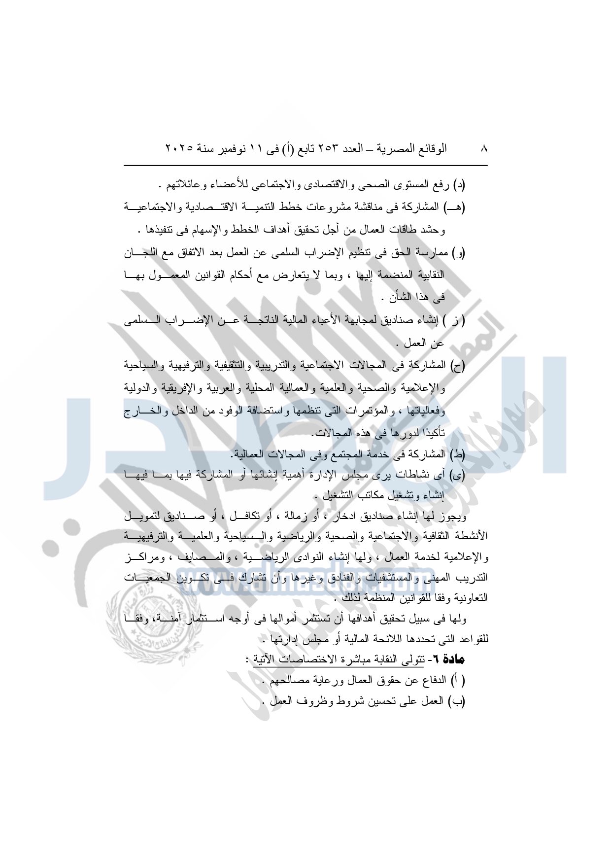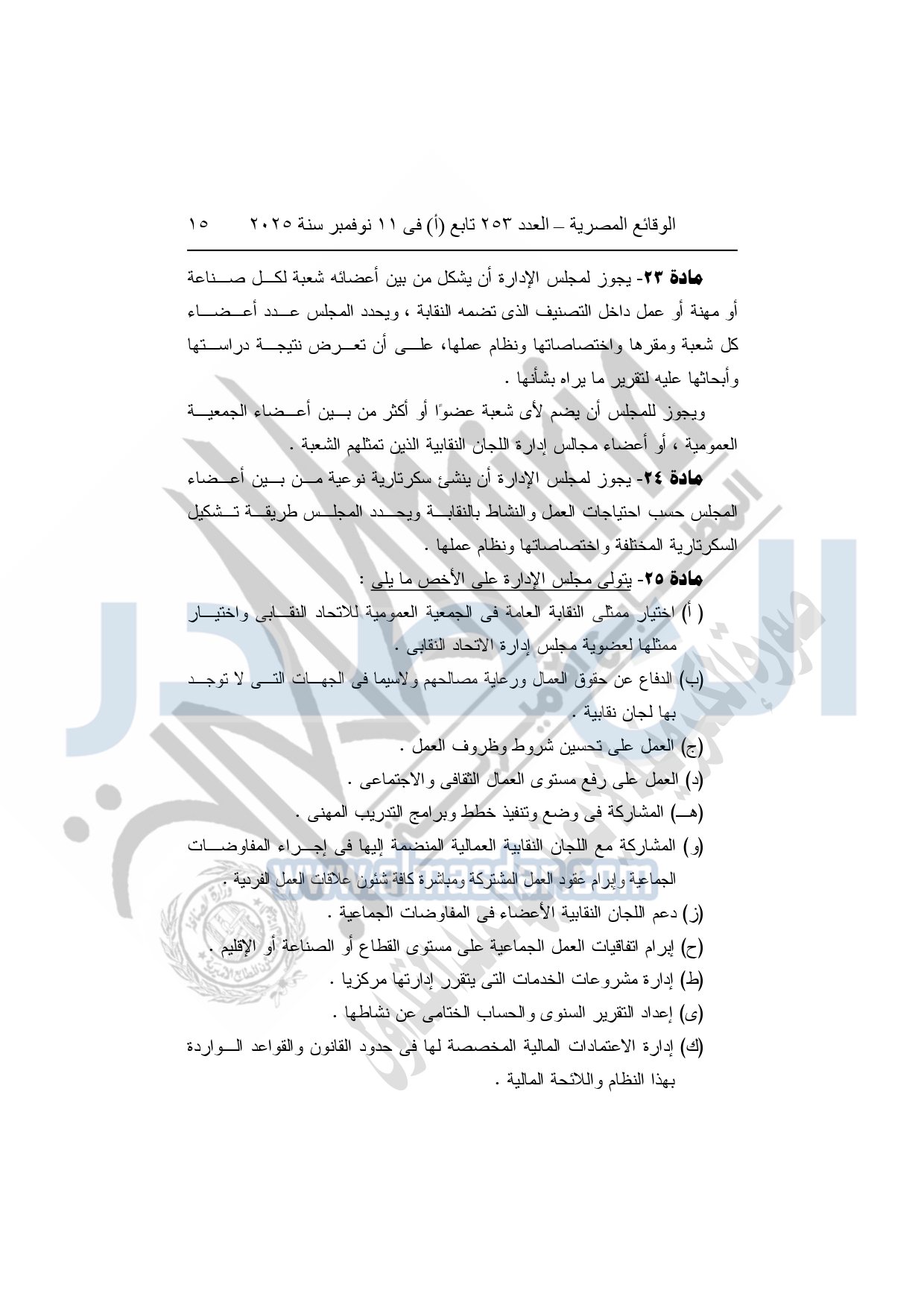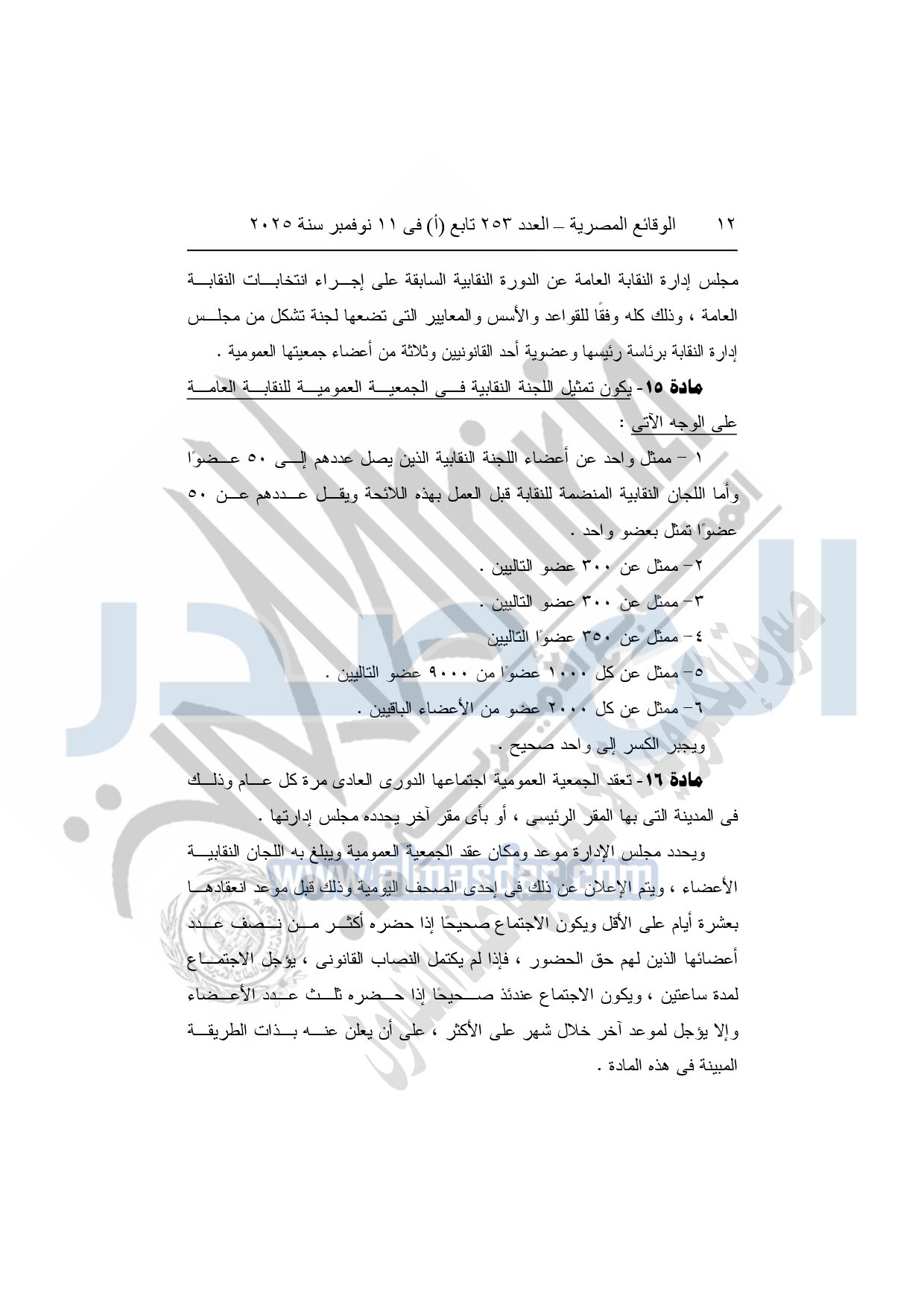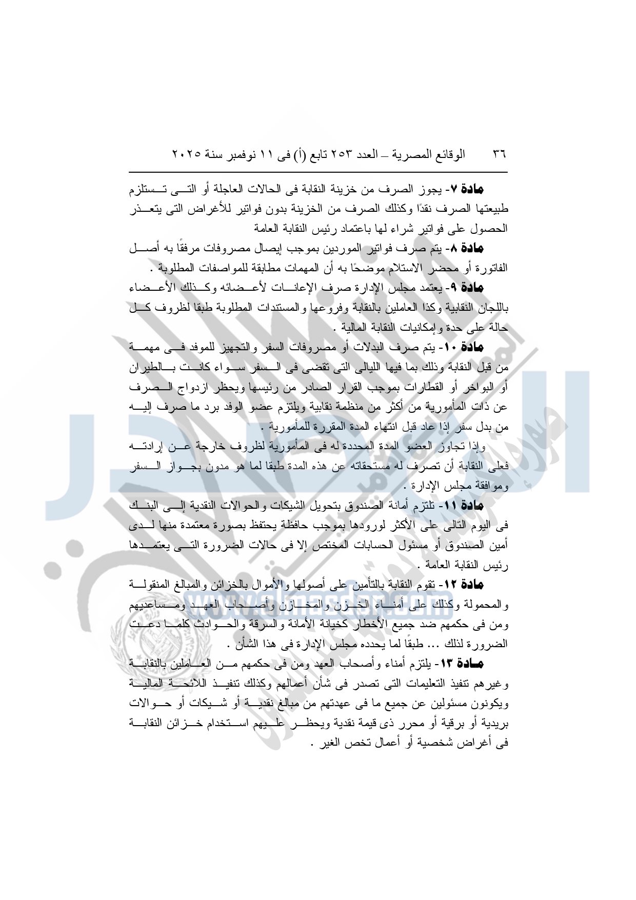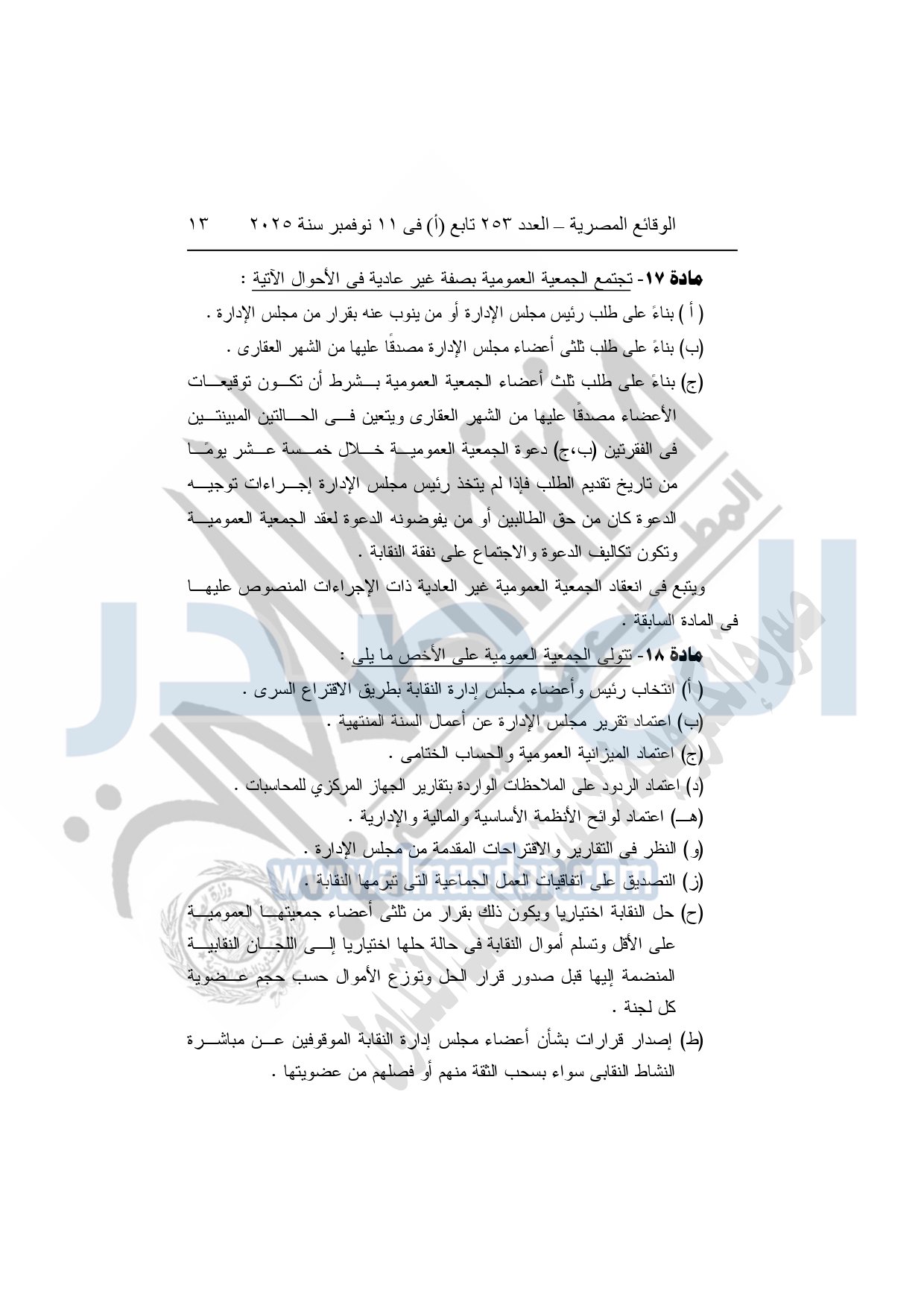 وقررت الجمعية، اعتماد إجراء التعديلات على بعض مواد لائحة النظام الأساسي والمالي للنقابة العامة على أن يتم العمل بها اعتبارا من 23-4-2025 وكذلك نشرها بالجريدة الرسمية.