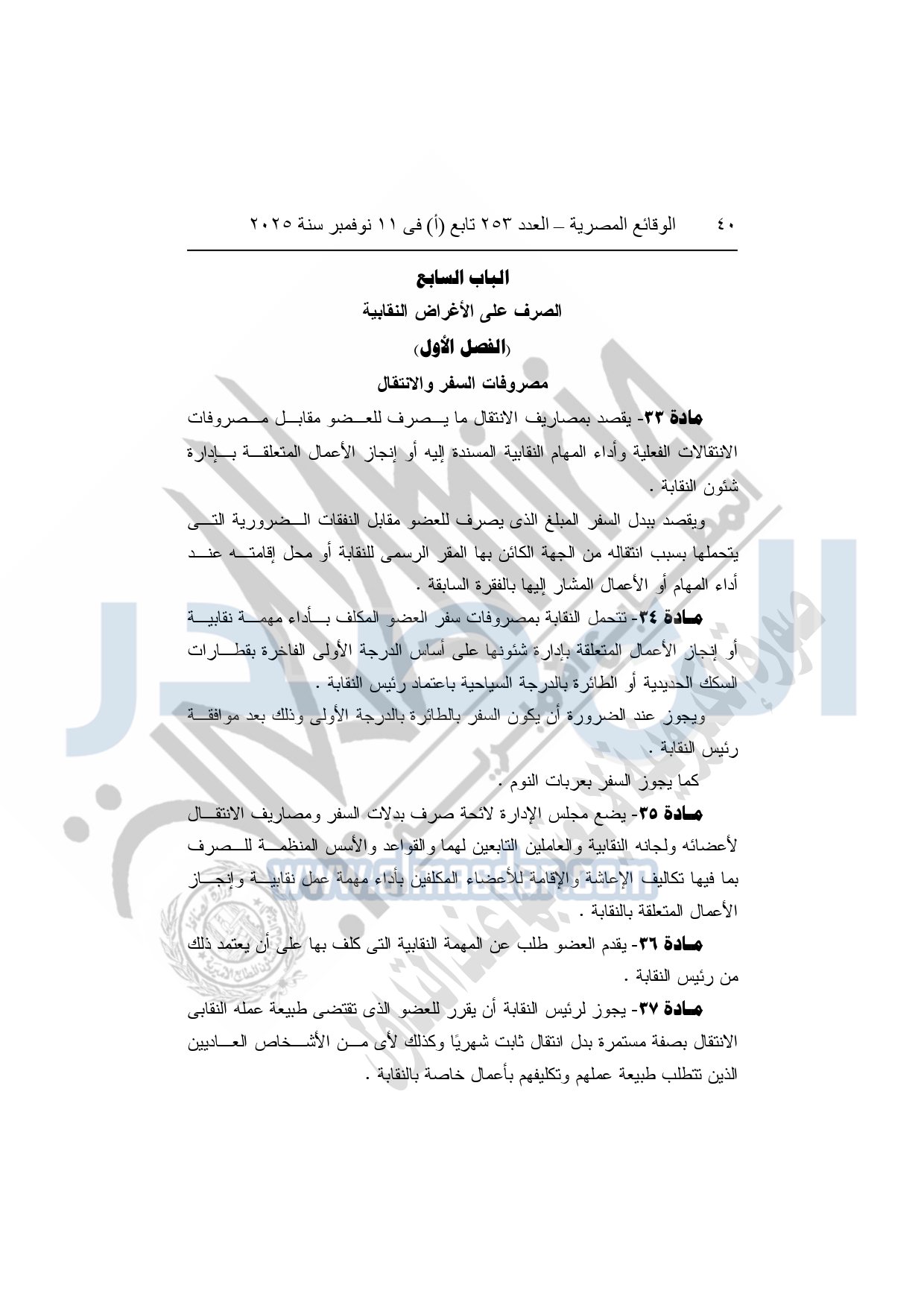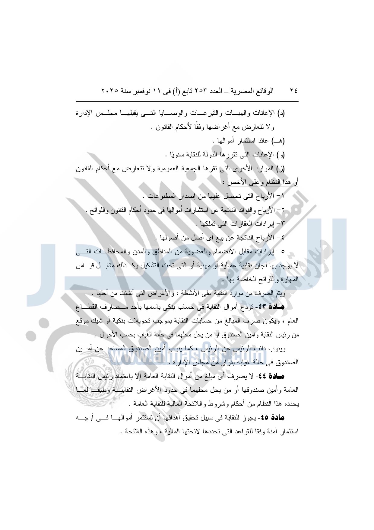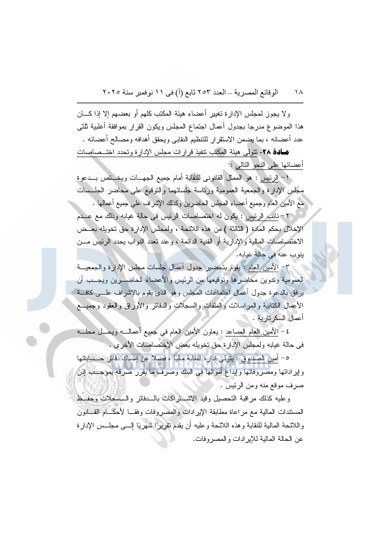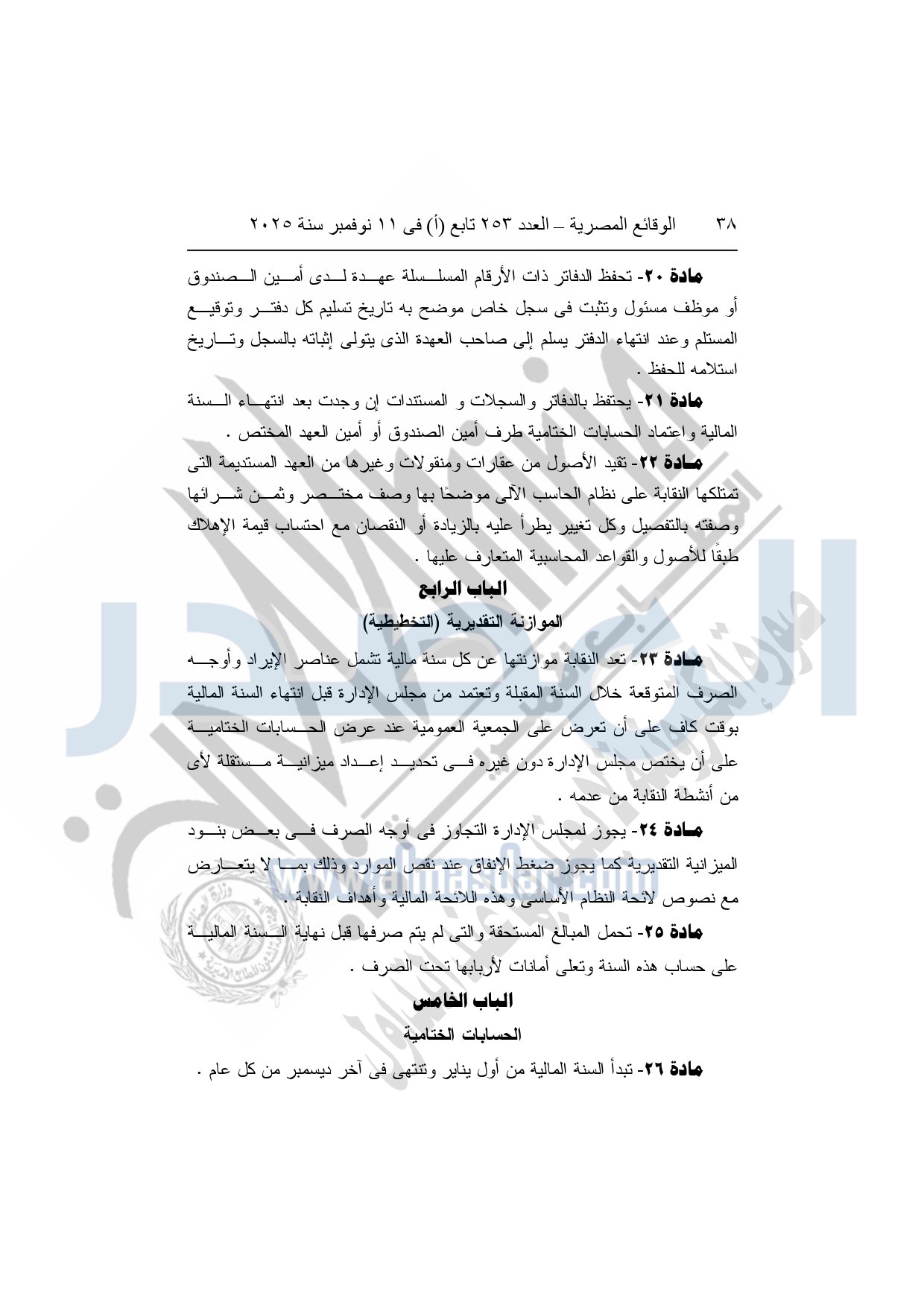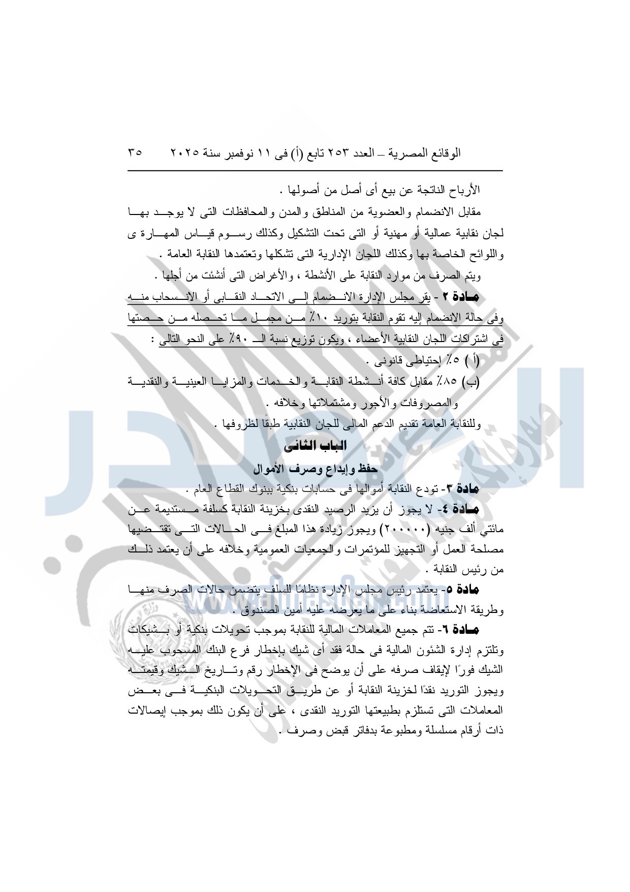وقررت الجمعية، اعتماد إجراء التعديلات على بعض مواد لائحة النظام الأساسي والمالي للنقابة العامة على أن يتم العمل بها اعتبارا من 23-4-2025 وكذلك نشرها بالجريدة الرسمية.