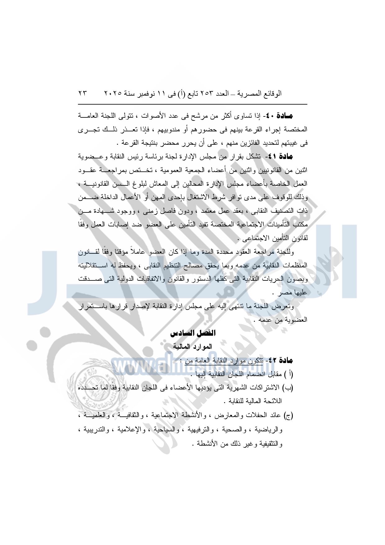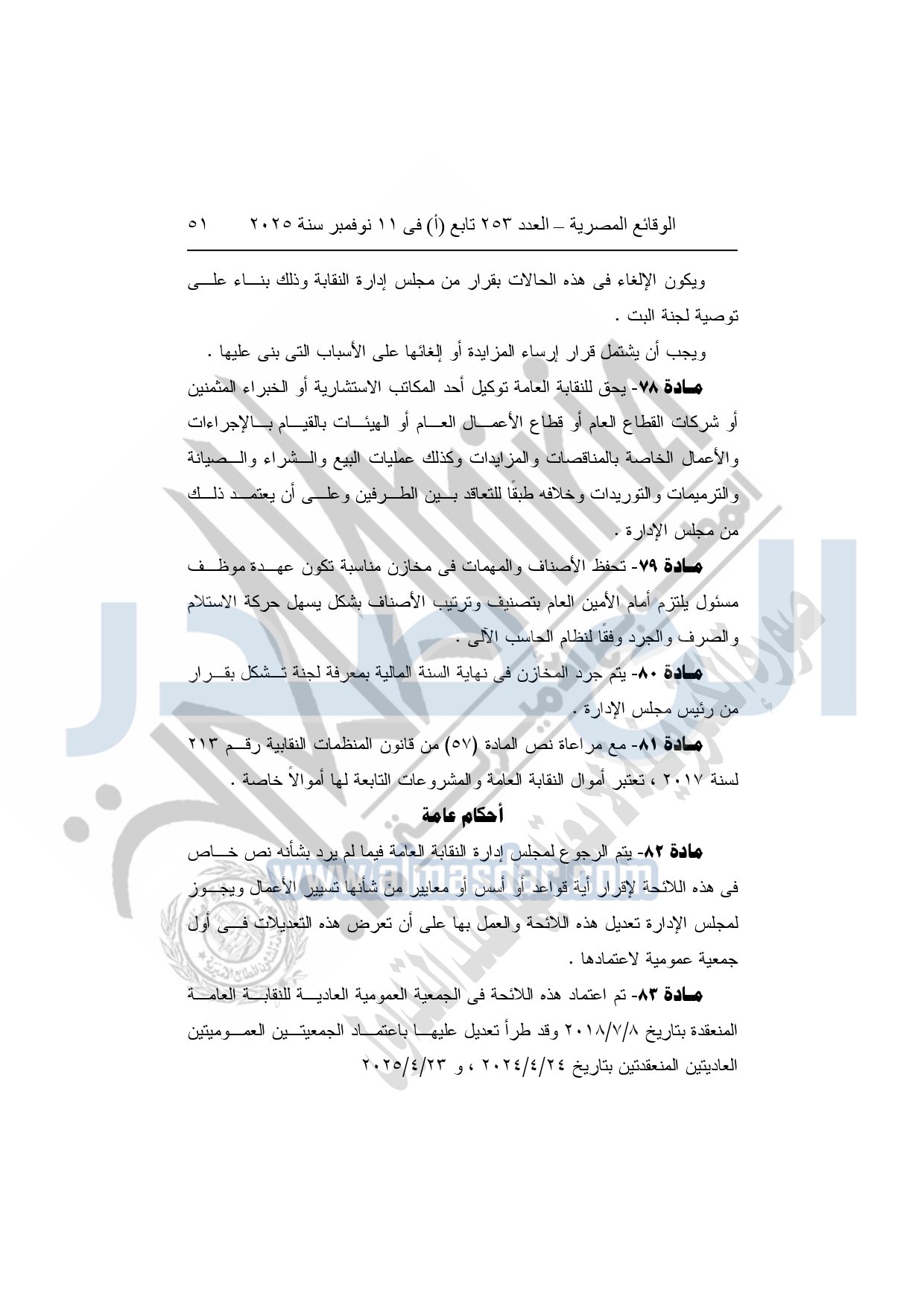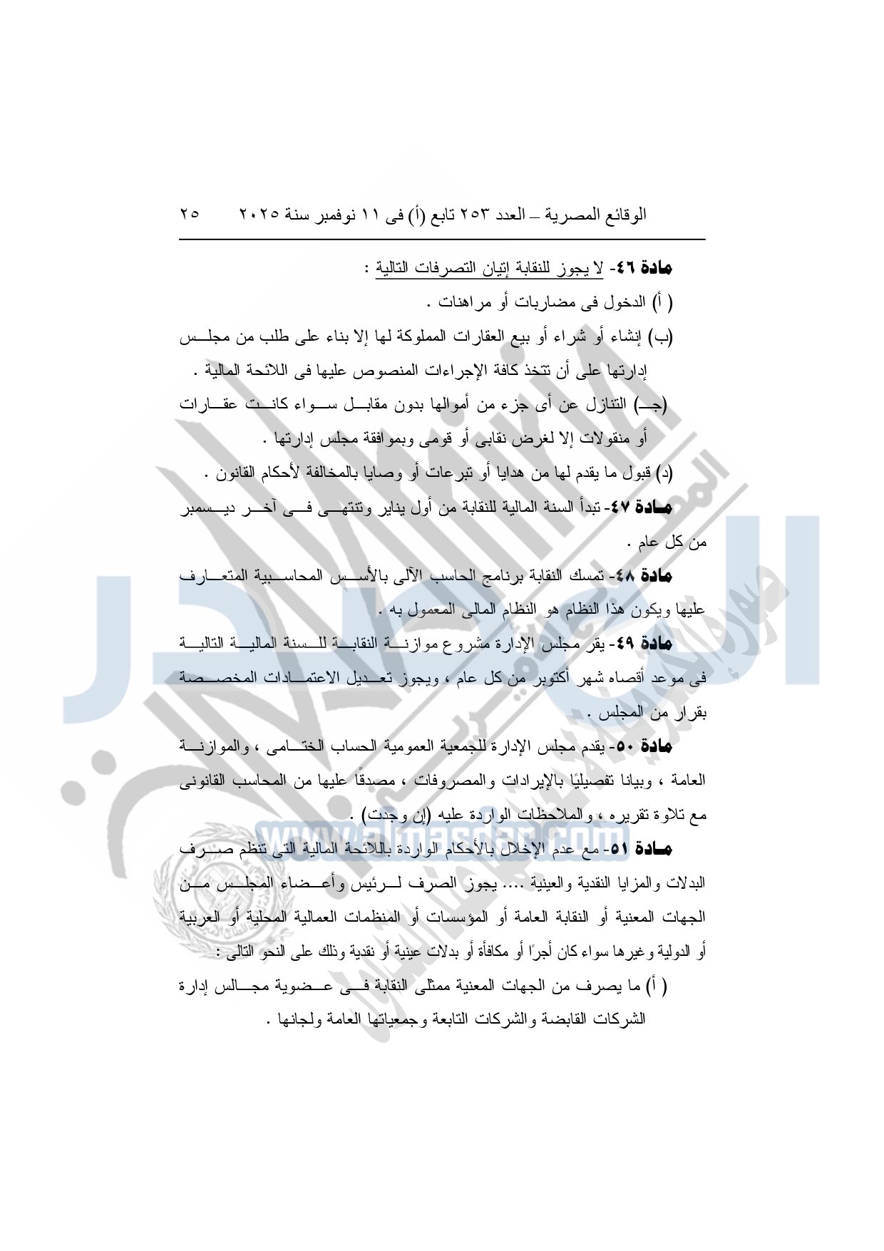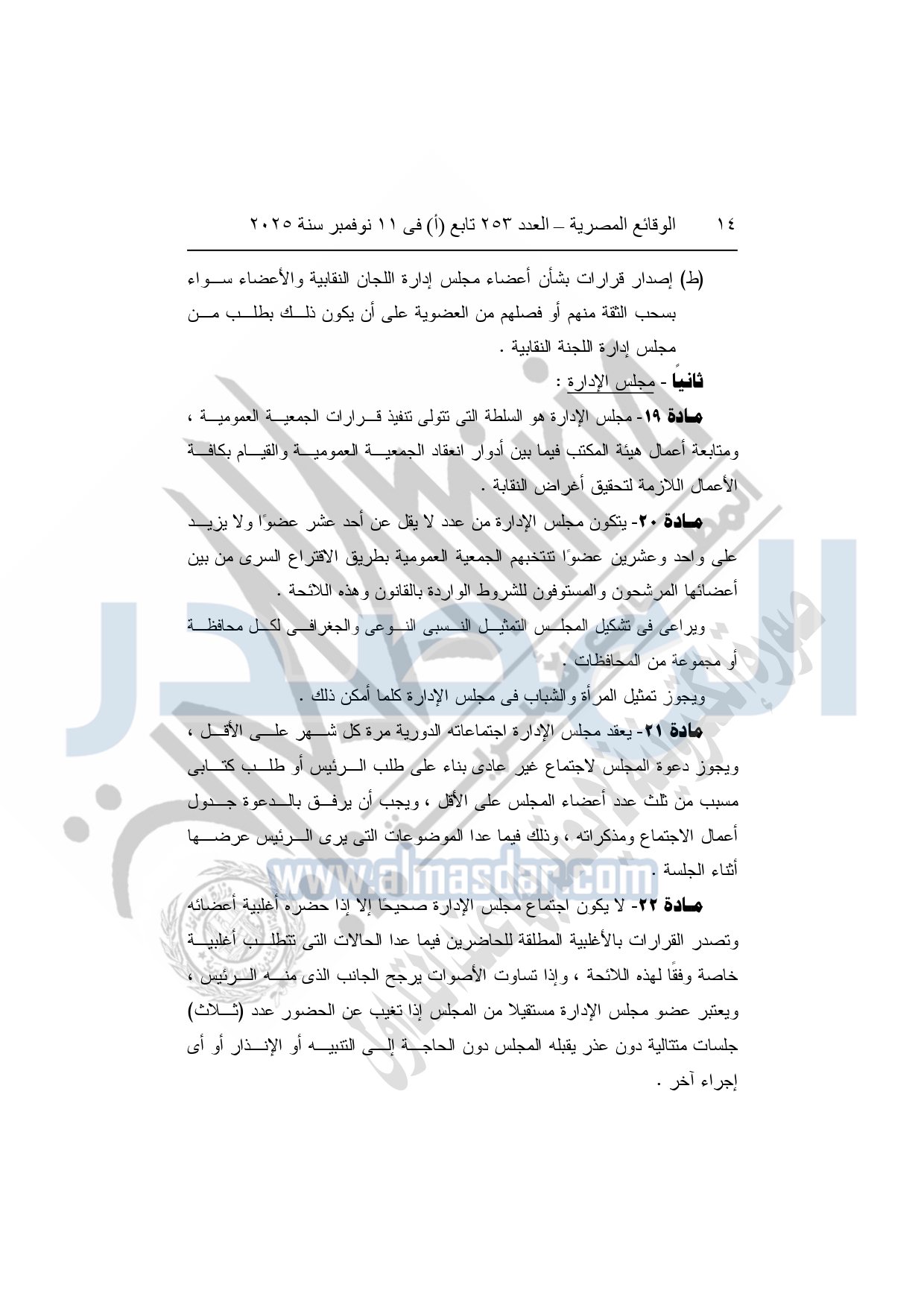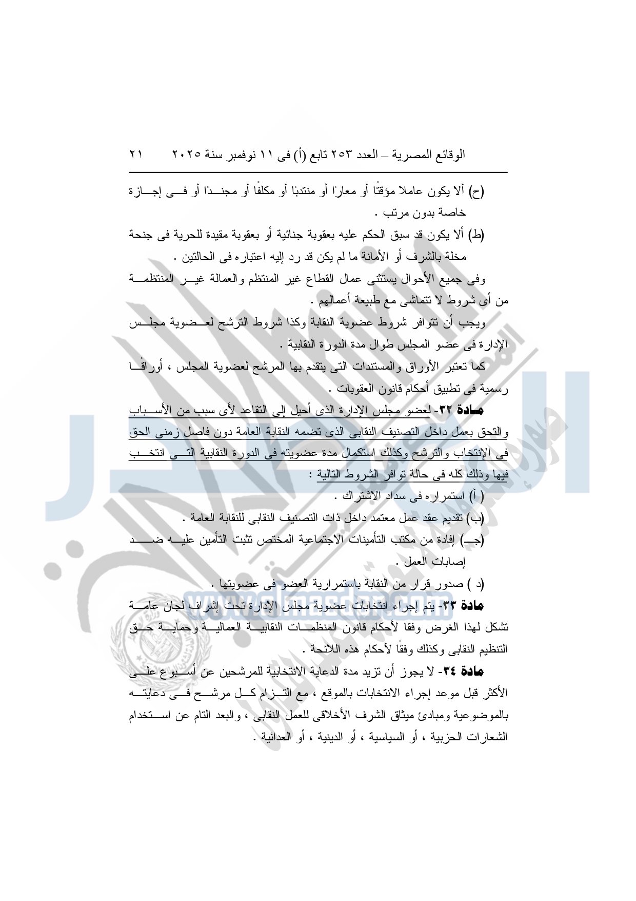 وقررت الجمعية، اعتماد إجراء التعديلات على بعض مواد لائحة النظام الأساسي والمالي للنقابة العامة على أن يتم العمل بها اعتبارا من 23-4-2025 وكذلك نشرها بالجريدة الرسمية.