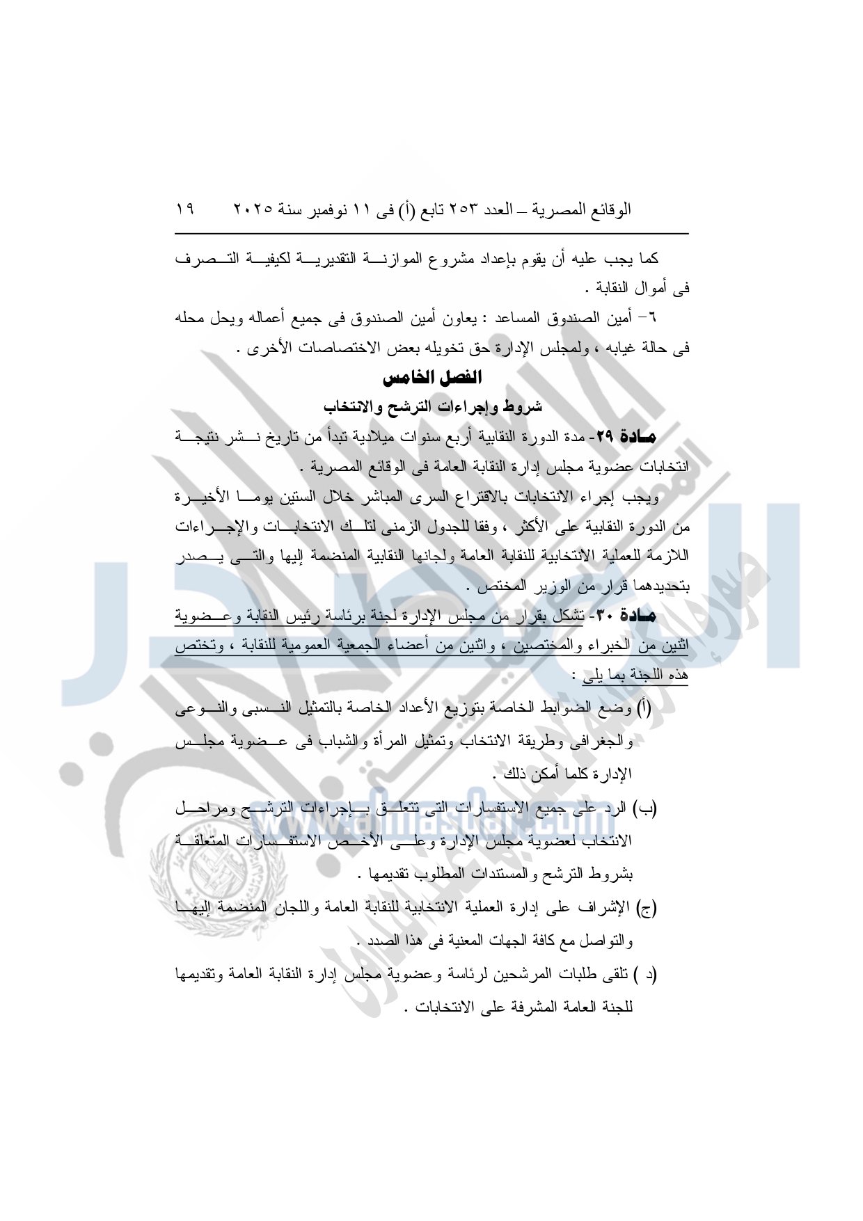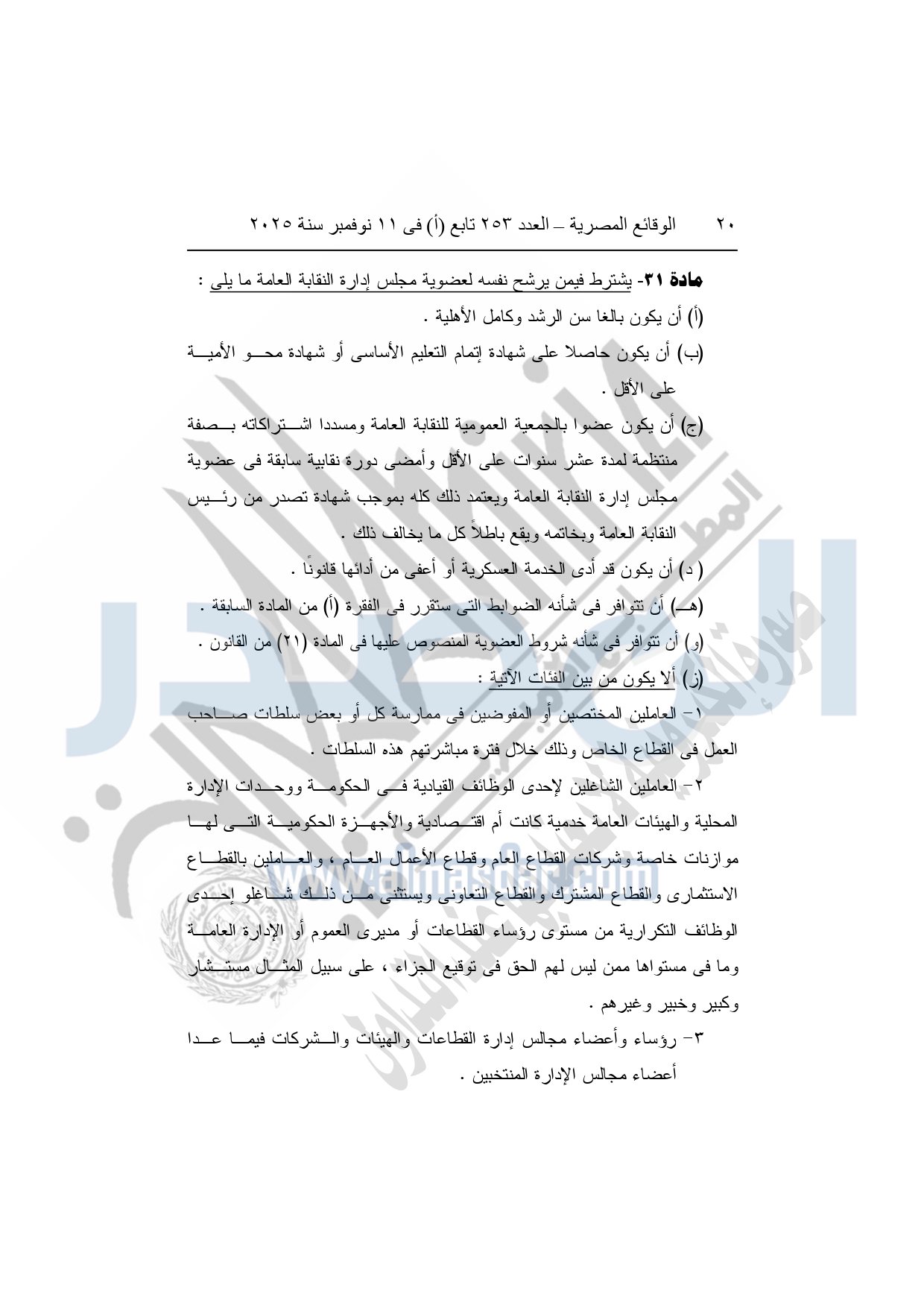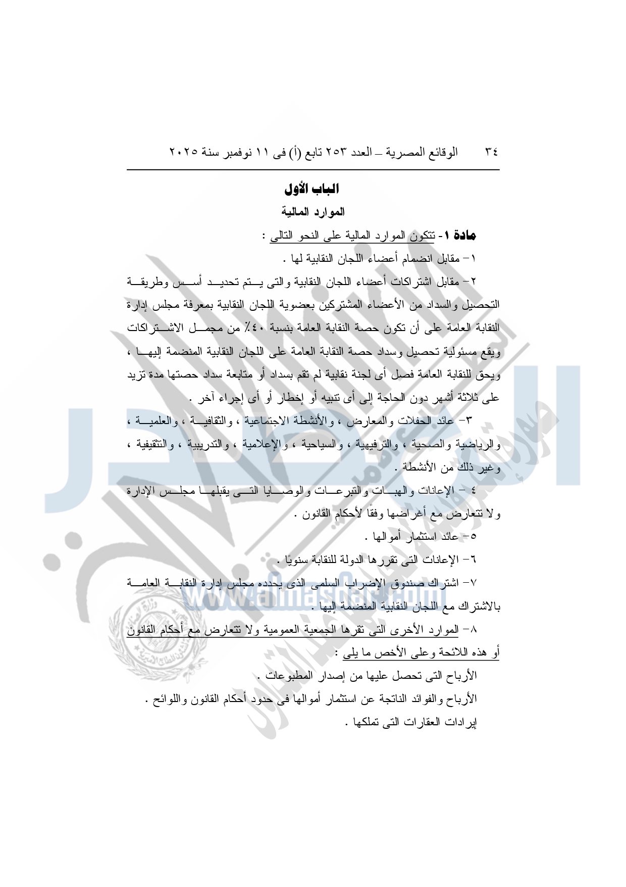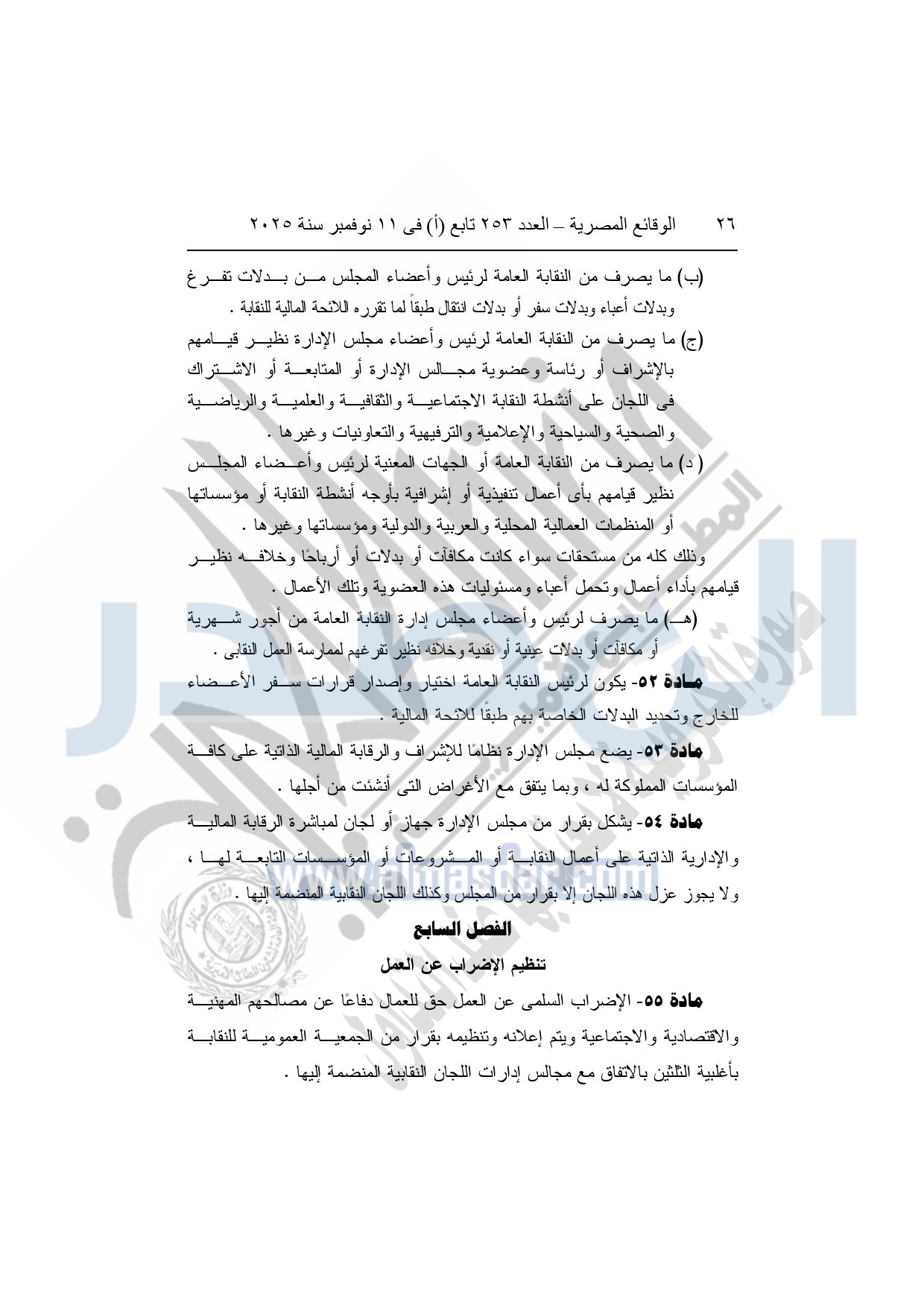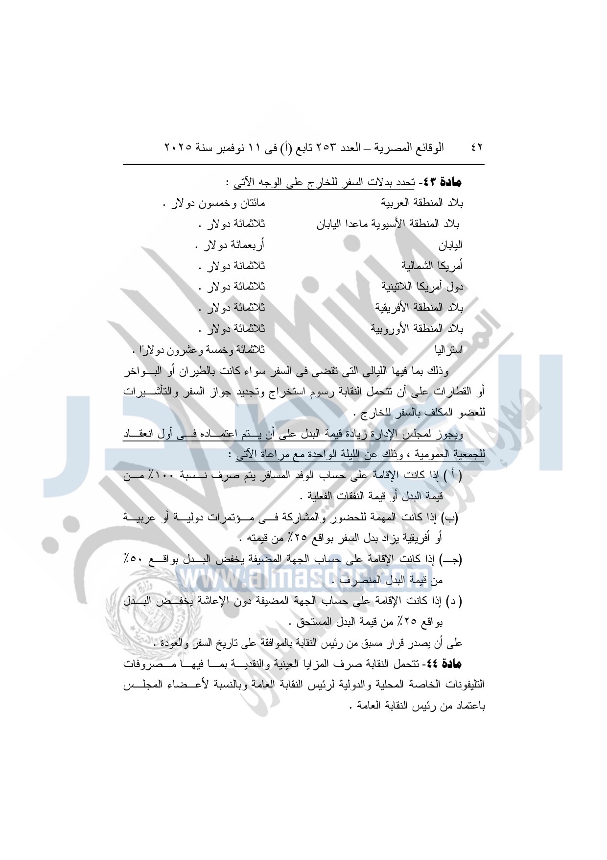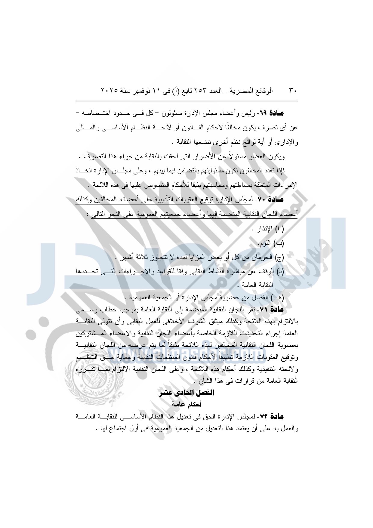 وقررت الجمعية، اعتماد إجراء التعديلات على بعض مواد لائحة النظام الأساسي والمالي للنقابة العامة على أن يتم العمل بها اعتبارا من 23-4-2025 وكذلك نشرها بالجريدة الرسمية.