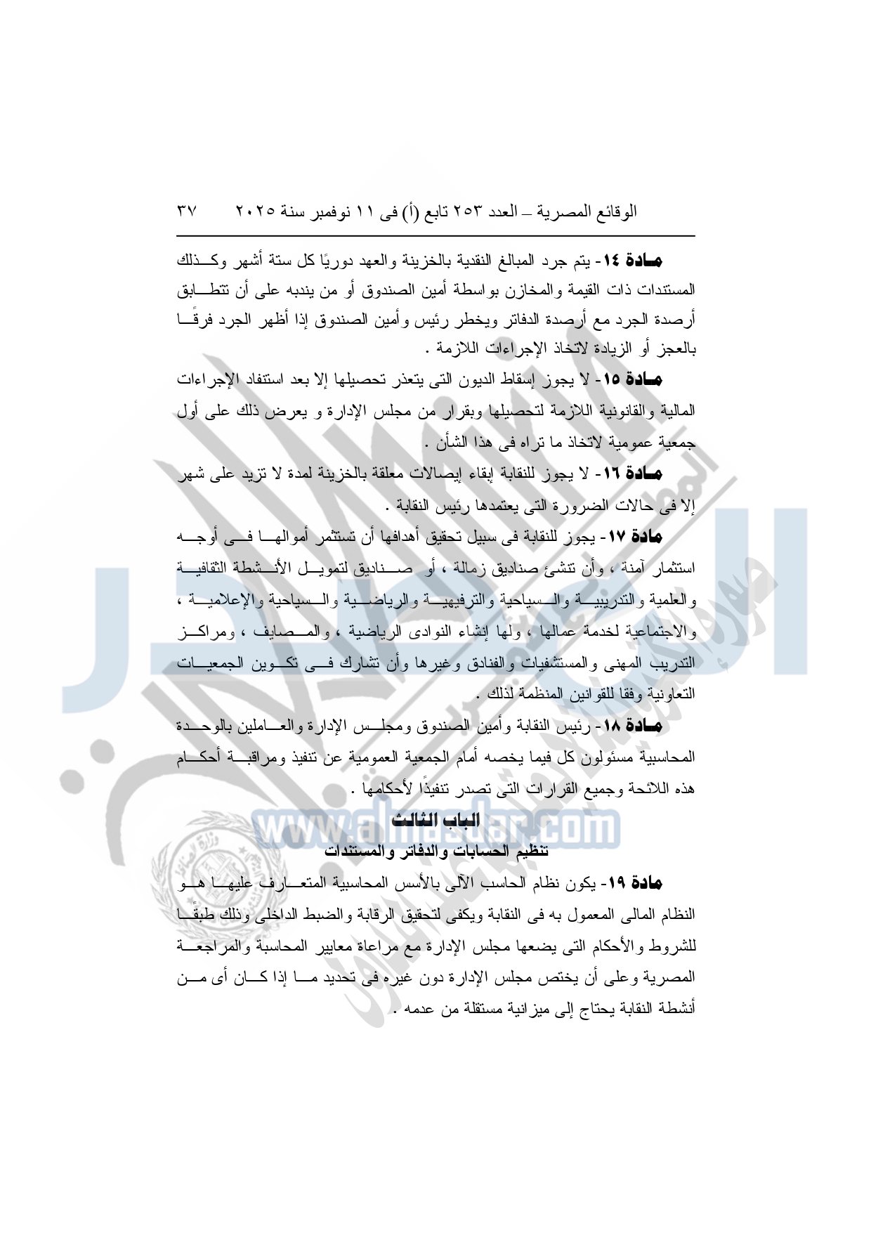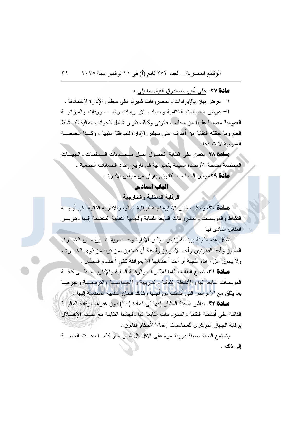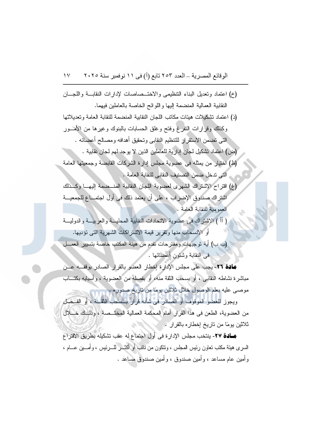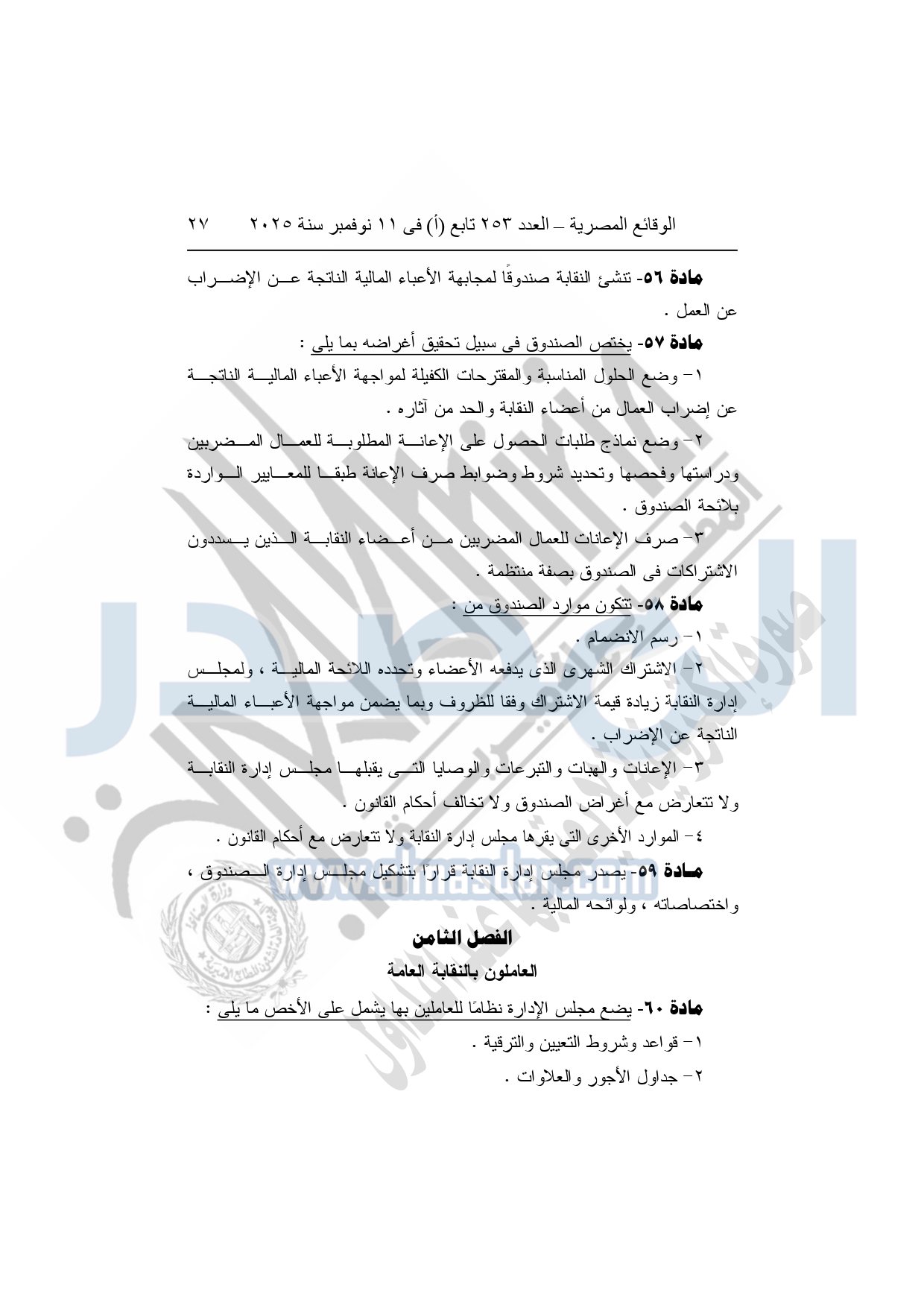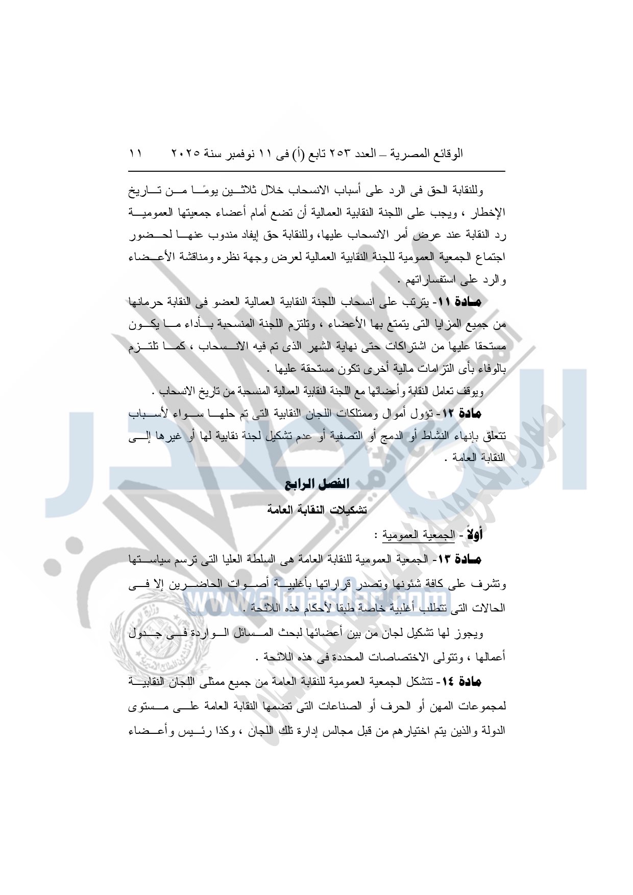 وقررت الجمعية، اعتماد إجراء التعديلات على بعض مواد لائحة النظام الأساسي والمالي للنقابة العامة على أن يتم العمل بها اعتبارا من 23-4-2025 وكذلك نشرها بالجريدة الرسمية.