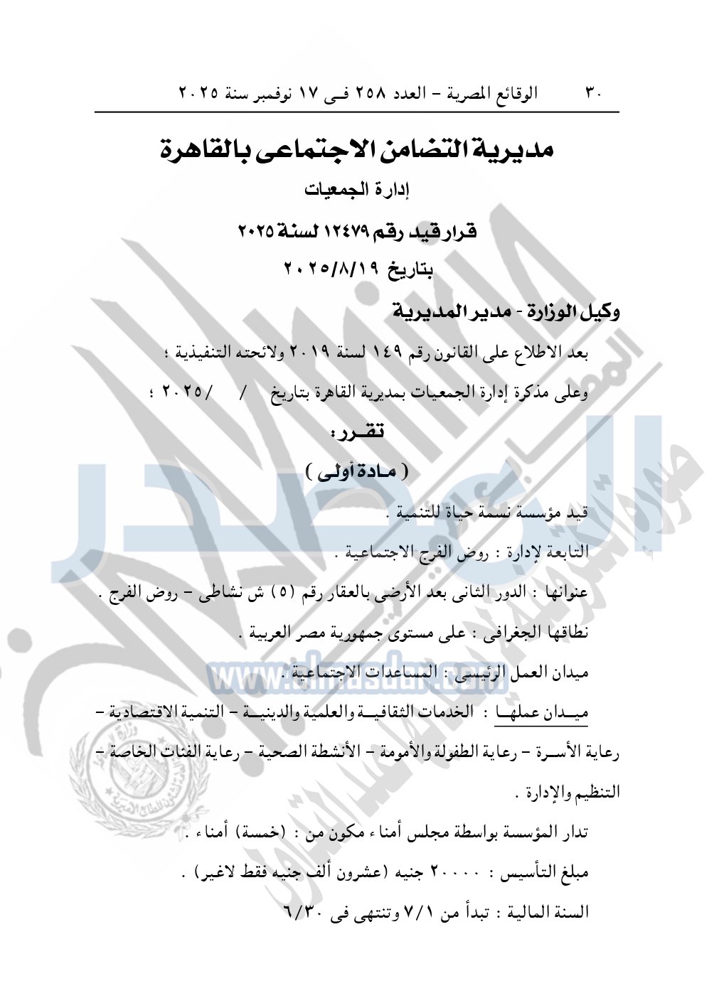 نشرت الوقائع المصرية في العدد 258، بتاريخ 17 نوفمبر 2025، قرار مديرية التضامن الاجتماعي بالقاهرة، قيد رقم 12479 لسنة 2025، بتاريخ 19-8-2025، بشأن قيد مؤسسة نسمة حياة للتنمية.