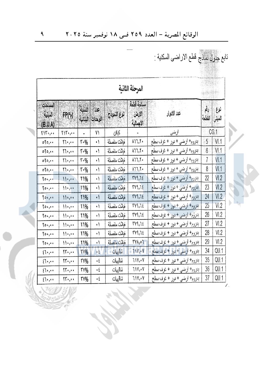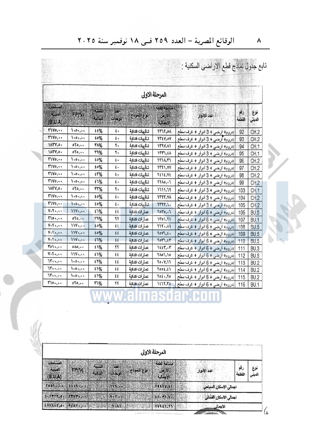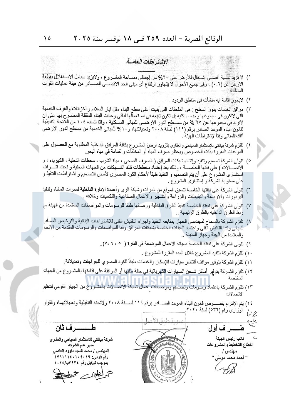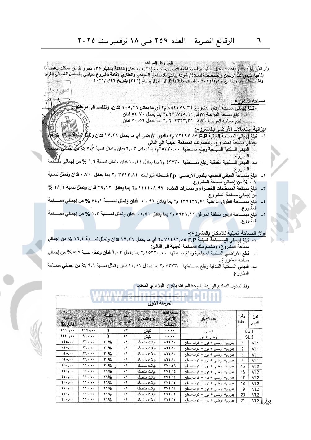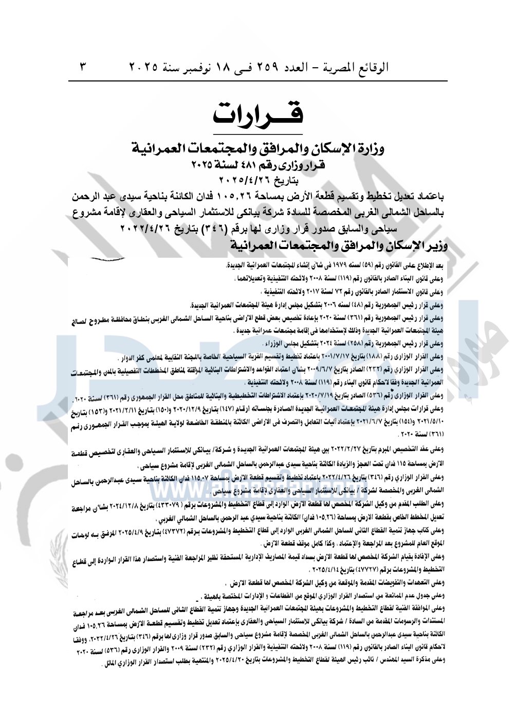 نشرت الوقائع المصرية في العدد 259، الصادر في 18 نوفمبر سنة 2025، قرار وزارة الإسكان والمرافق والمجتمعات العمرانية، رقم 481 لسنة 2025 بتاريخ 26-4-2025، بشأن اعتماد تعديل تخطيط وتقسيم قطعة الأرض بمساحة 105.26 فدان الكائنة بناحية سيدى عبد الرحمن بالساحل الشمالي الغربي المخصصة لـ شركة بيانكي للاستثمار السياحي والعقاري لإقامة مشروع سياحي.
