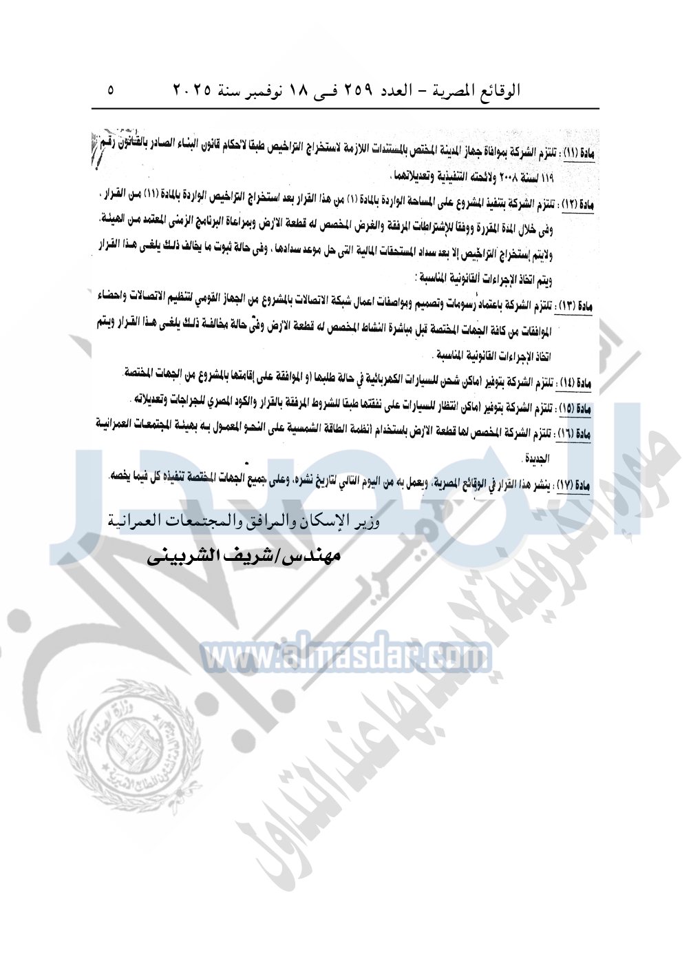 يعتمد تعديل تخطيط وتقسيم قطعة الأرض بمساحة 105.26 فدان الكائنة بناحية سيدى عبد الرحمن بالساحل الشمالي الغربي المخصصة لـ شركة بيانكي للاستثمار السياحي والعقاري لإقامة مشروع سياحي والسابق صدور قرار وزارى لها برقم "346" بتاريخ 26-4-2022، وذلك طبقا للإشتراطات والمخطط والحدود الموضحة على الخريطة المرفقة بهذا القرار والعقد المبرم مع الشركة بتاريخ 27-2-2022، والتي تعتبر جميعها مكملة لهذا القرار.