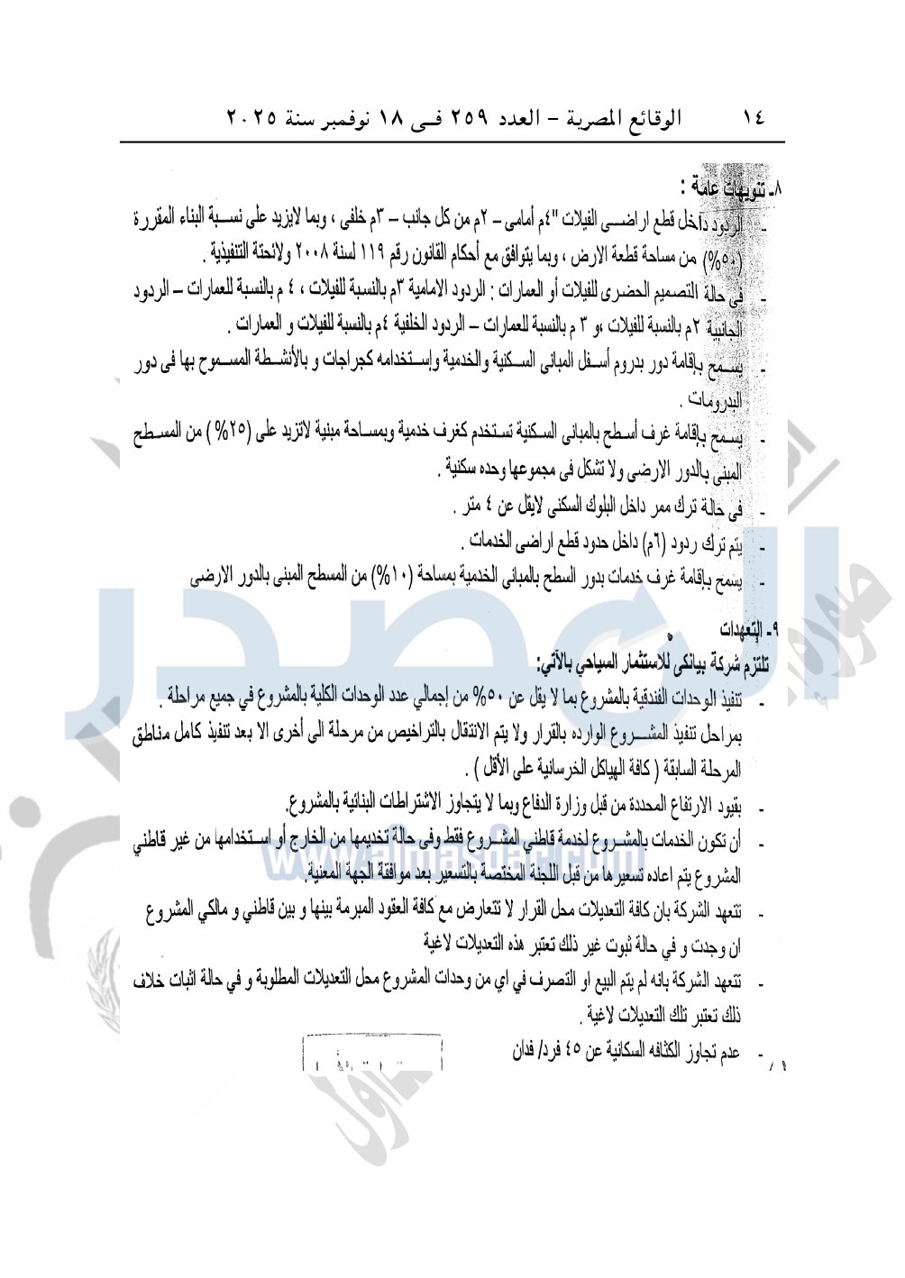 تلتزم الشركة بعدم عرض وحدات المشروع للحجز أو البيع أو الإعلان عن المشروع إلا بعد موافقة الهيئة المسبقة ووفقا للقواعد والضوابط المتبعة فى هذا الشأن، مع الإلتزام بقرار رئيس مجلس الوزراء رقم "2184" لسنة 2022 الخاص بضوابط بيع وحدات مشروعات التطوير العقارى وإعداد ملحق للعقد المبرم وفى حالة مخالفة ذلك يتم إلغاء هذا القرار واتخاذ الإجراءات القانونية المناسبة في هذا الشأن.