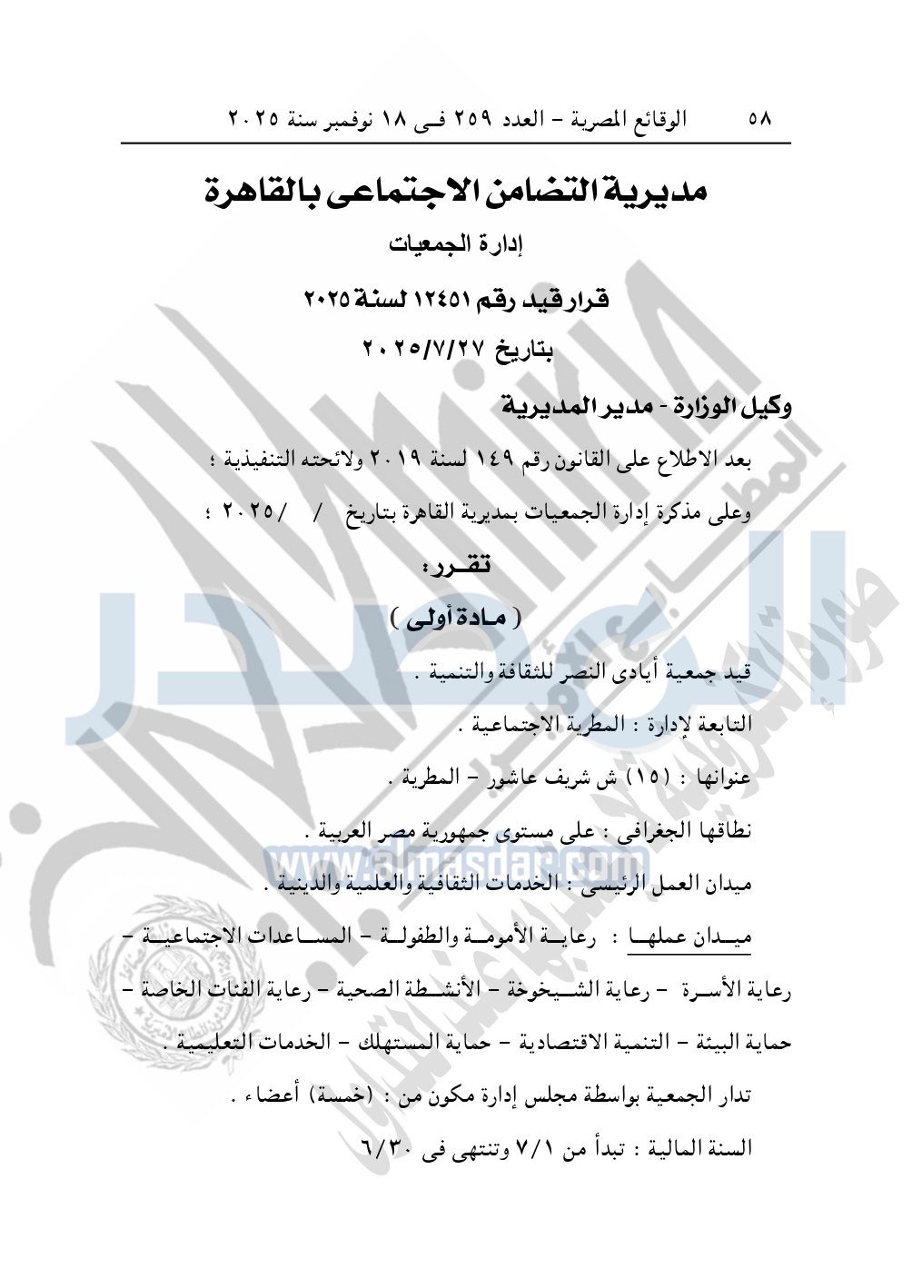 نشرت الوقائع المصرية في العدد 259، بتاريخ 18 نوفمبر 2025، قرار مديرية التضامن الاجتماعي بالقاهرة، قيد رقم 12451 لسنة 2025، بتاريخ 27-7-2025، بشأن قيد جمعية أيادي النصر للثقافة والتنمية.