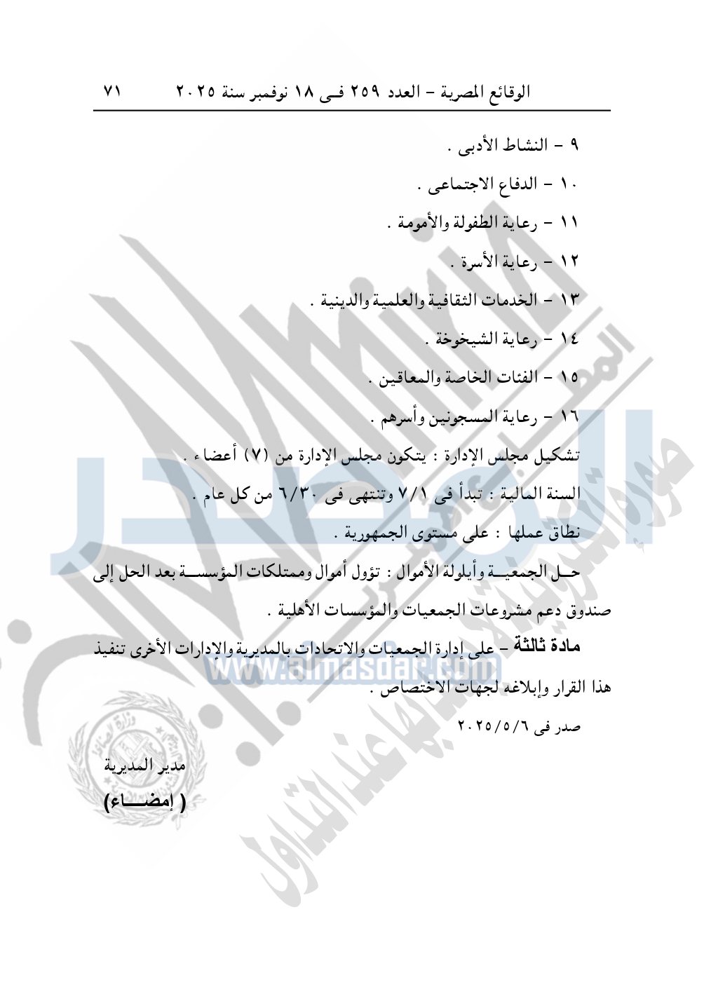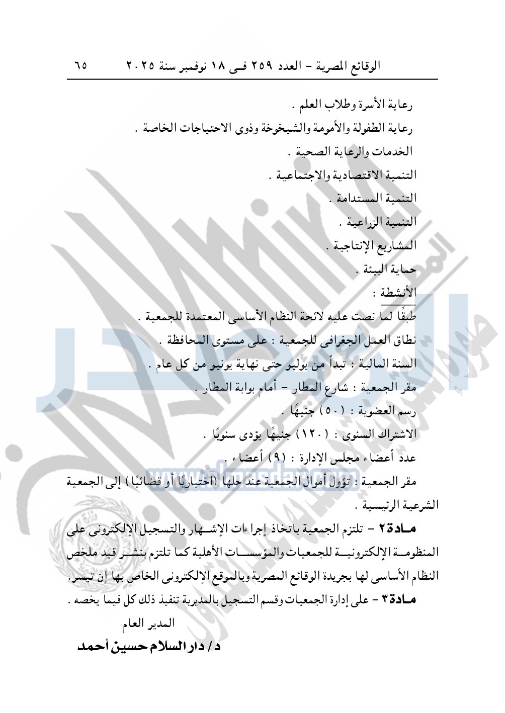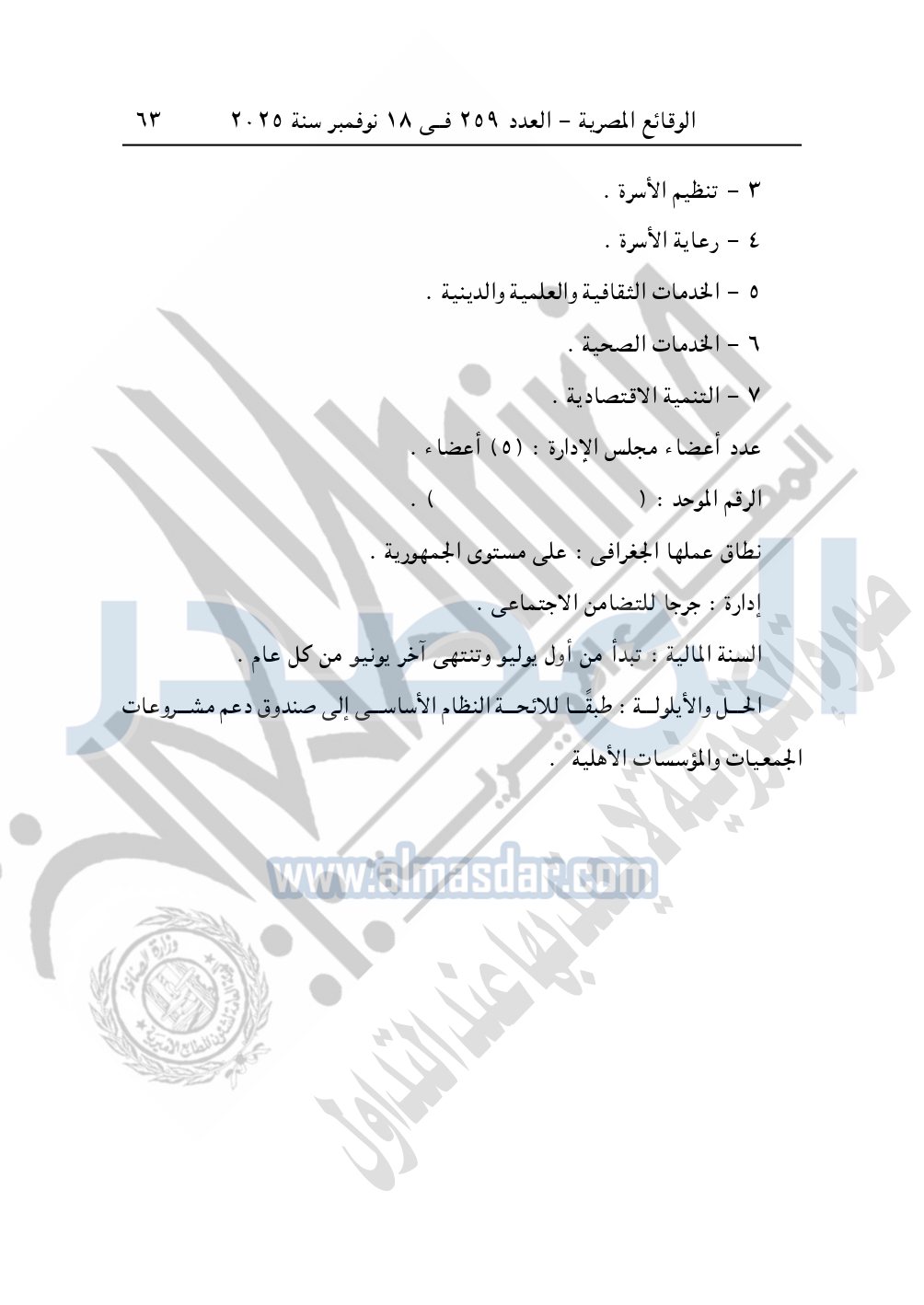 وأيضا نشرت الوقائع المصرية في العدد 259، بتاريخ 18 نوفمبر 2025، قرار مديرية التضامن الاجتماعي بسوهاج، قيد رقم 1854 لسنة 2025، بشأن قيد جمعية مسك الختام للتنمية والأعمال الخيرية بجرجا.