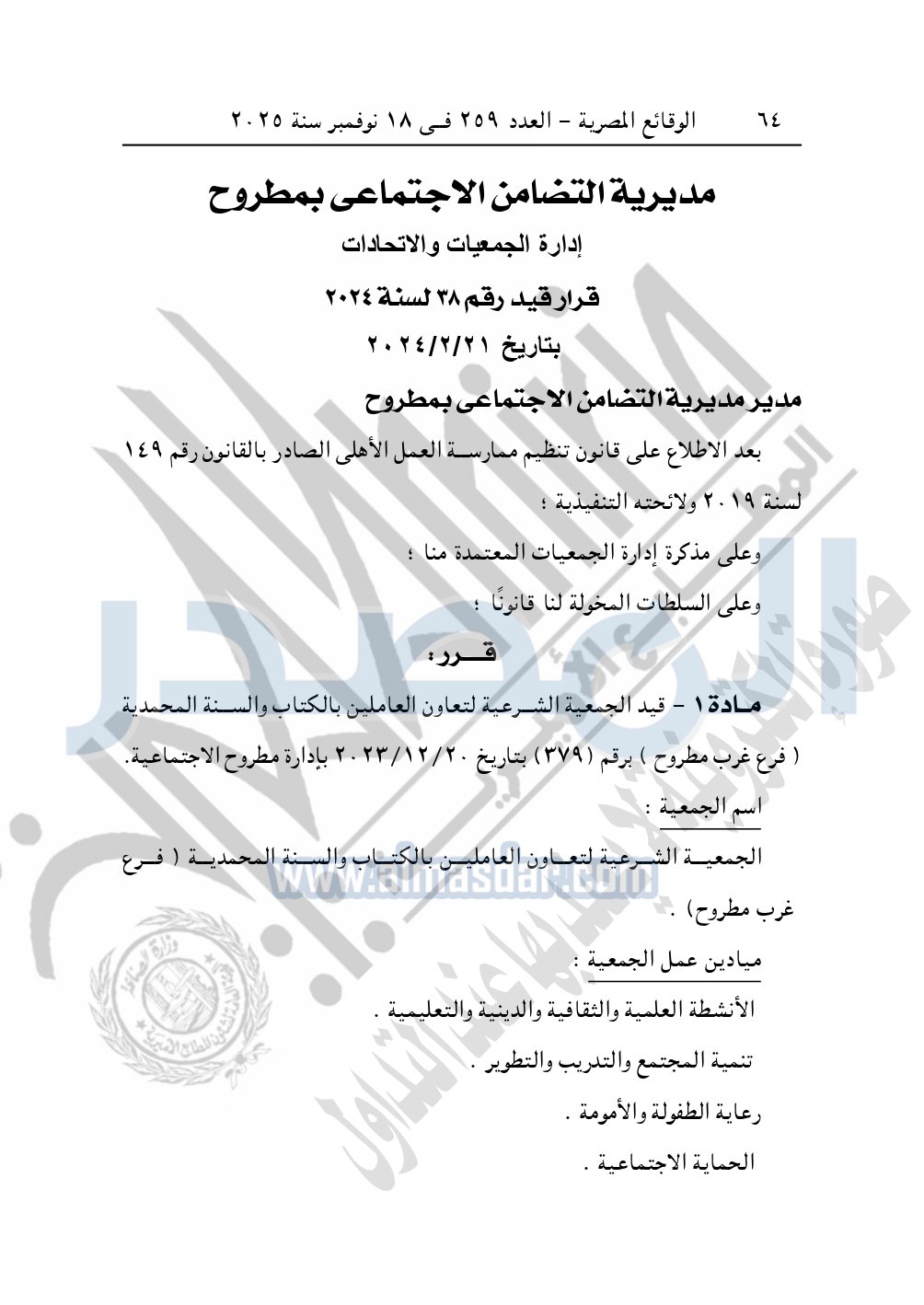 كما نشرت الوقائع المصرية في العدد 259، بتاريخ 18 نوفمبر 2025، قرار مديرية التضامن الاجتماعي بمطروح، قيد رقم 38 لسنة 2024، بتاريخ 21-2-2024، بشأن قيد الجمعية الشرعية لتعاون العاملين بالكتاب والسنة المحمدية "فرع غرب مطروح".