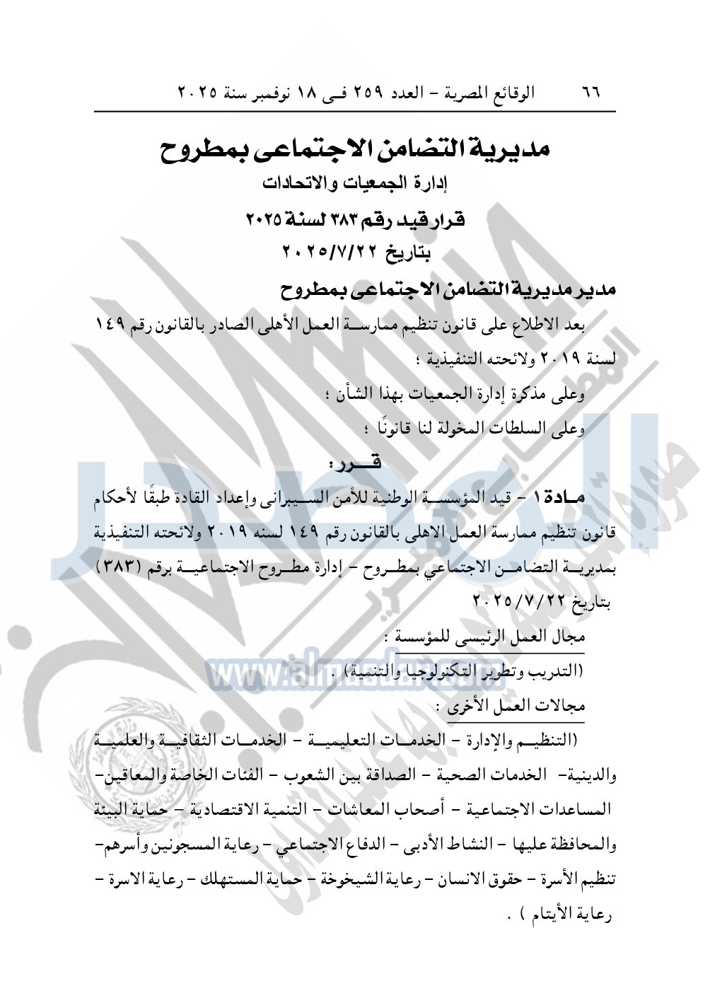 كما نشرت الوقائع المصرية في العدد 259، بتاريخ 18 نوفمبر 2025، قرار مديرية التضامن الاجتماعي بسوهاج، قيد رقم 1853 لسنة 2025، بشأن قيد مؤسسة سند الخيرية للتنمية.