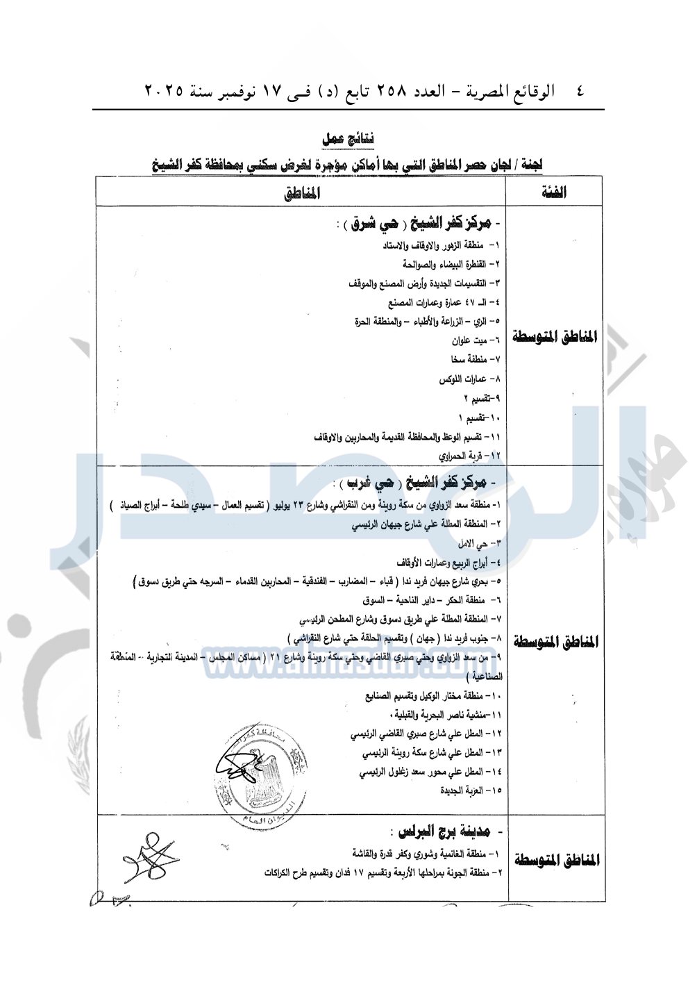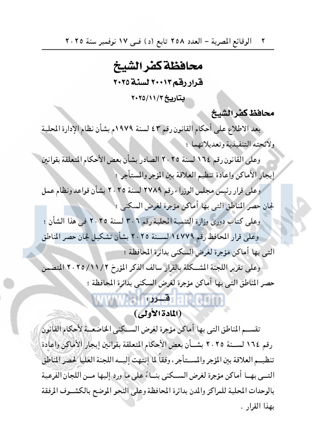 نشرت الوقائع المصرية في العدد 258 تابع "د" الصادر في 17 نوفمبر سنة 2025، محافظة كفر الشيخ قرار رقم 20013 لسنة 2025 بتاريخ 3-11-2025، بشأن تقسيم المناطق التي بها أماكن مؤجرة لغرض السكني بمحافظة كفر الشيخ.