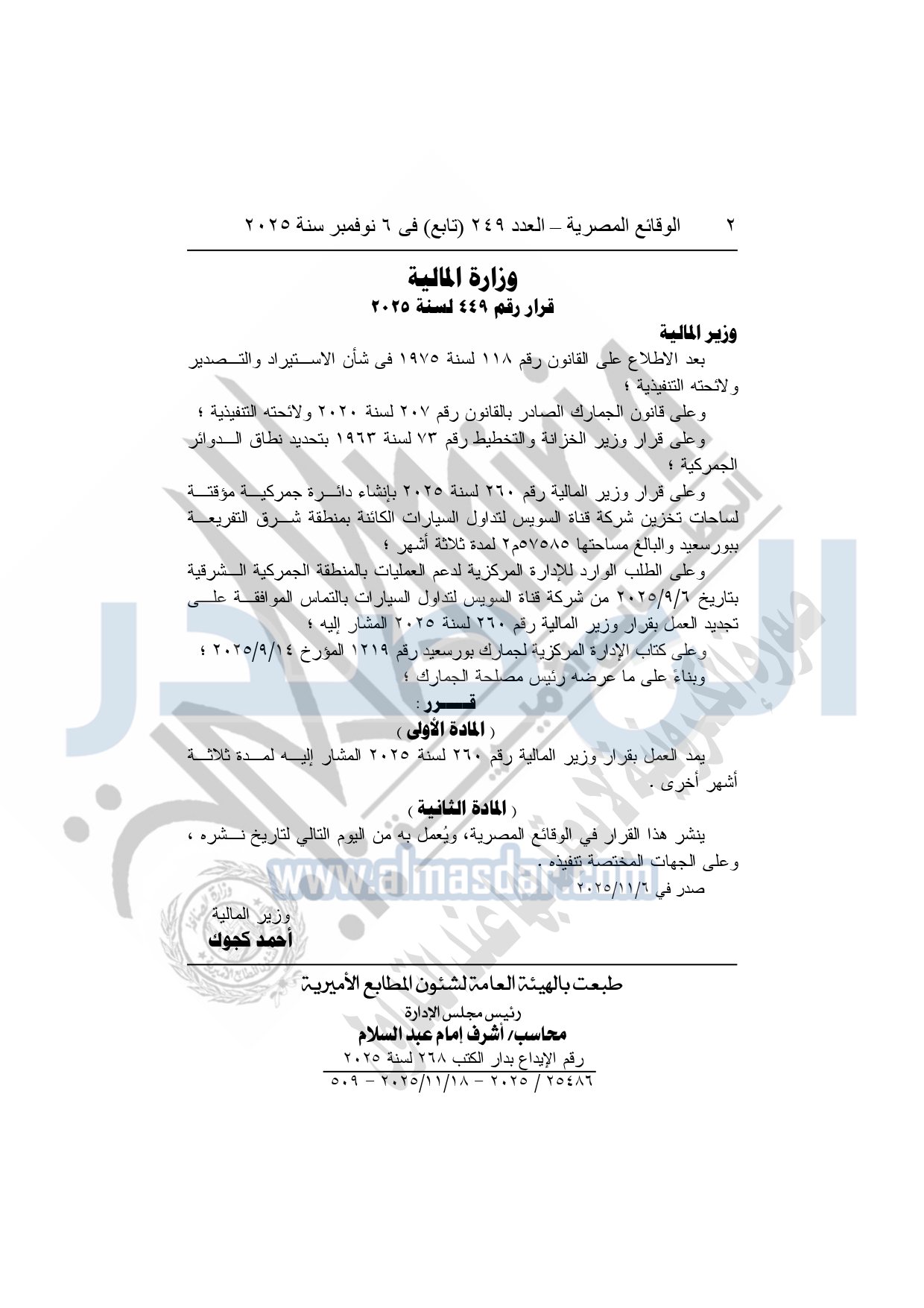 وعلى قرار وزير المالية رقم 260 لسنة 2025 بإنشاء دائرة جمركية مؤقتة لساحات تخزين شركة قناة السويس لتداول السيارات الكائنة بمنطقة شرق التفريعة ببورسعيد والبالغ مساحتها 57585 م2 لمدة ثلاثة شهور.