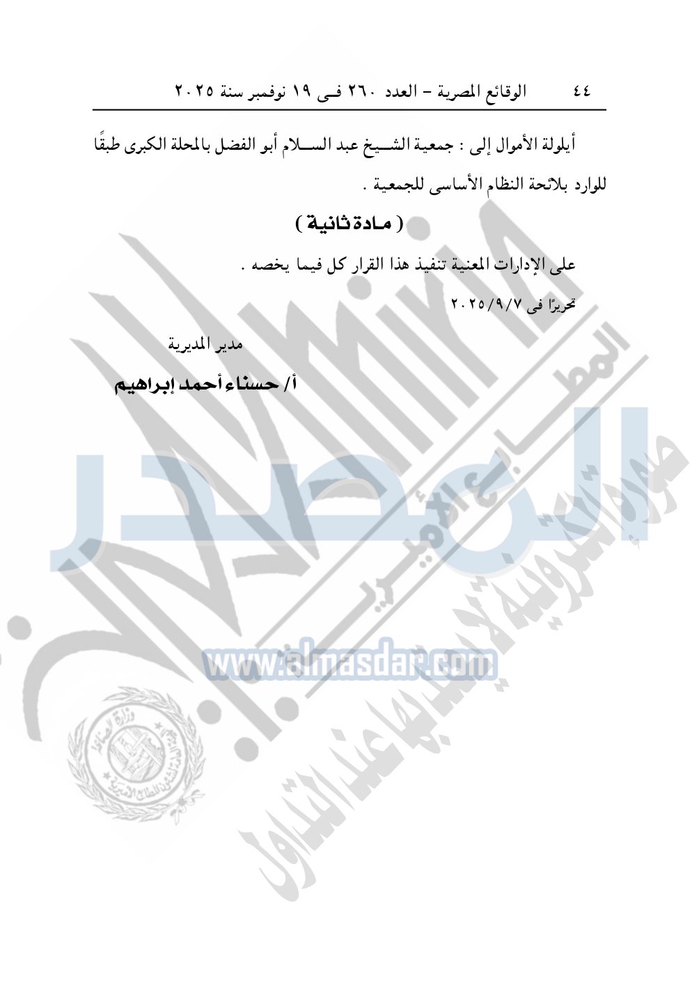 أيلولة الأموال إلى: جمعية الشيخ عبد السلام أبو الفضل بالمحلة الكبرى طبقًا للوارد بلائحة النظام الأساسي للجمعية.