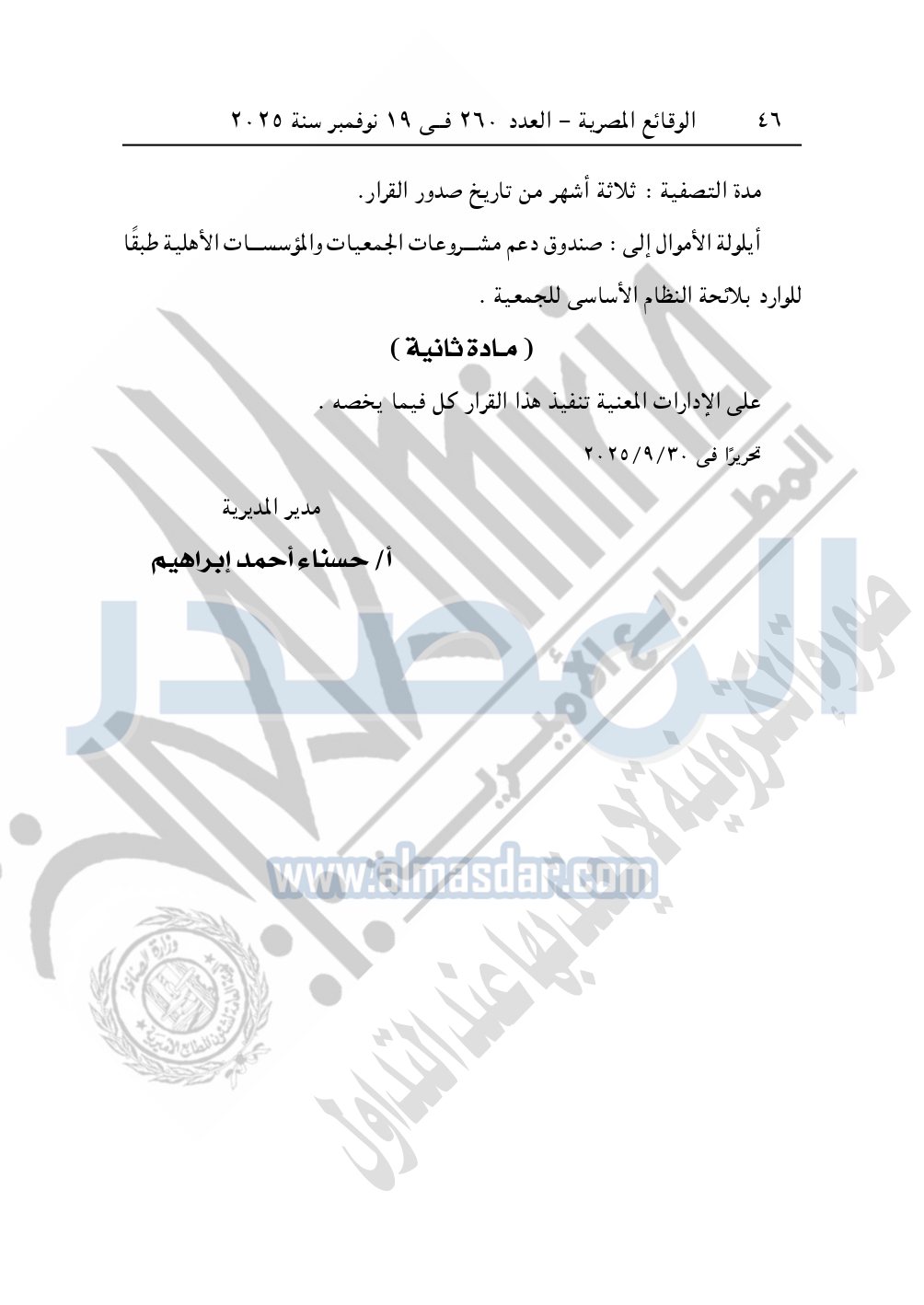 كما نشرت الوقائع المصرية في العدد 260، بتاريخ 19 نوفمبر 2025، قرار مديرية التضامن الاجتماعي بالغربية، الخاص بحل جمعية رعاية المرضى الخيرية بالعثمانية - مركز المحلة الكبرى - محافظة الغربية المشهرة برقم 2083 لسنة 2017 "حلا اختياريا".