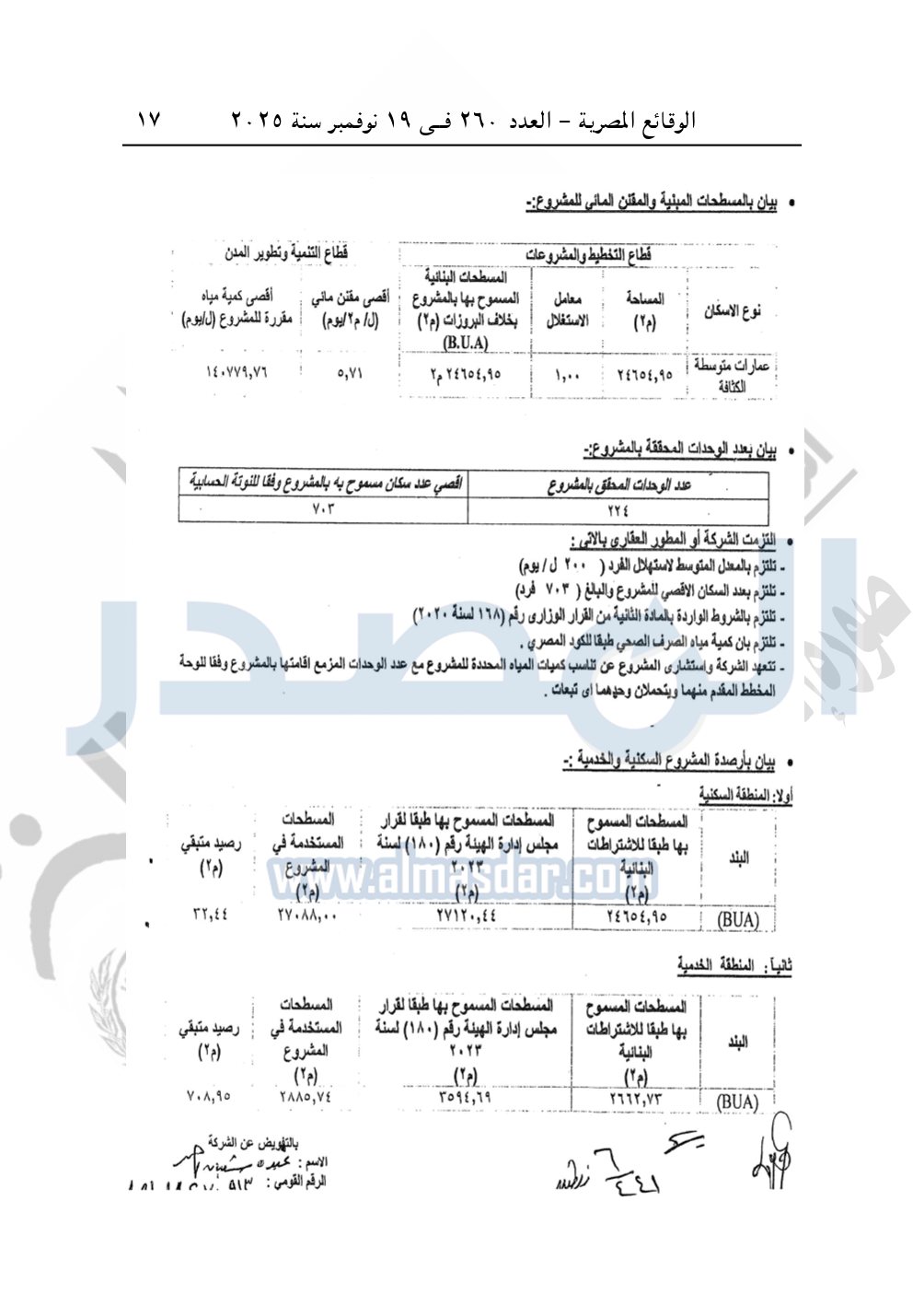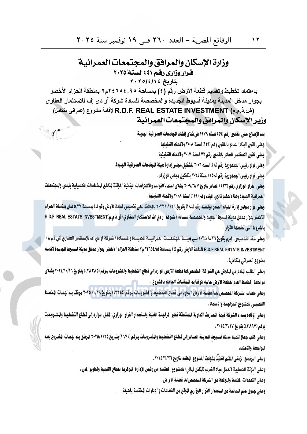نشرت الوقائع المصرية في العدد 260، بتاريخ 19 نوفمبر 2025، قرار وزارة الإسكان والمرافق والمجتمعات العمرانية، قرار رقم 441 لسنة 2025، بتاريخ 14-4-2025، بشأن اعتماد تخطيط وتقسيم قطعة أرض بمنطقة الحزام الأخضر بجوار مدخل المدينة بمدينة أسيوط الجديدة والمخصصة لـ شركة آر دي إف للاستثمار العقاري لإقامة مشروع "عمراني متكامل".