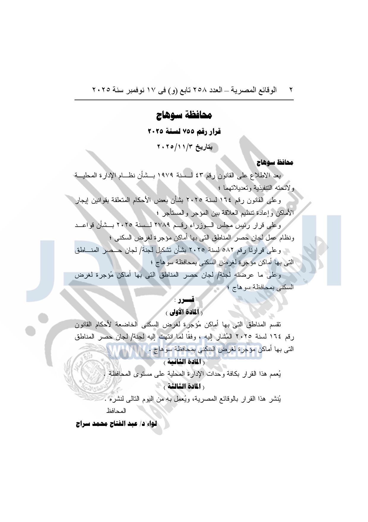نشرت الوقائع المصرية في العدد 258 تابع "و" الصادر في 17 نوفمبر سنة 2025، قرار محافظة سوهاج، رقم 755 لسنة 2025 بتاريخ 3-11-2025، بشأن تقسيم المناطق التي بها أماكن مؤجرة لغرض السكني بمحافظة سوهاج.