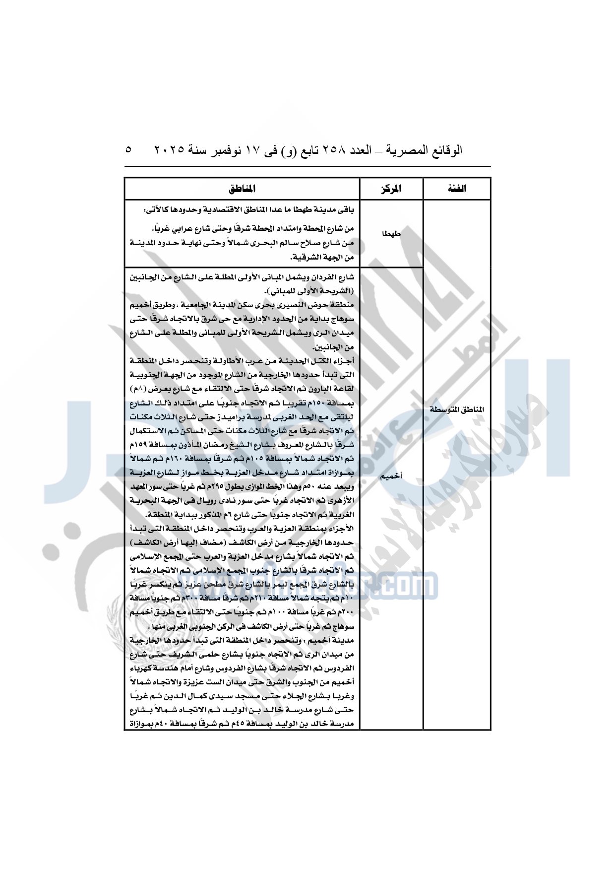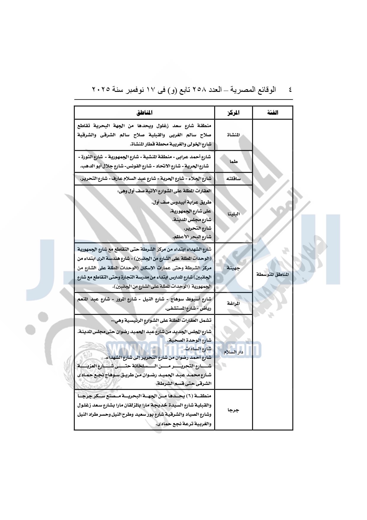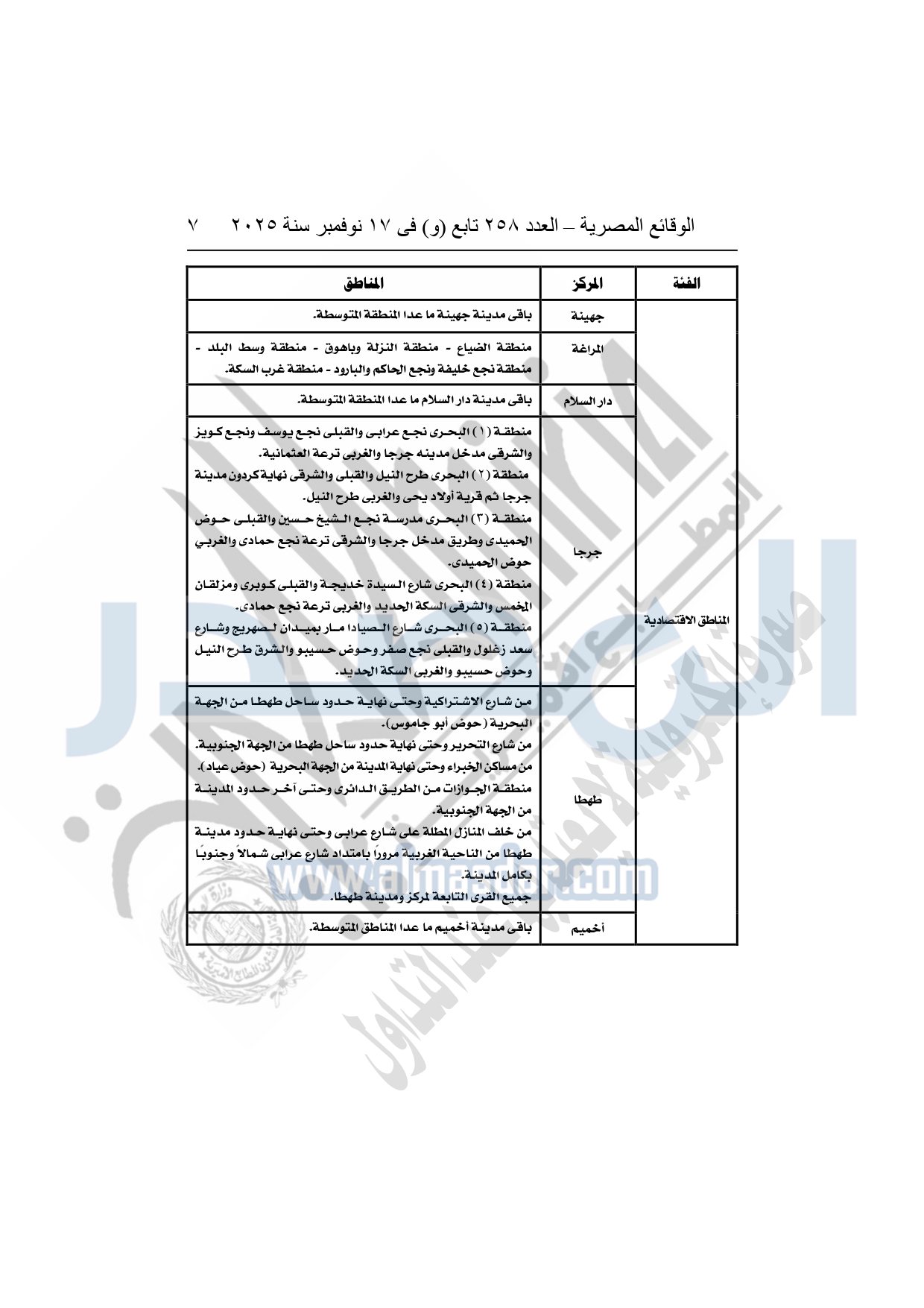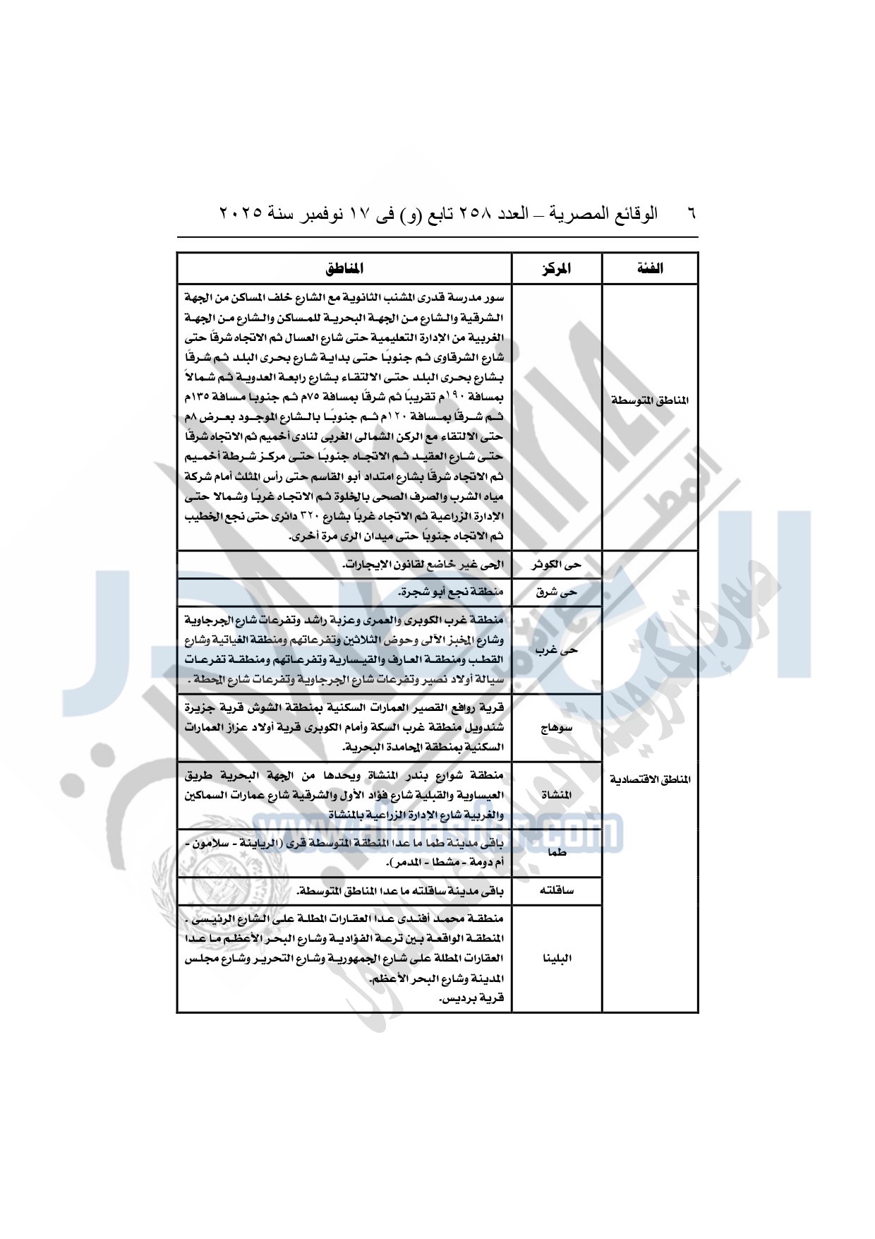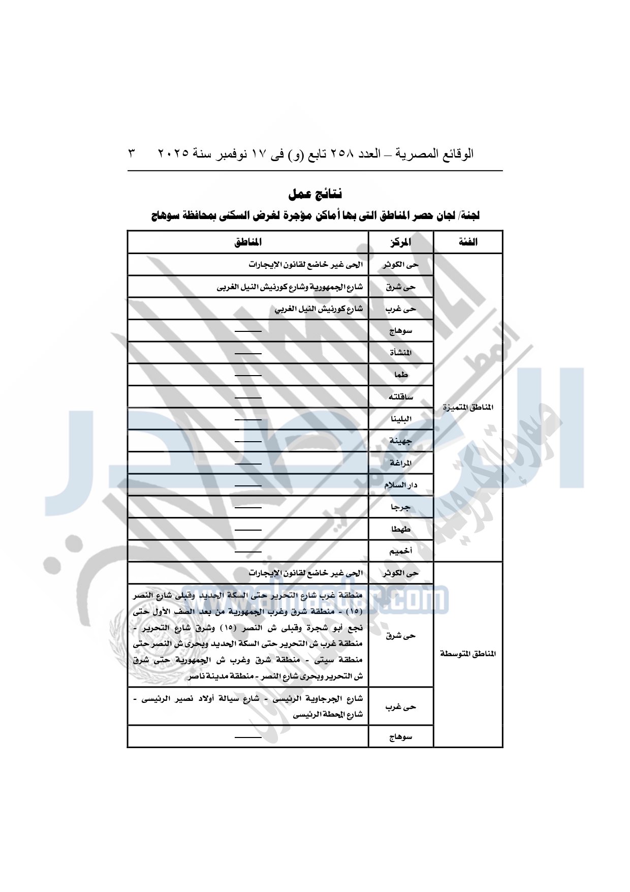 تقسم المناطق التي بها أماكن مؤجرة لغرض السكني الخاضعة لأحكام القانون رقم 164 لسنة 2025 المشار إليه، وفقا لما انتهت إليه لجنة / لجان حصر المناطق التي بها أماكن مؤجرة لغرض السكني بمحافظة سوهاج.